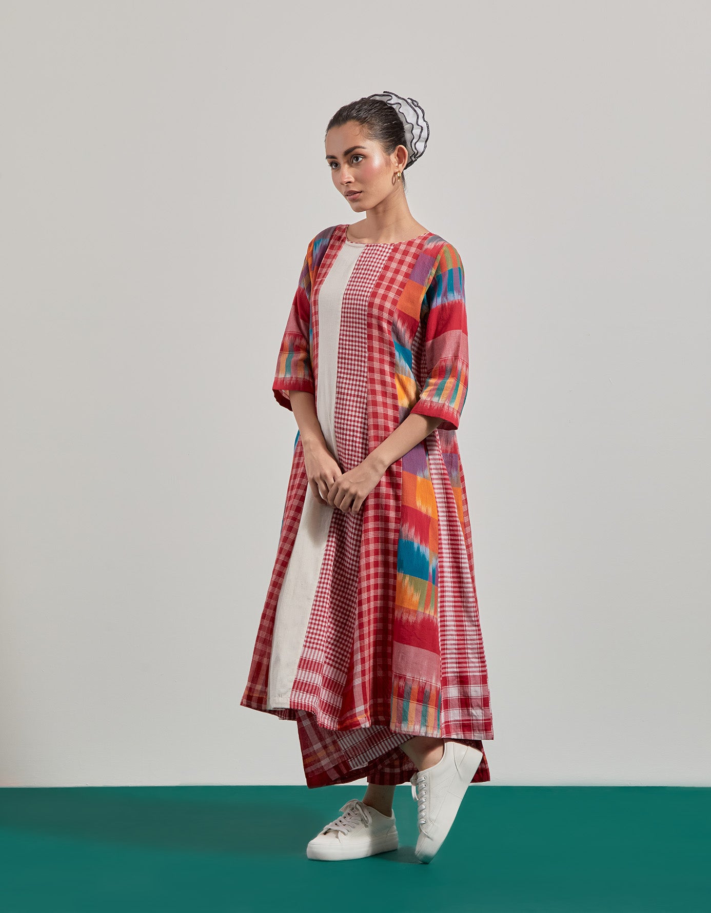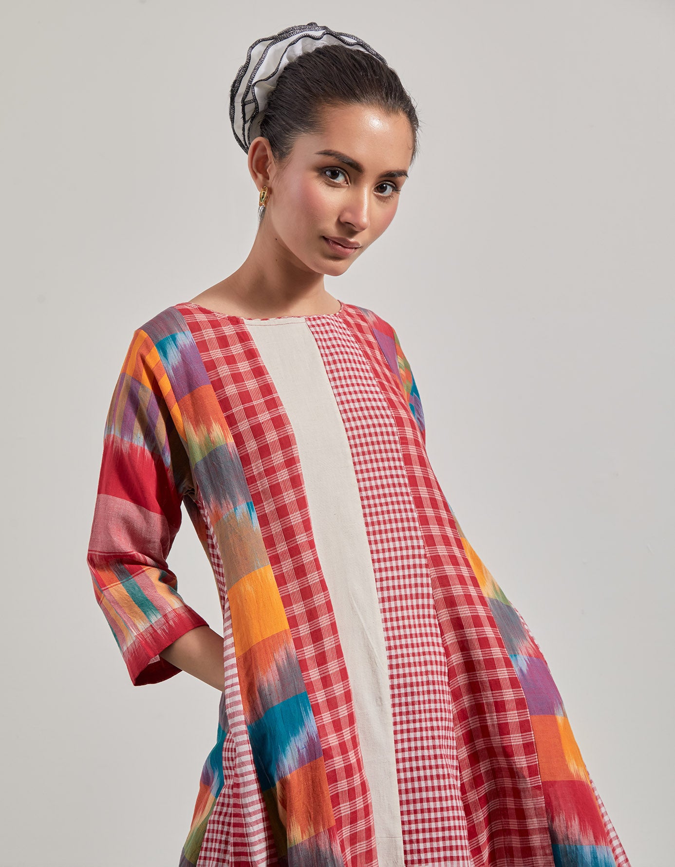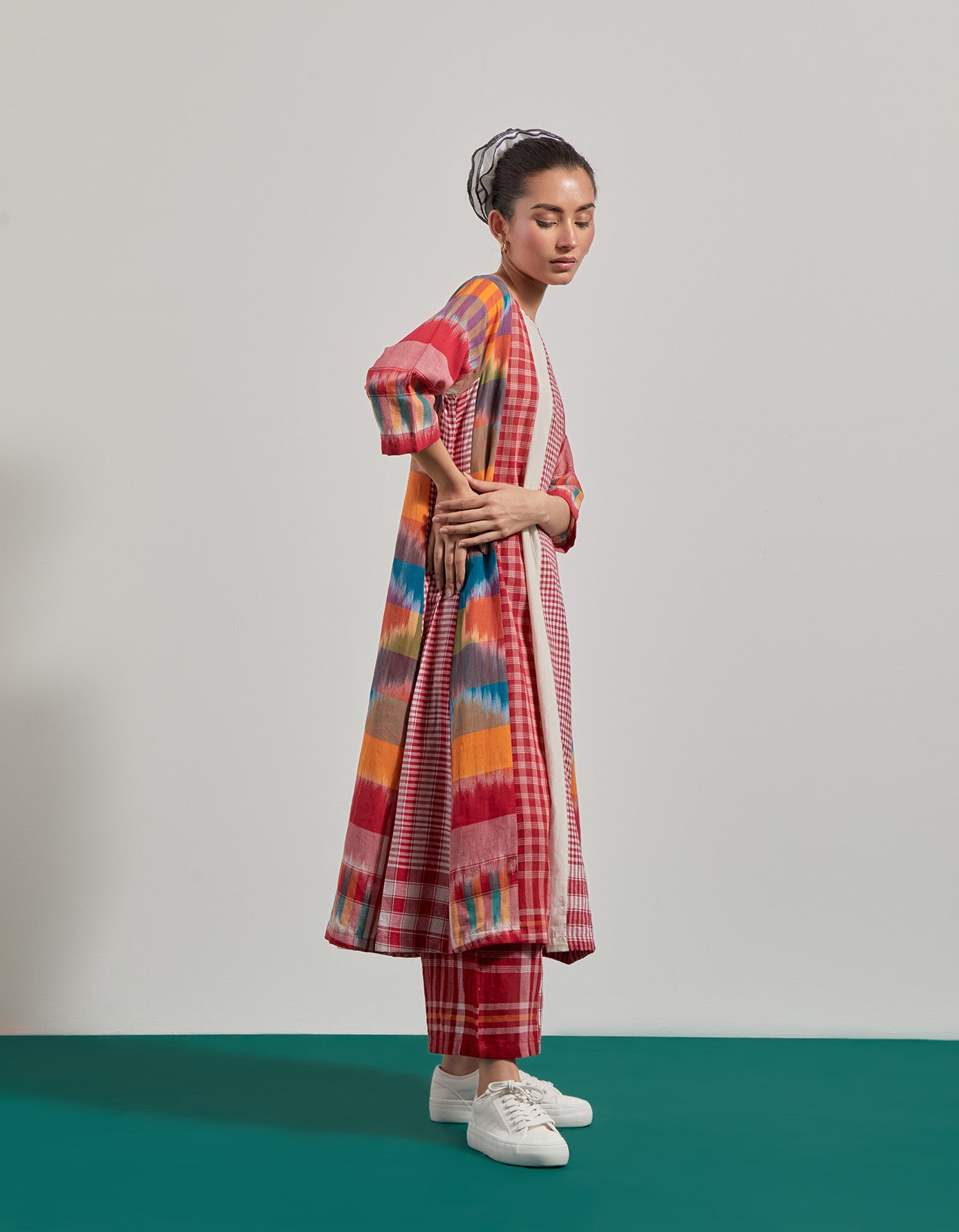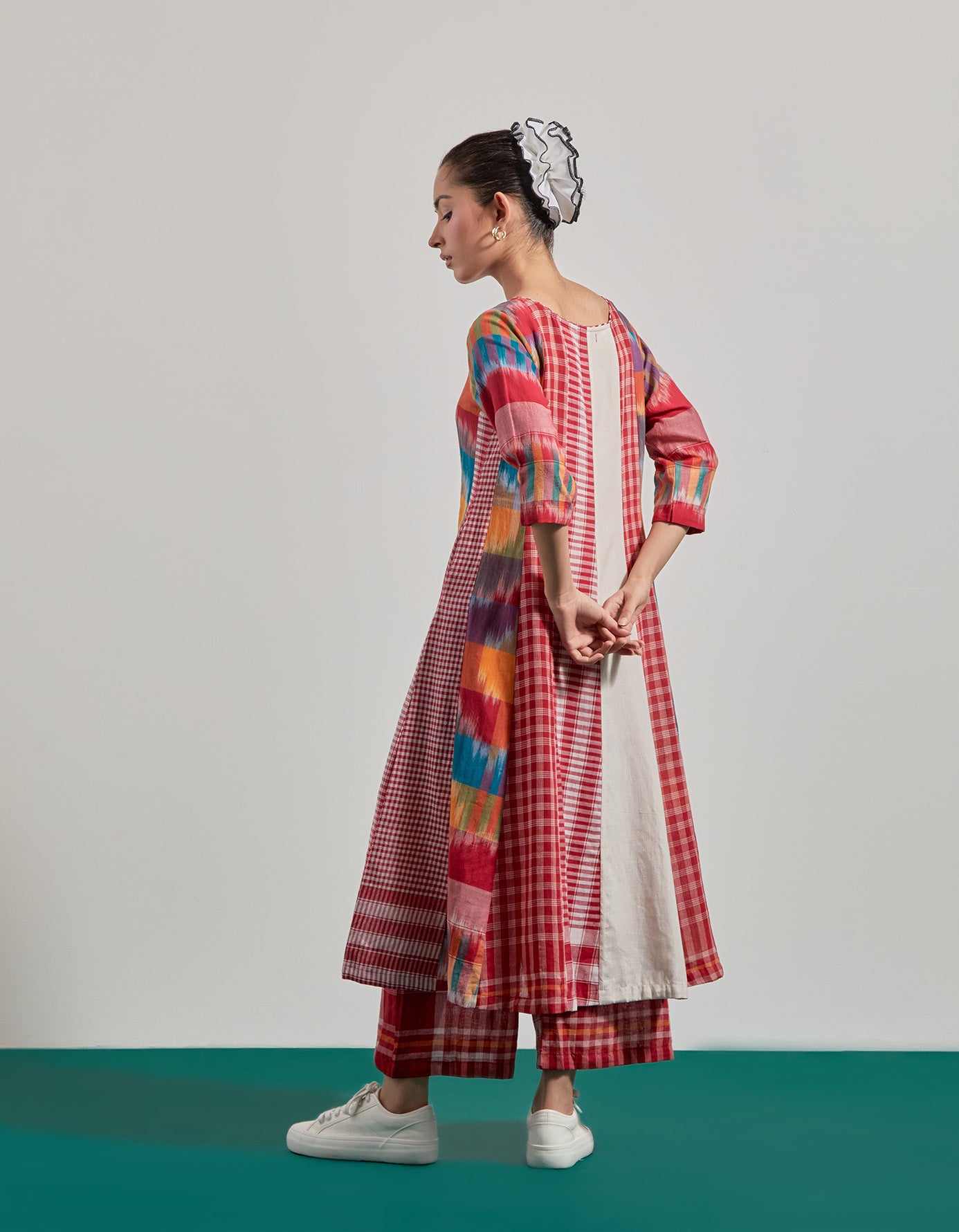 Unleash a masterpiece in this 16 Panelled Twirly Kotki Dress and Classic Red Palazzo Set. Each piece can be worn separately or together for a truly versatile and sophisticated look. The dress's 16 panels of gamcha elevate its elegant design, while the palazzo's elastic belt and drawstring provide maximum comfort. Two pockets on either side add a practical touch to this exclusive set.