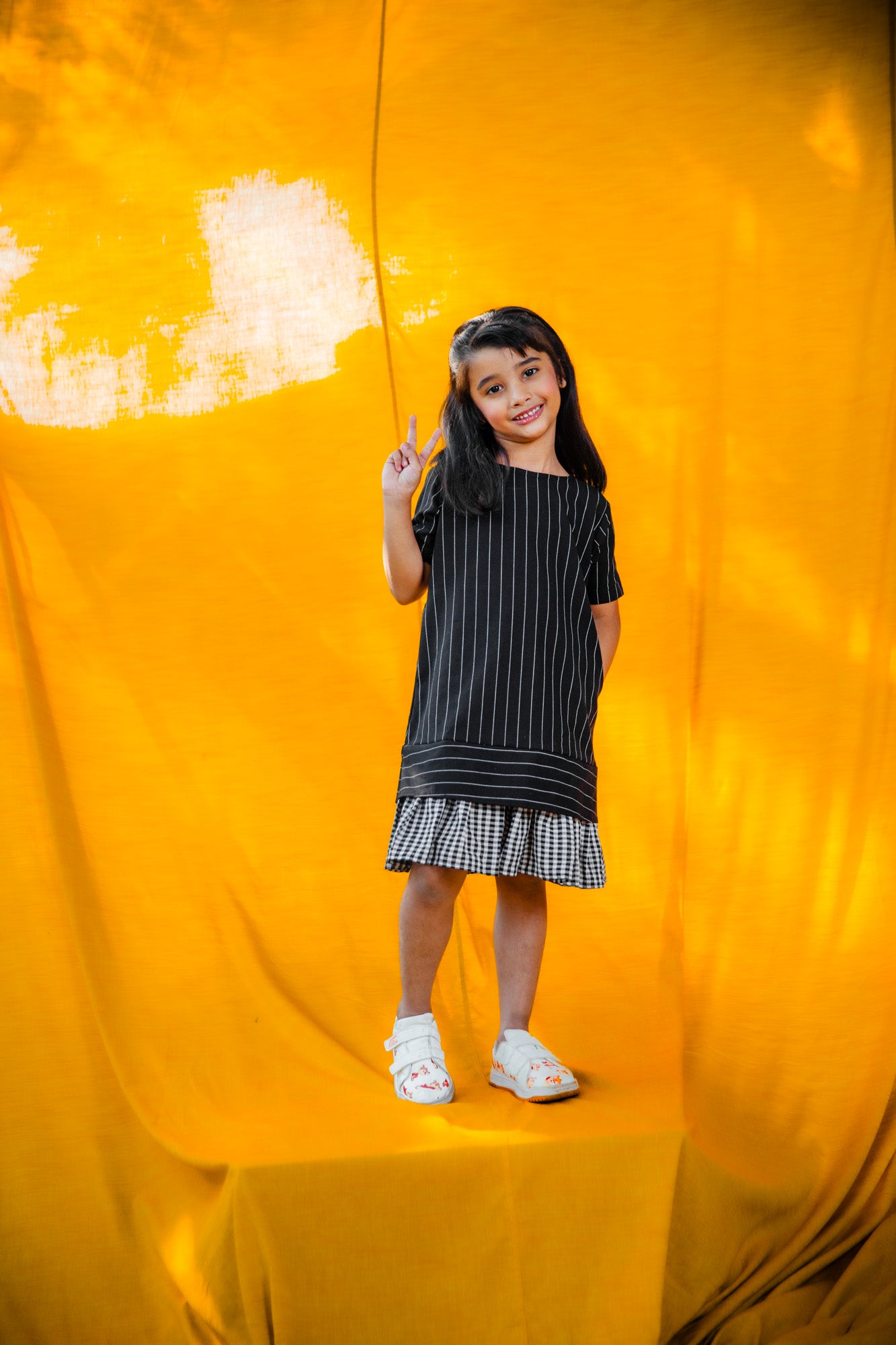 Ashline Straight Frill Dress combines two classic black prints—striped and gingham cotton—for visual interest and versatility. Crafted from 100% pure cotton, this half-sleeved dress offers comfort for active children. Practical side pockets provide convenient storage, while delicate frills at the hemline add a charming, playful touch. The thoughtful design balances style with functionality, making it an ideal everyday piece for your child's wardrobe.
