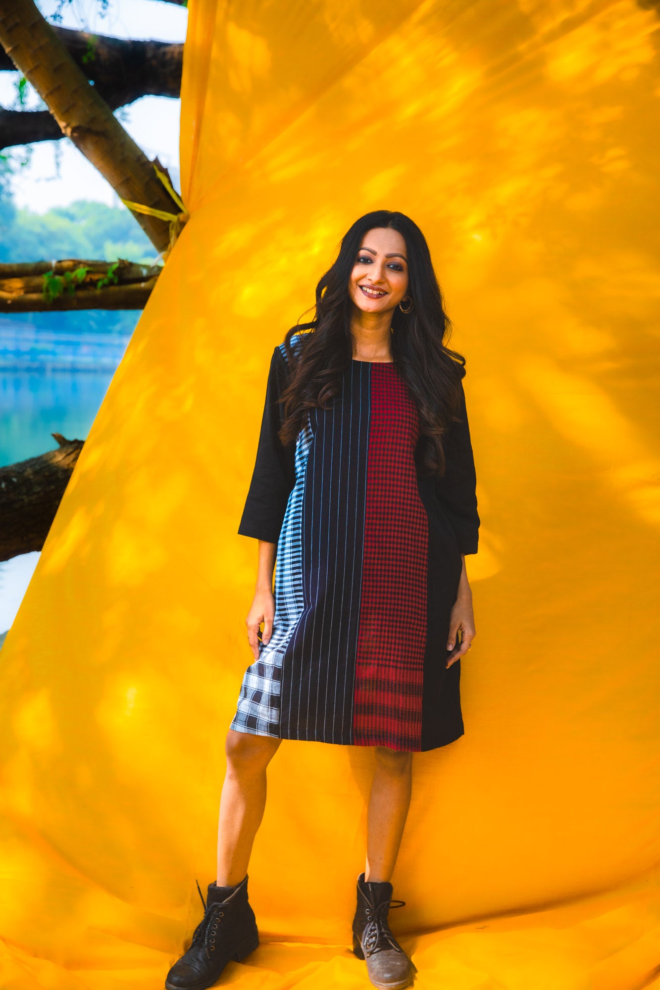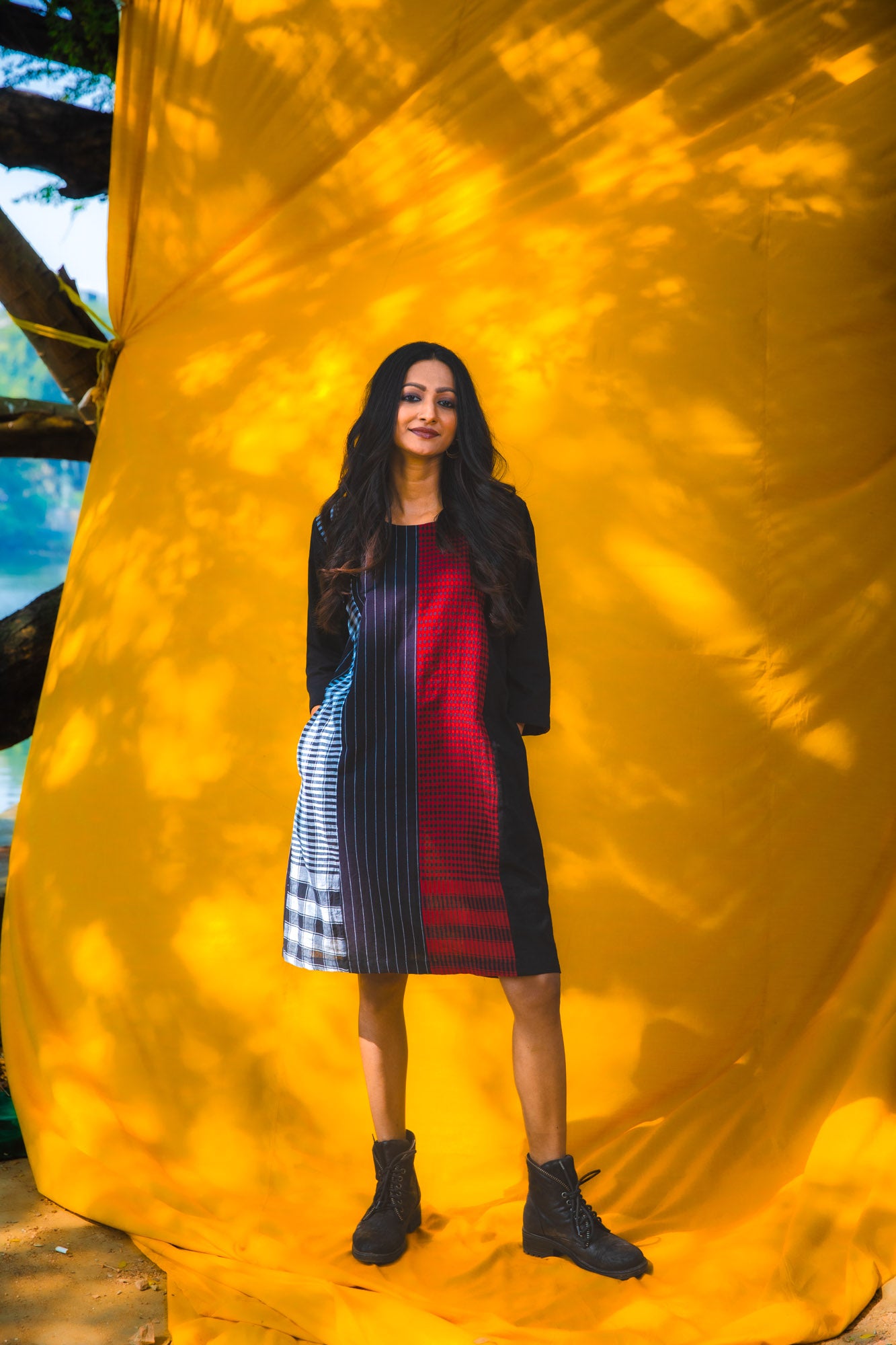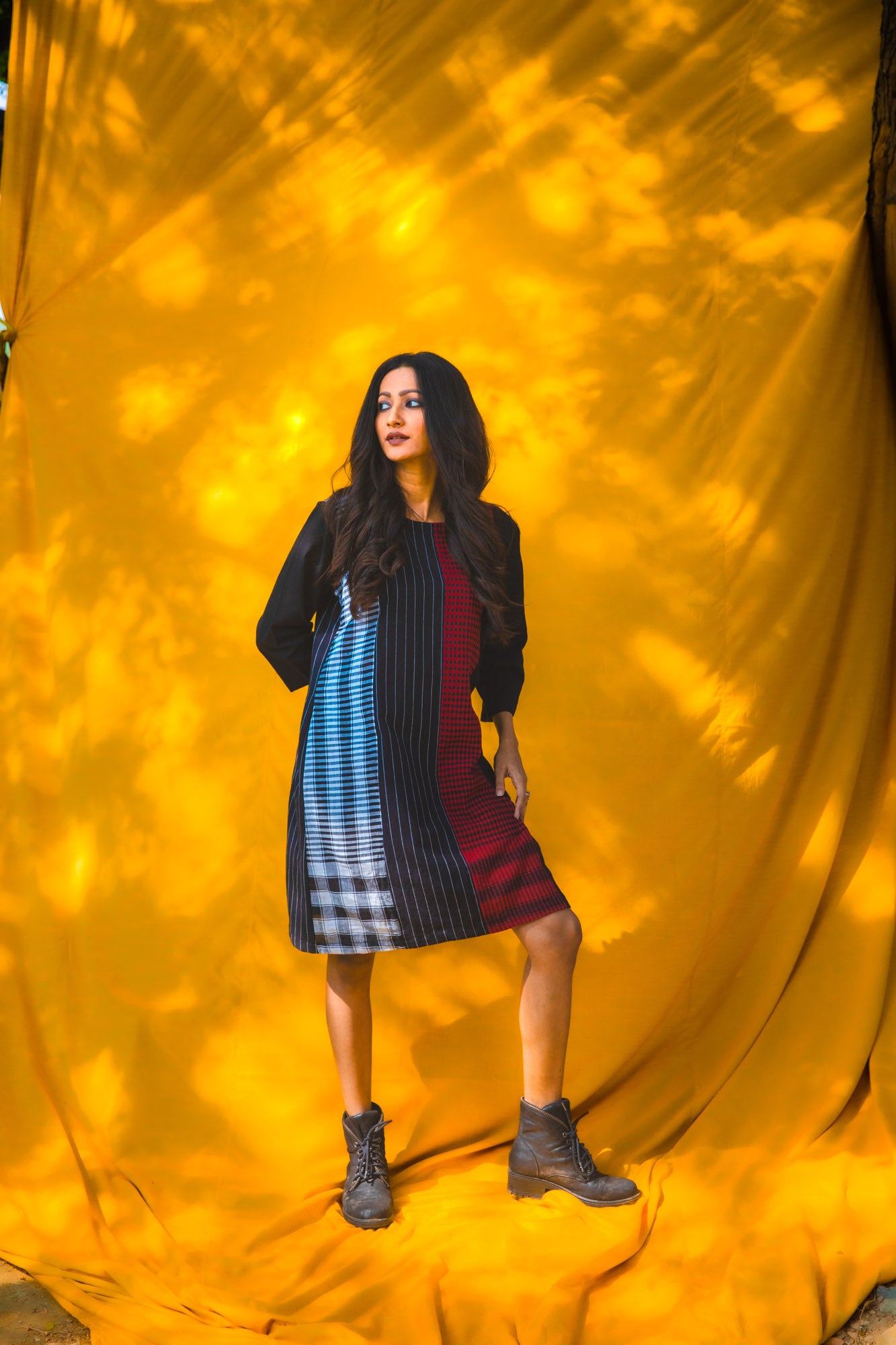The Black Dandelion Dress combines contemporary design with everyday practicality. Crafted from 100% cotton, this piece features a distinctive four-panel construction front and back that creates a flattering silhouette. At 38 inches in length, it hits at an ideal midi proportion, while three-quarter sleeves offer versatile layering options. Functional side pockets add utility without compromising style. The thoughtful construction delivers an effortless wear experience, balancing edgy sophistication with approachable elegance—a dress that transitions seamlessly from casual to curated occasions.
