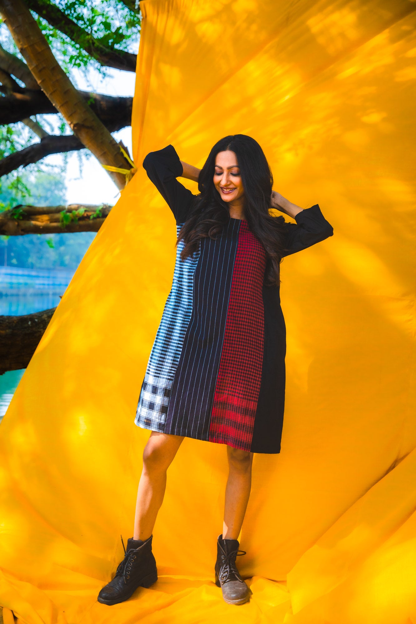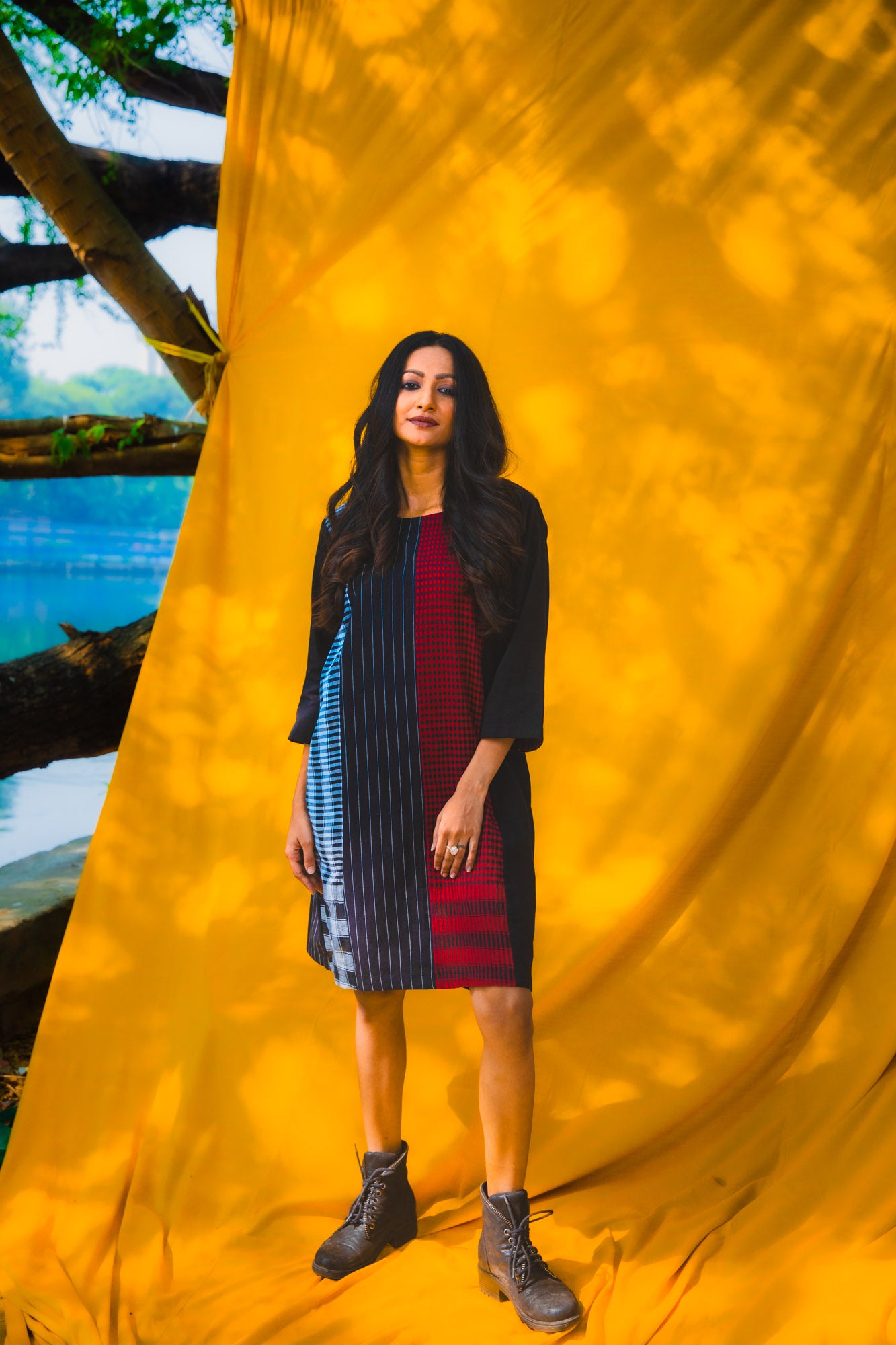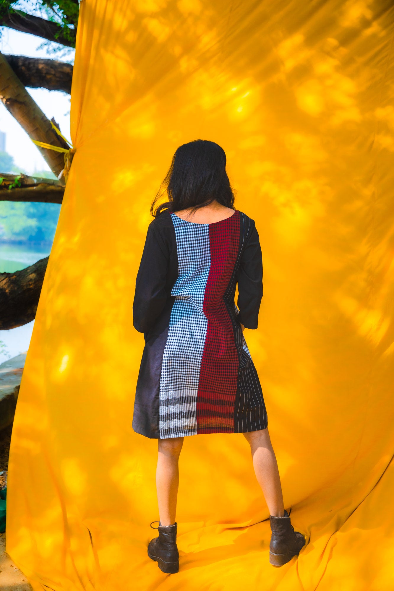 The Black Dandelion Dress combines contemporary design with everyday practicality. Crafted from 100% cotton, this piece features a distinctive four-panel construction front and back that creates a flattering silhouette. At 38 inches in length, it hits at an ideal midi proportion, while three-quarter sleeves offer versatile layering options. Functional side pockets add utility without compromising style. The thoughtful construction delivers an effortless wear experience, balancing edgy sophistication with approachable elegance—a dress that transitions seamlessly from casual to curated occasions.