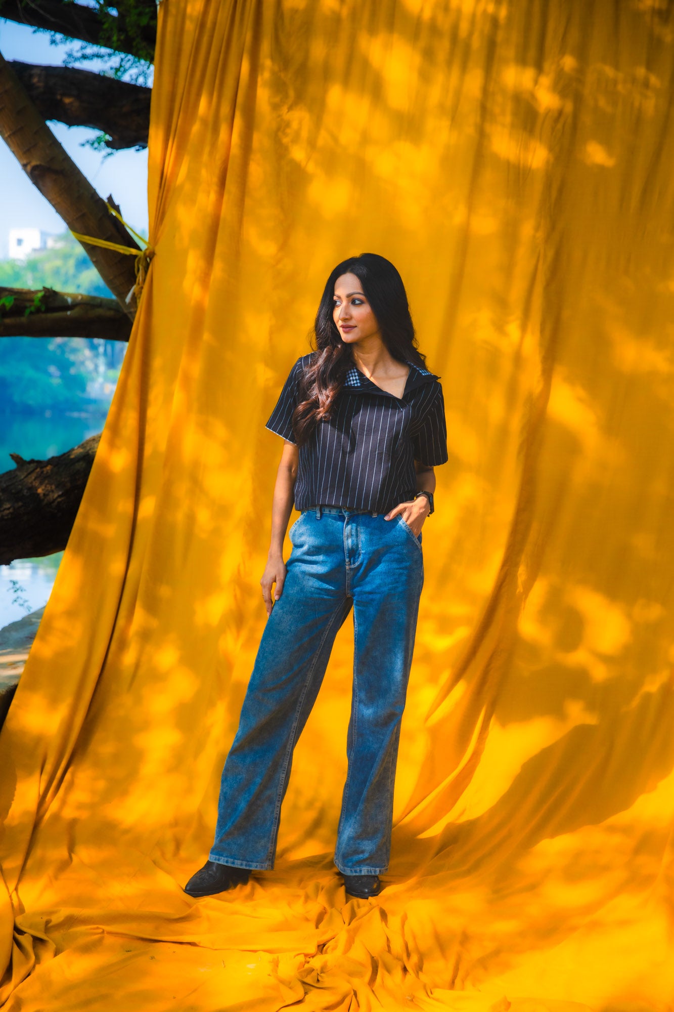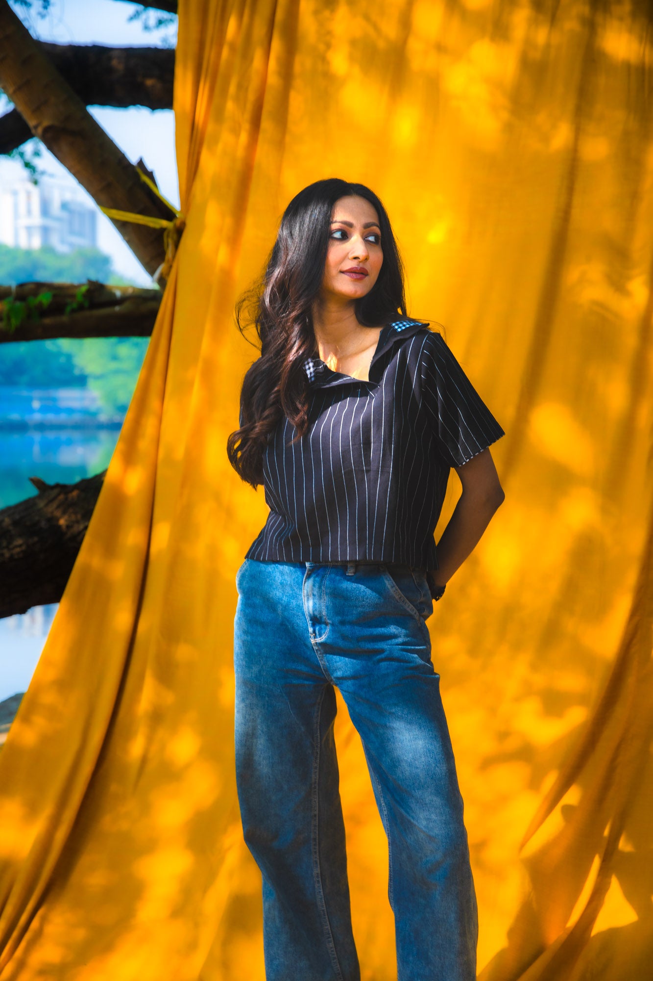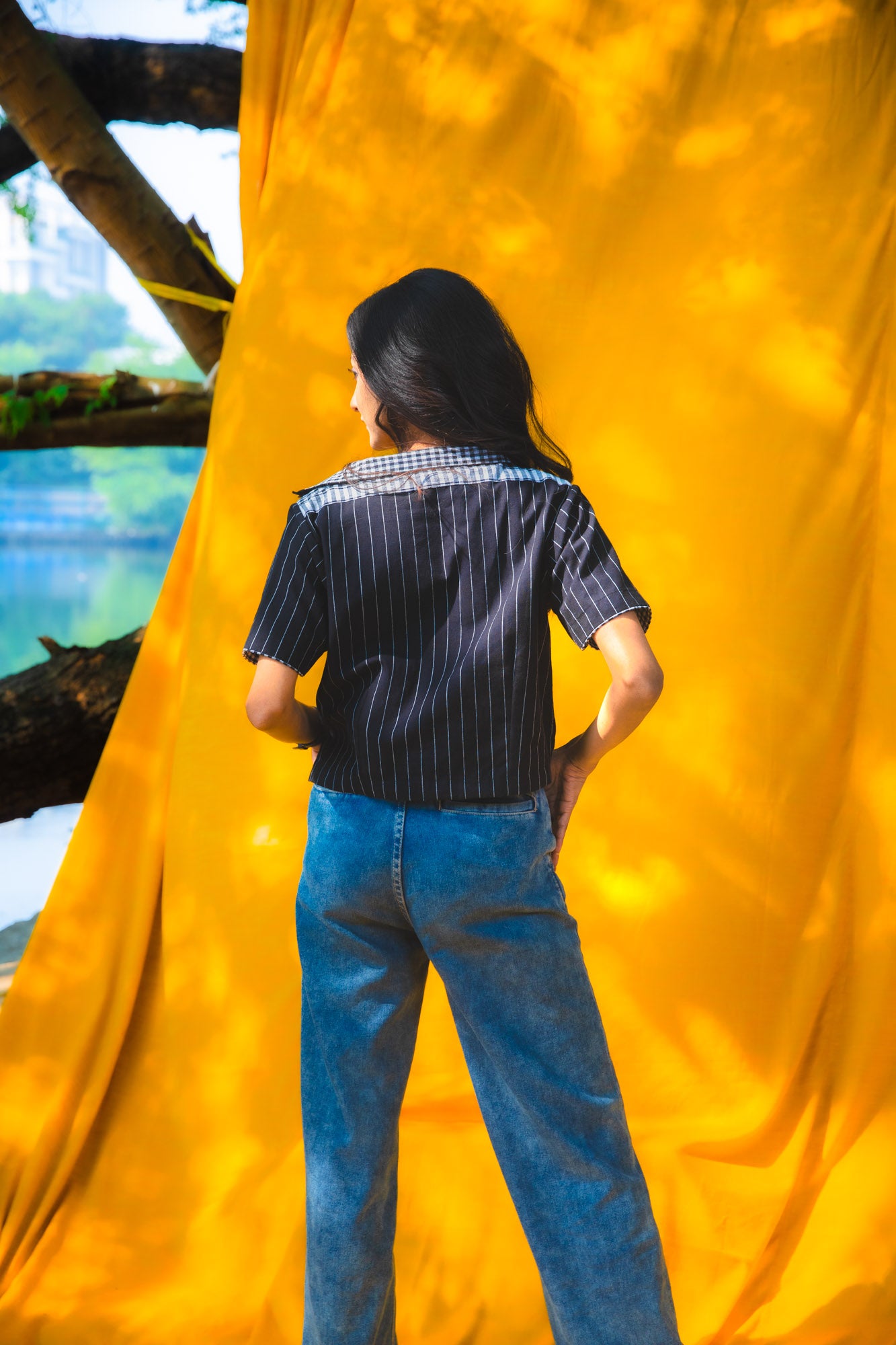 The Black Striped Boxi Top combines versatile styling with everyday comfort. Crafted from 100% cotton, this half-sleeve piece features a distinctive neckline that transitions effortlessly—button it up for a polished blouse or flatten it for a relaxed crop top aesthetic. The adaptable design works equally well layered over basics or worn standalone, making it a practical addition to any wardrobe. Soft, breathable fabric ensures all-day wearability without compromise.