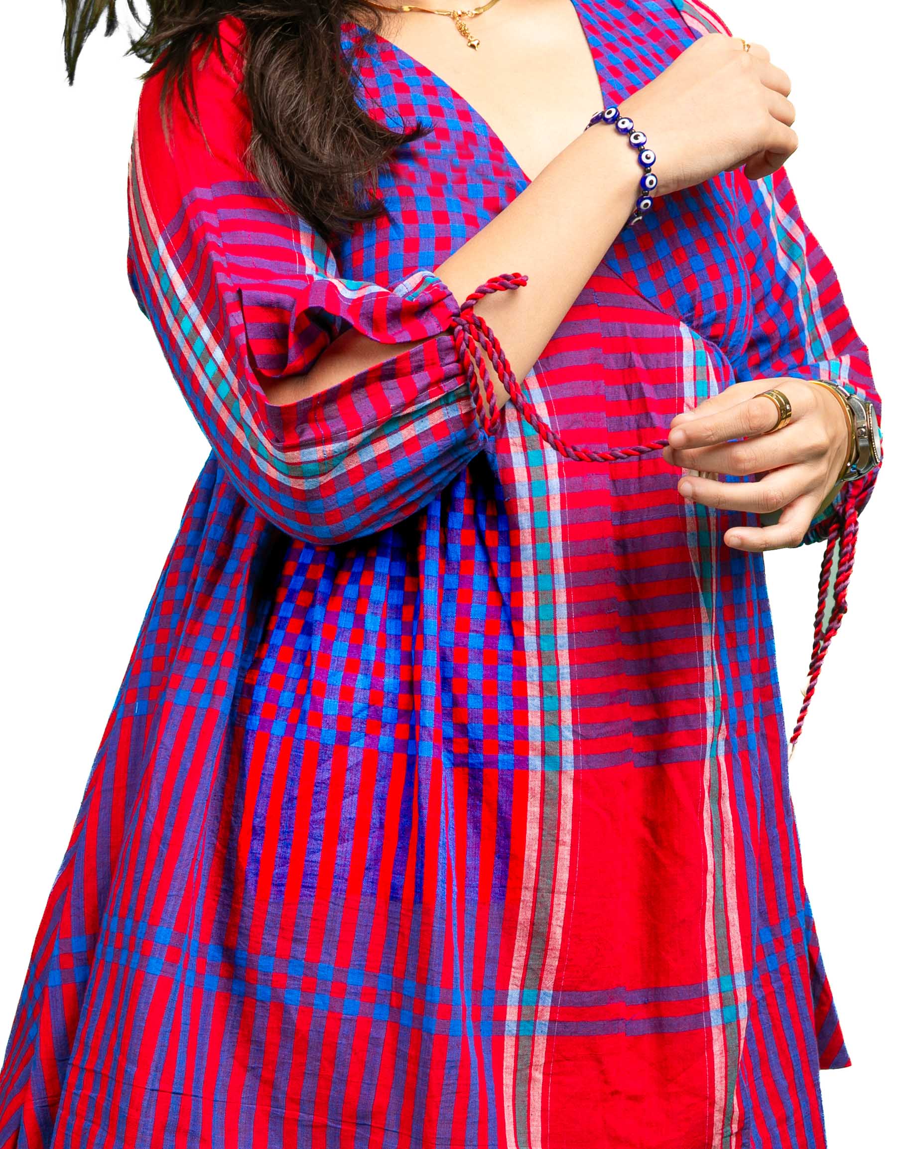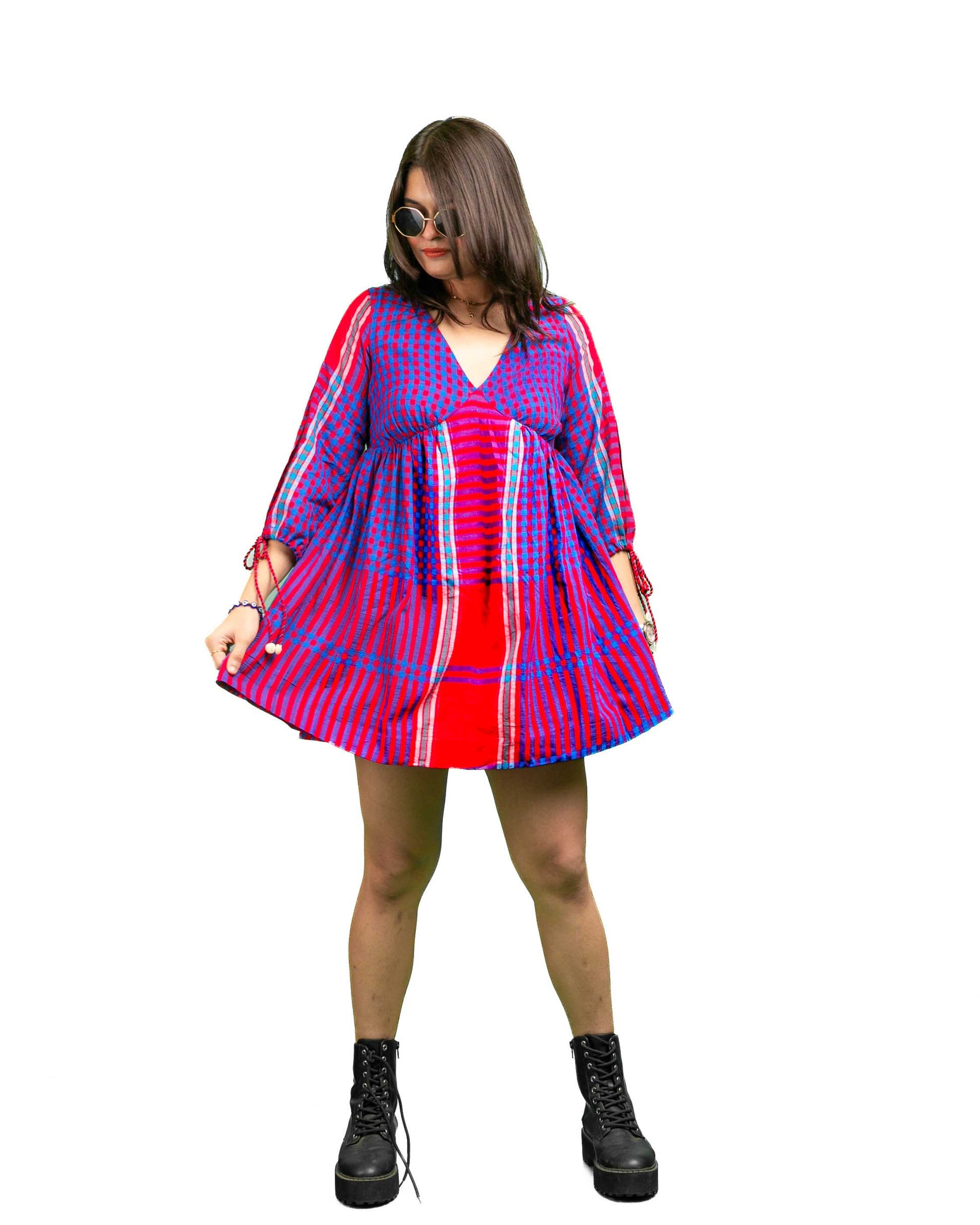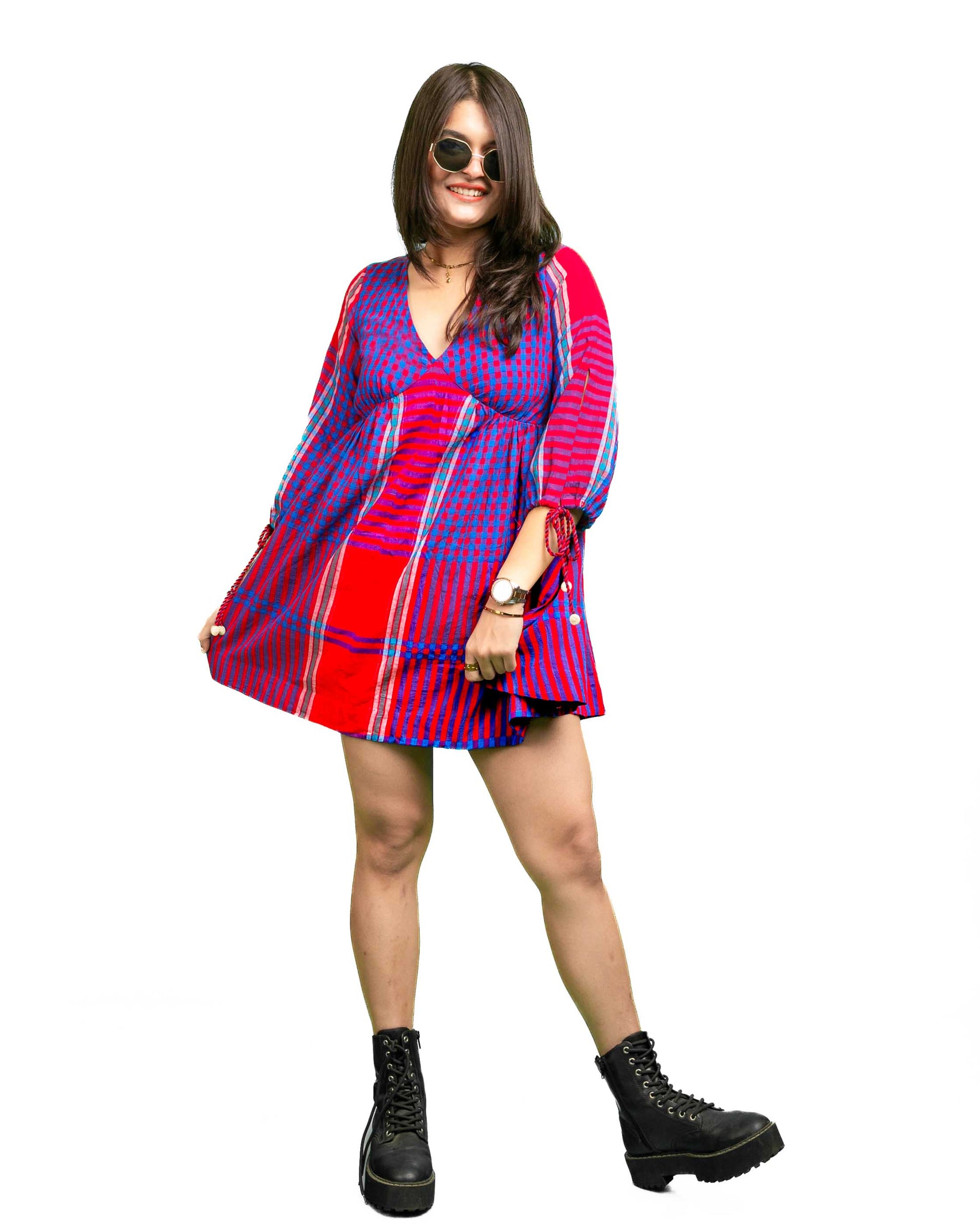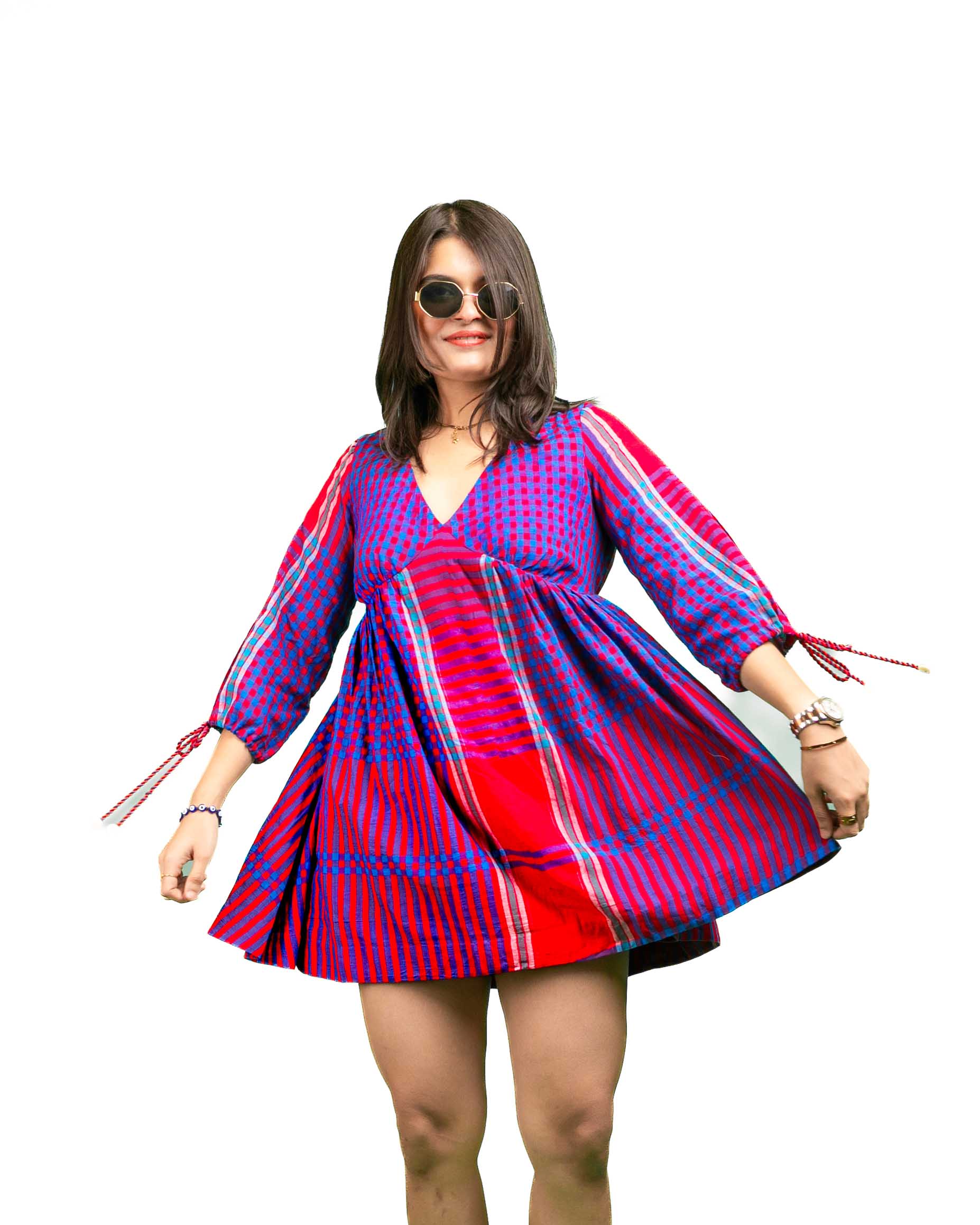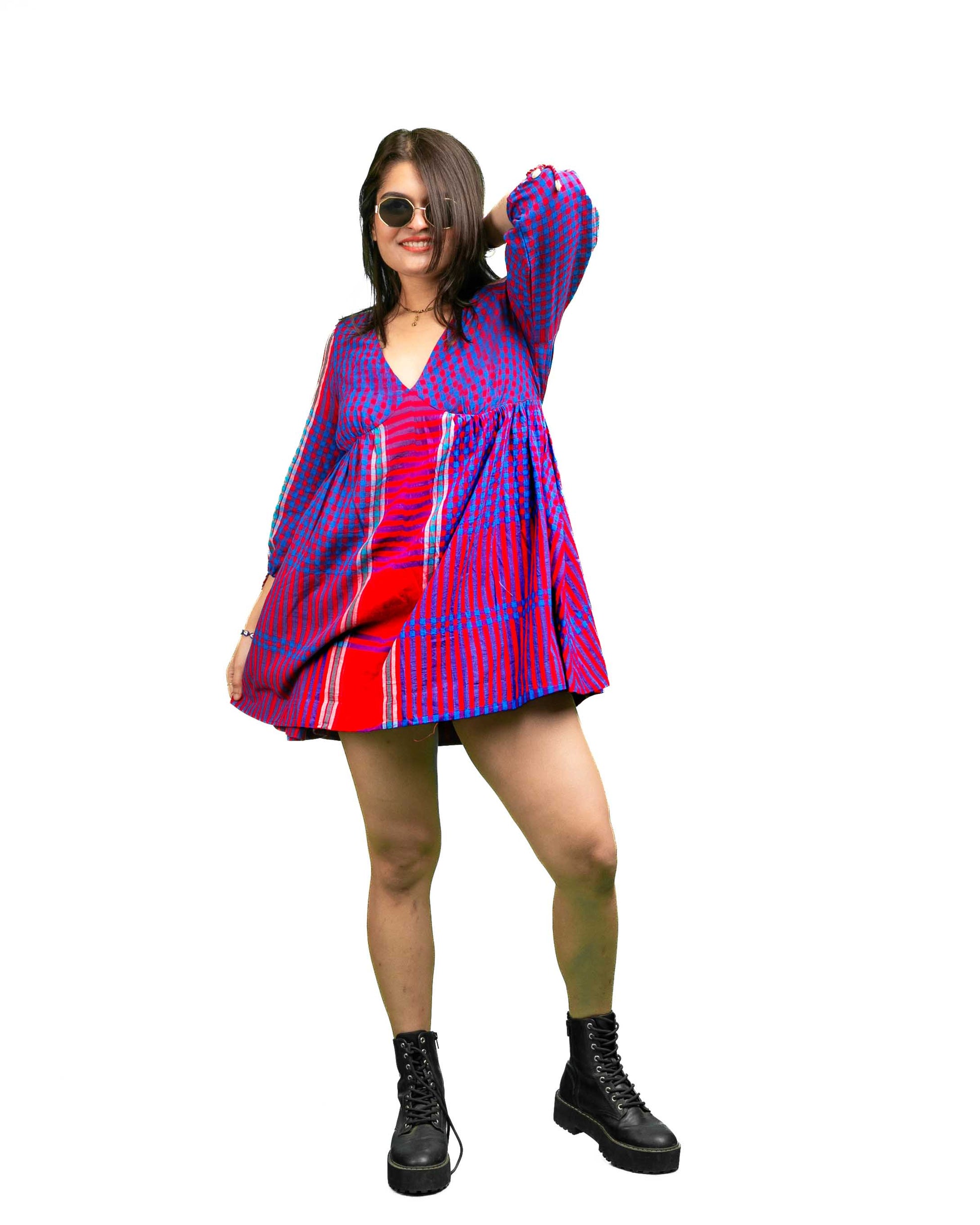 The Bora Bora Dress features a charming flair silhouette with relaxed balloon sleeves finished with adjustable drawstrings, offering both style and comfort. Its flattering V-neck design and 33-inch length make it an ideal choice for a fun day out or your next beach holiday, combining effortless elegance with breathable ease.