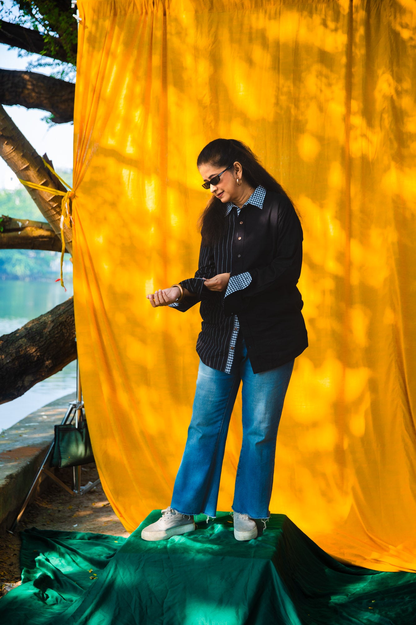 Introducing our Half Moon Boyfriend Shirt, a perfect blend of sophistication and style. Made with half and half stripes and plain black fabric, this 33-inch long shirt features 2 pockets and detailing with black gamcha. It can be worn as a shirt or styled as a jacket, making it a versatile addition to your wardrobe. Elevate your look with its full sleeves and cuff with button.