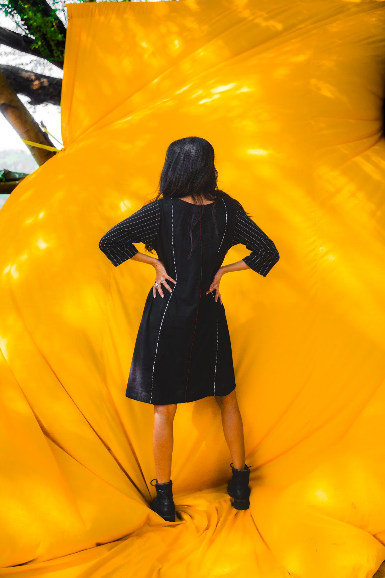The Noir Dress combines timeless elegance with practical comfort. Crafted from 100% breathable cotton, this striking piece features distinctive gingham piping on the front and back, complemented by striped cotton sleeves for visual interest. Functional side pockets add everyday practicality, while the 38-inch length offers versatile styling options. The thoughtful construction ensures all-day comfort without compromising on sophistication, making this dress an essential addition to any refined wardrobe.
