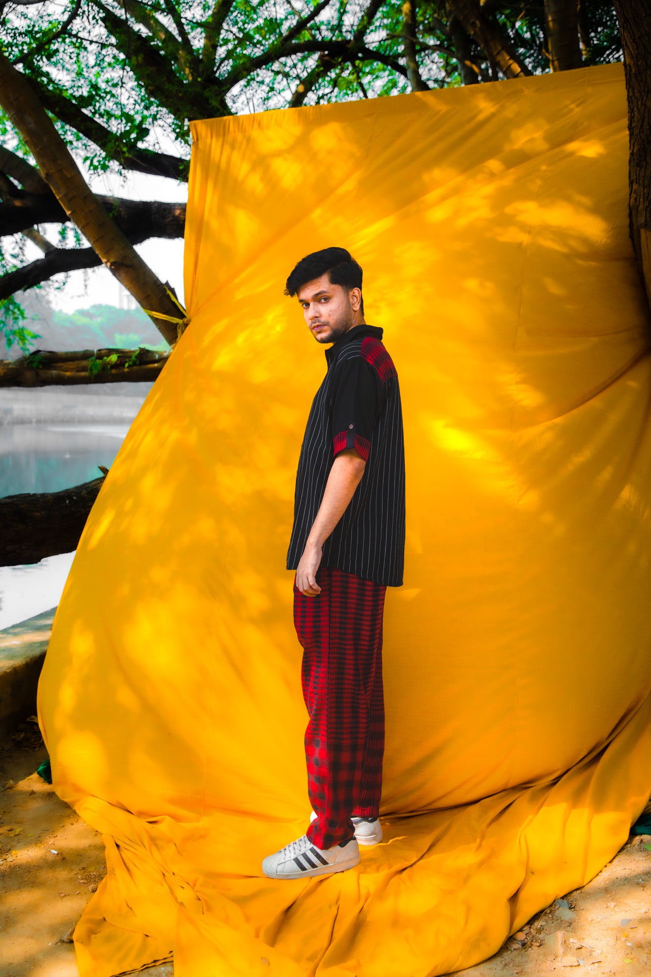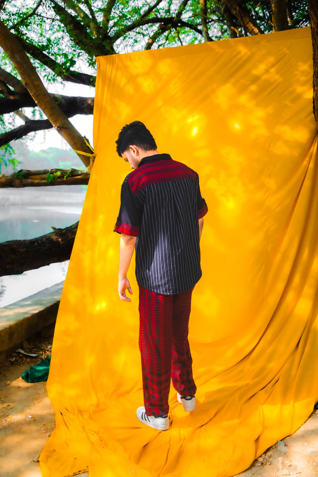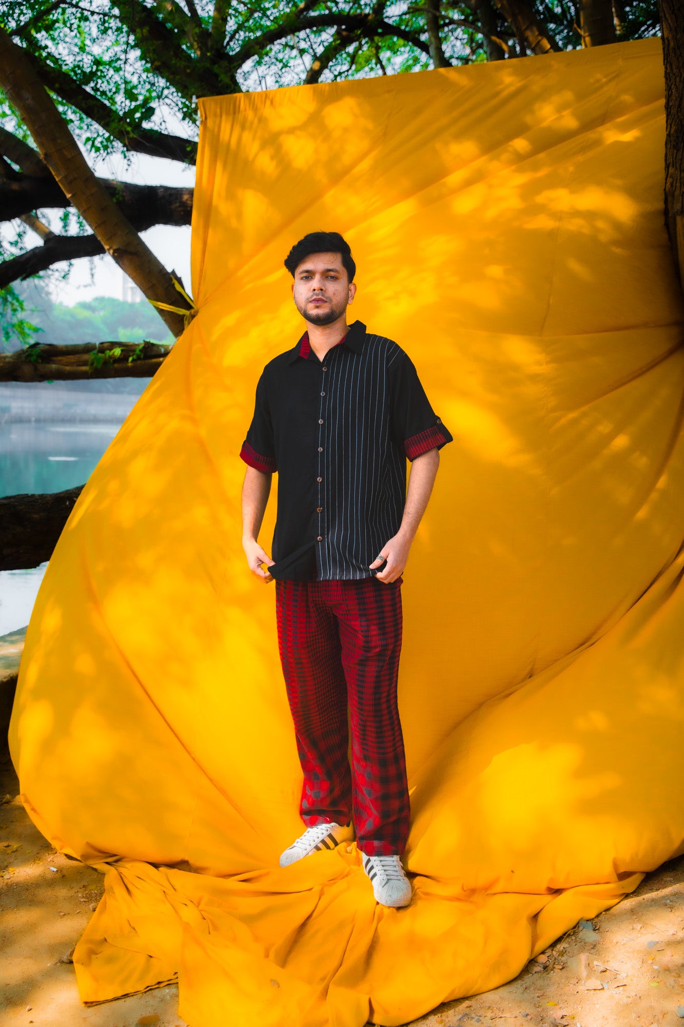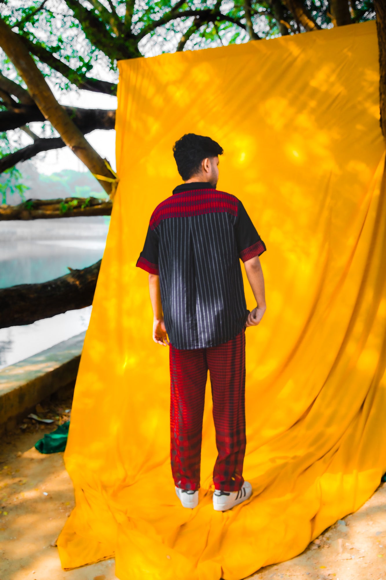 This versatile two-piece set combines contemporary design with everyday comfort. The shirt features a classic collar and half sleeves, crafted from three coordinated fabrics: solid black base, black striped accents, and maroon gingham detailing on the yoke for visual interest. The matching pants are constructed from 100% cotton gingham, offering breathability and durability. Practical side pockets and an adjustable elastic waistband with drawstring ensure a comfortable fit throughout the day. An ideal choice for those seeking quality construction and thoughtful fabric coordination in casual wear.