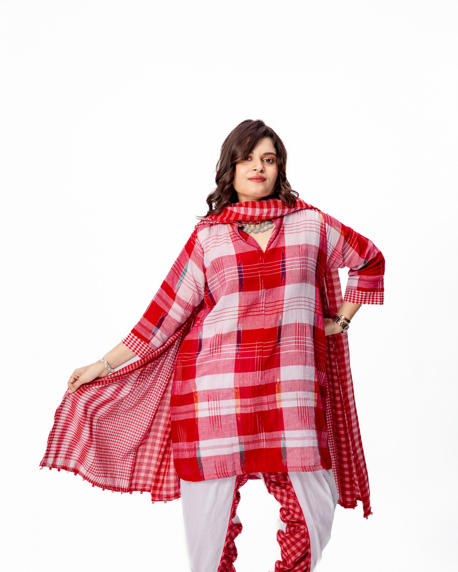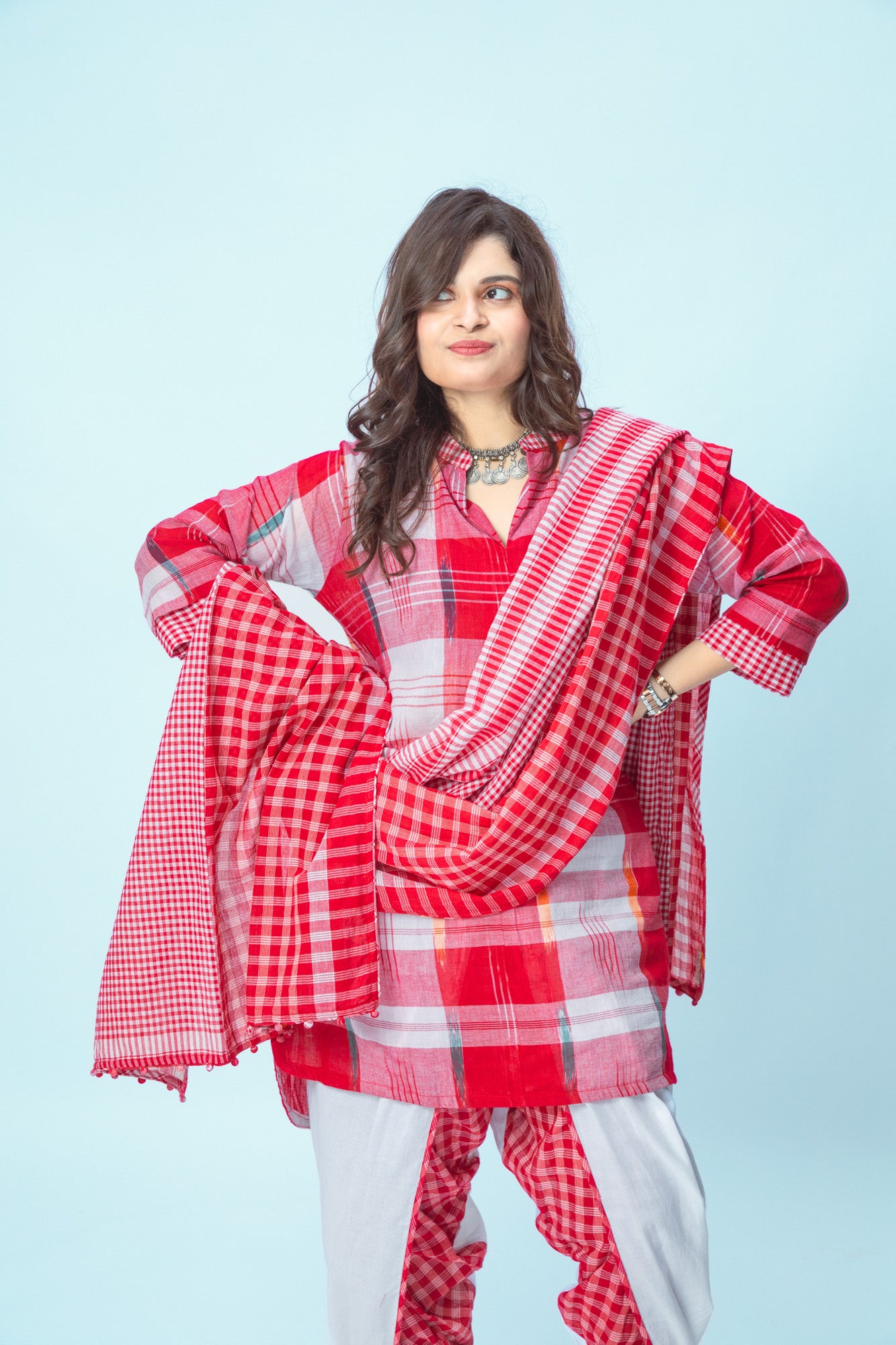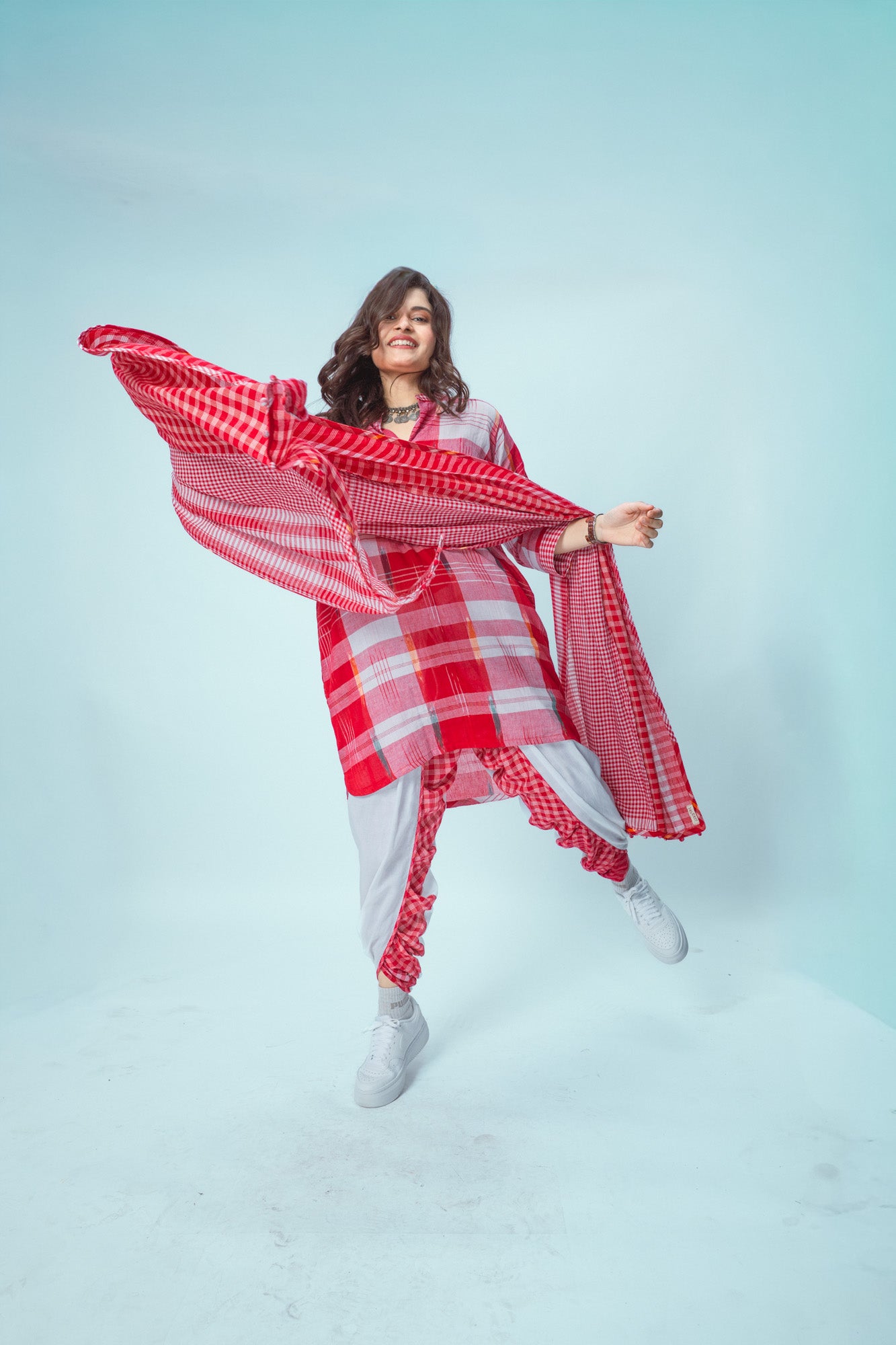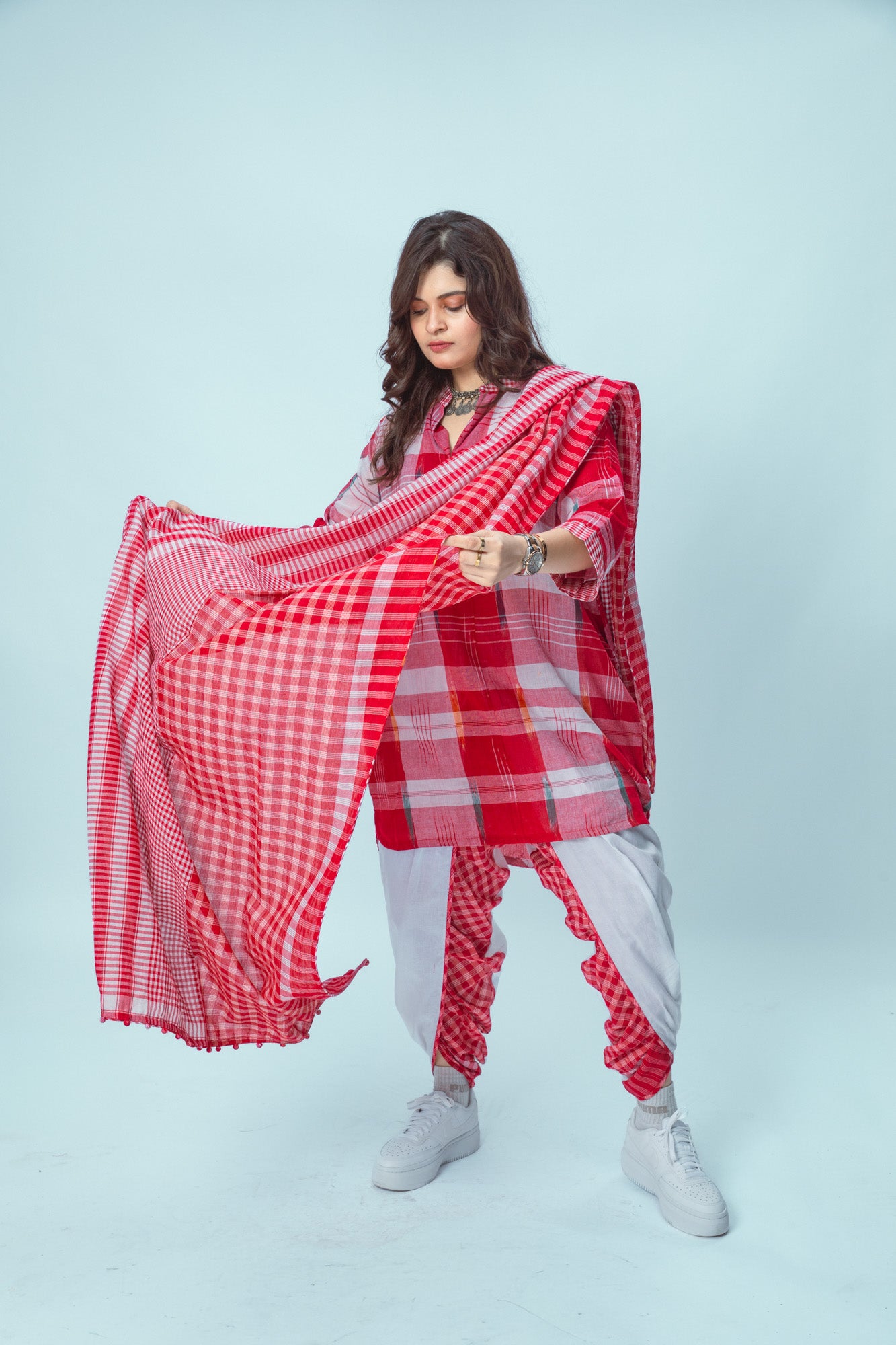 This Red Rush Set includes a kurta, dhoti pants, and a dupatta crafted from 100% cotton for exceptional comfort and breathability. The kurta features a V-neck, 3/4 sleeves, and pockets, with a high-low hem—35 inches at the front and 38 inches at the back—offering a modern silhouette. The dhoti pants are designed with an elastic waistband, drawstring, and pockets, ensuring a secure and comfortable fit. Completing the set is a 2.5-meter-long, 30-inch-wide dupatta that adds versatile styling options. Ideal for those seeking breathable, functional, and stylish traditional wear.