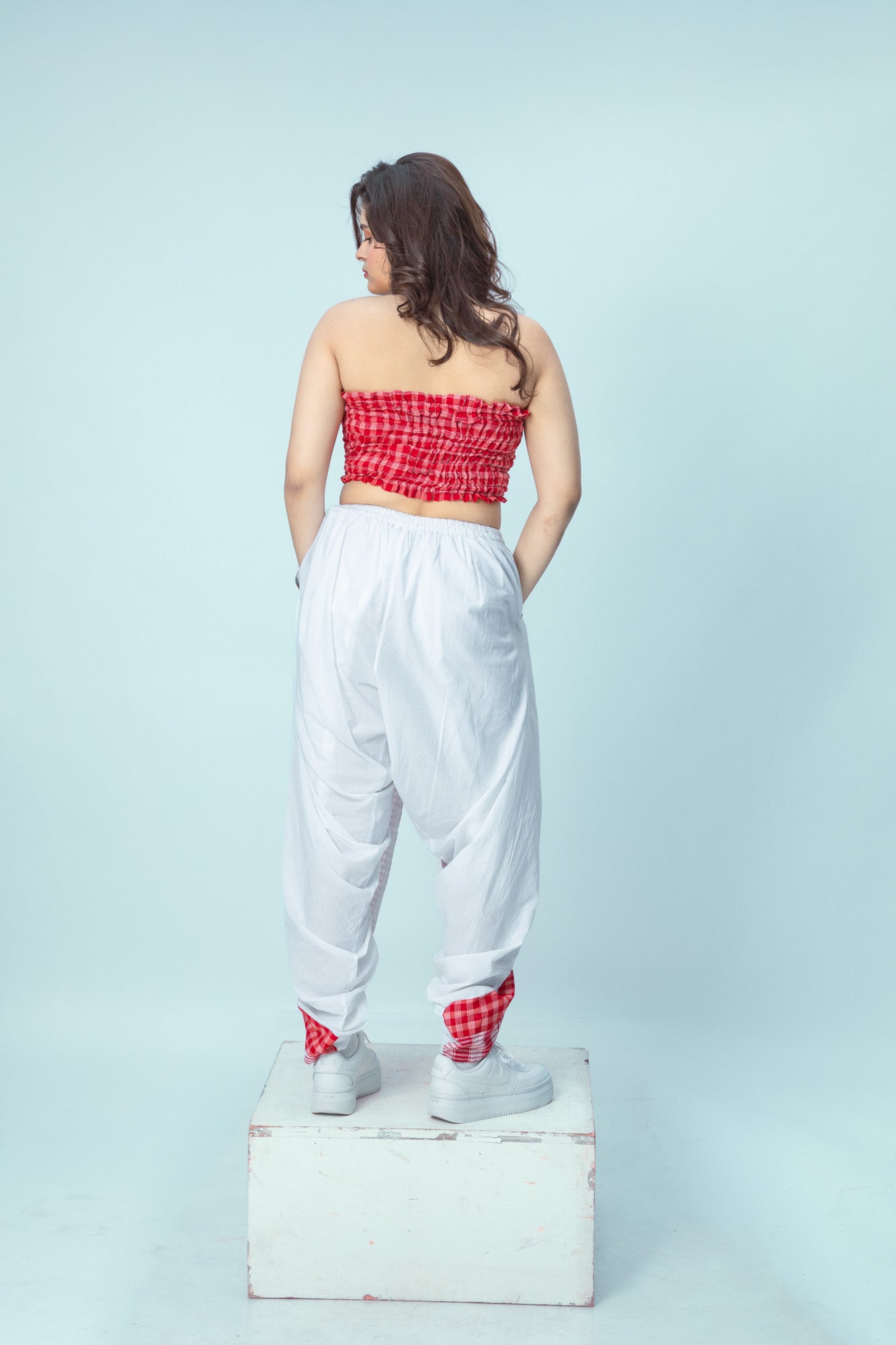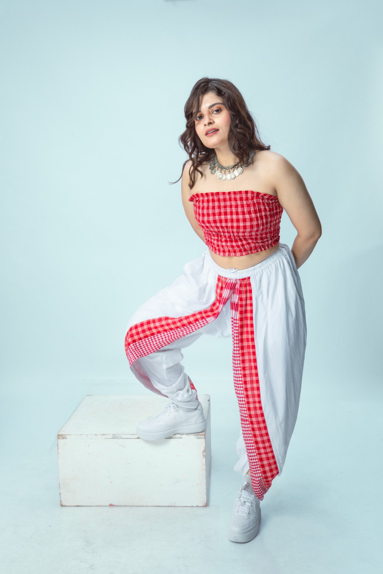 This two-piece set features a stretchable red tube top measuring 9 inches in length, paired with comfortable dhoti pants crafted from 100% cotton. The pants include an elastic waistband with a drawstring for an adjustable fit and two practical pockets, combining style with functionality for versatile wear.