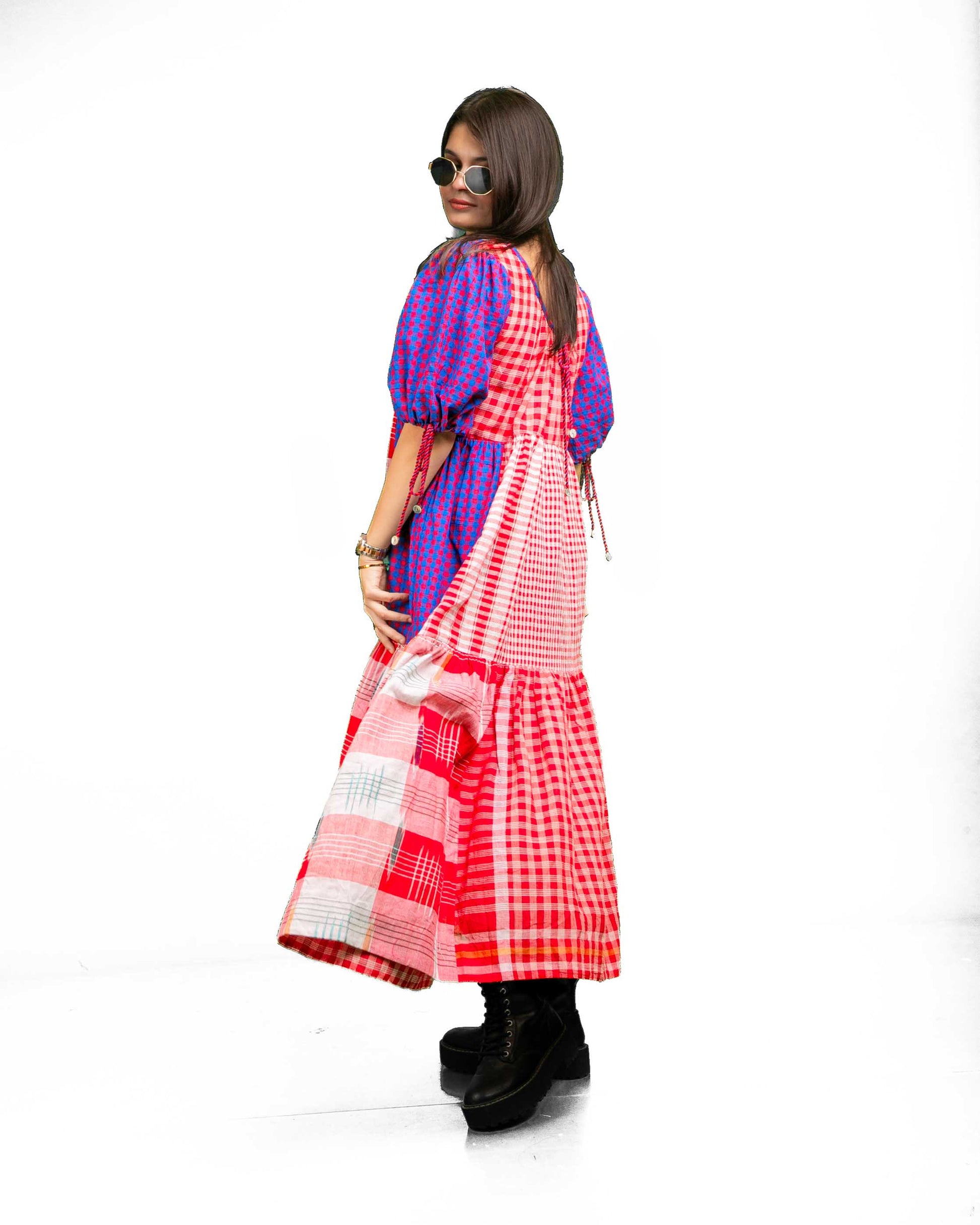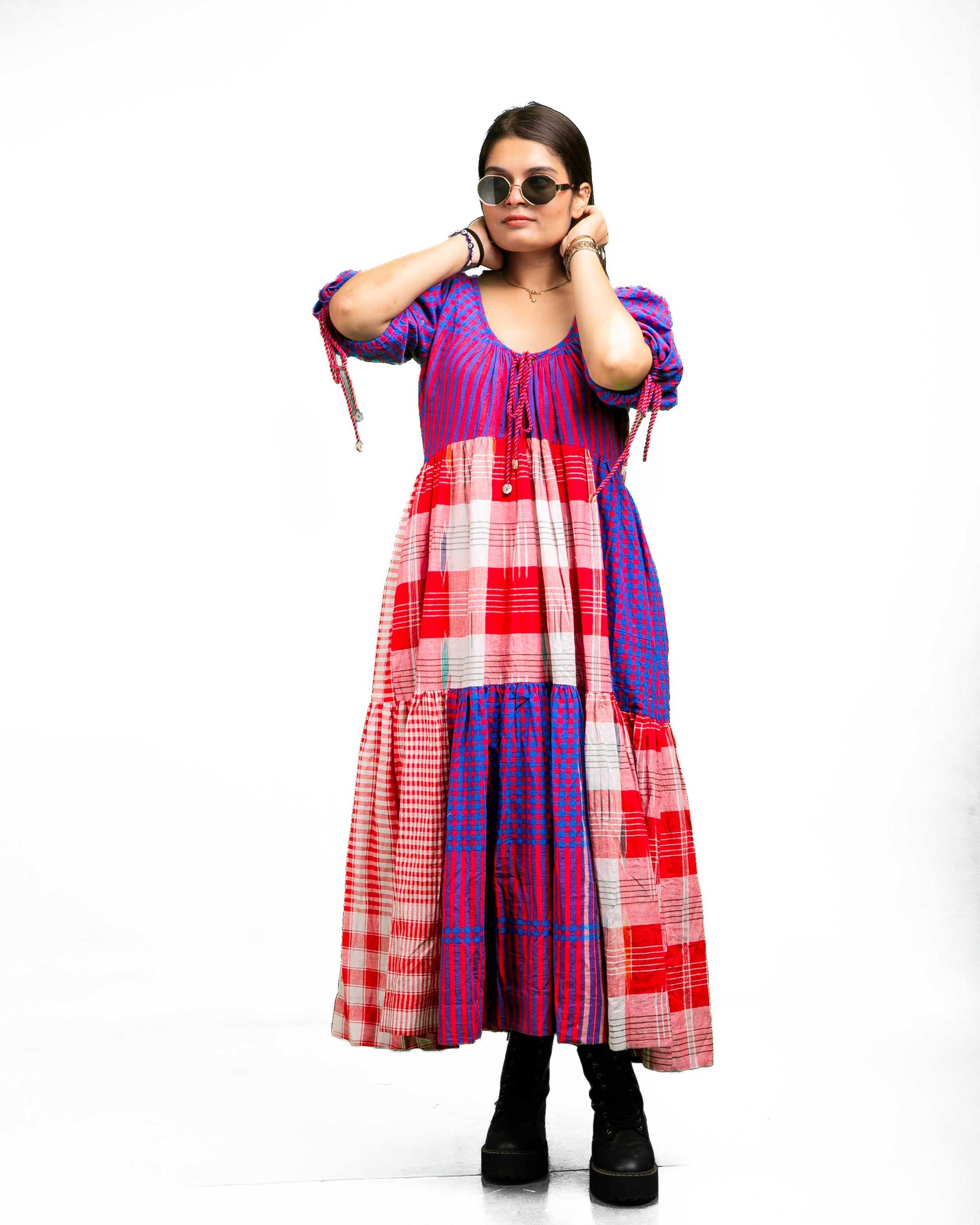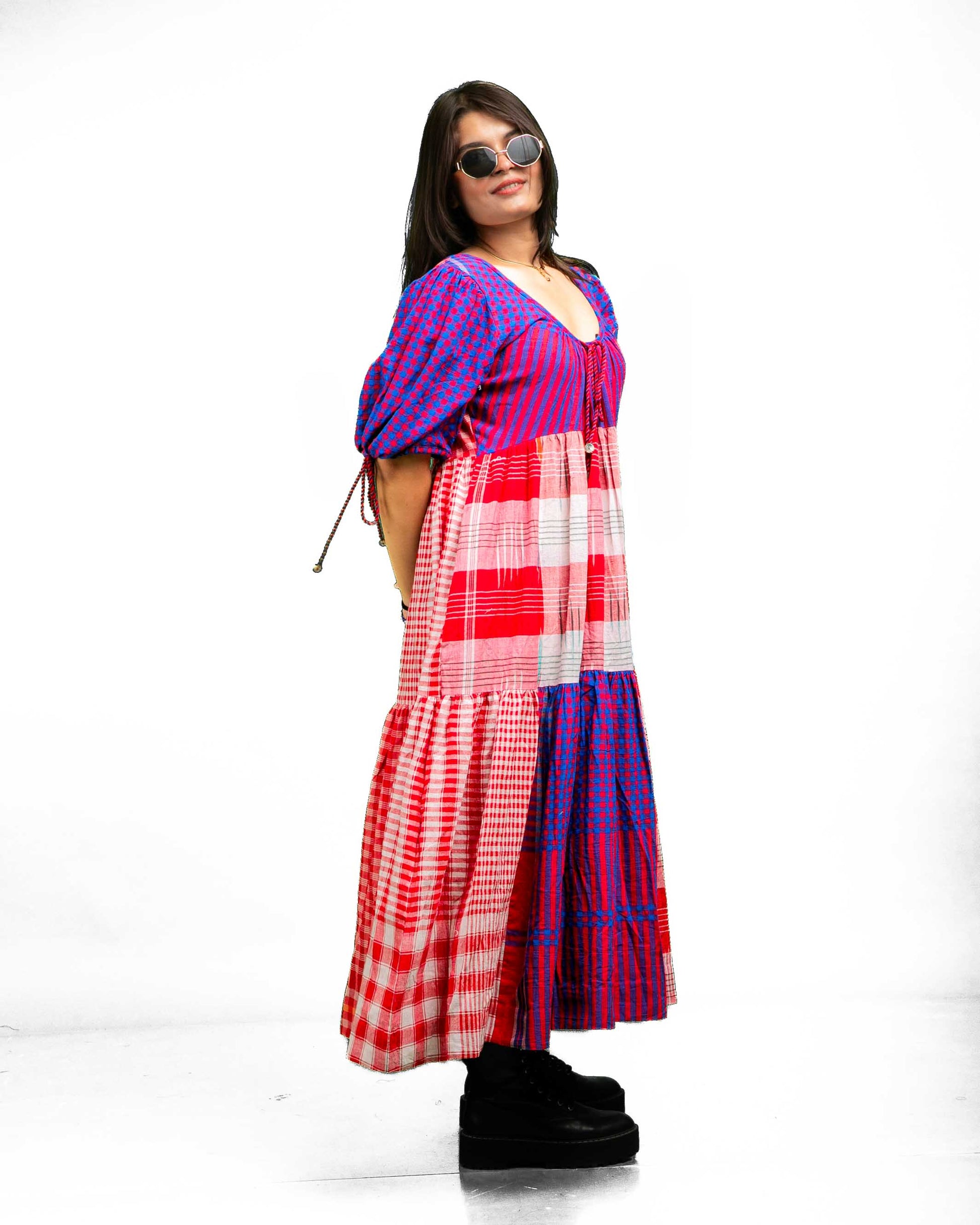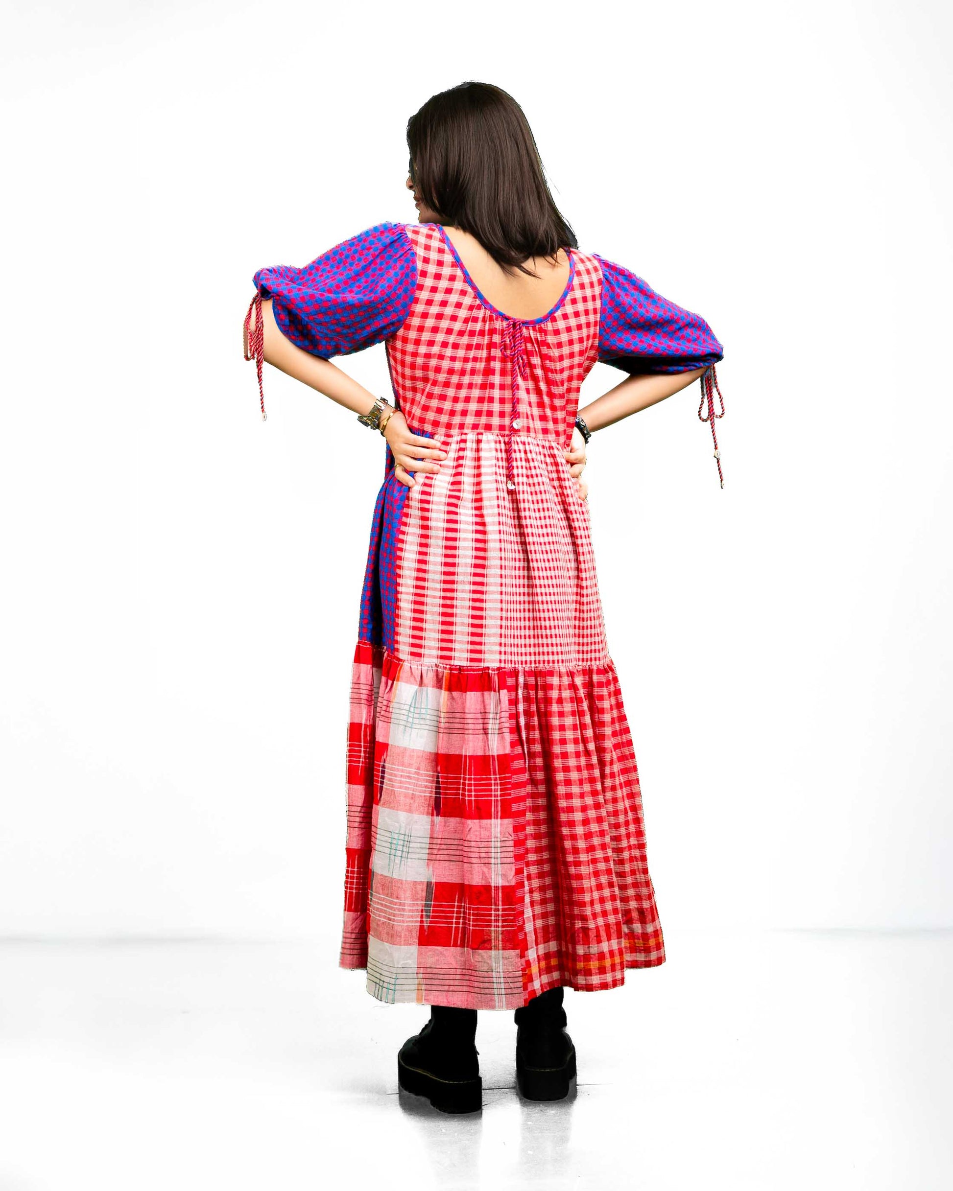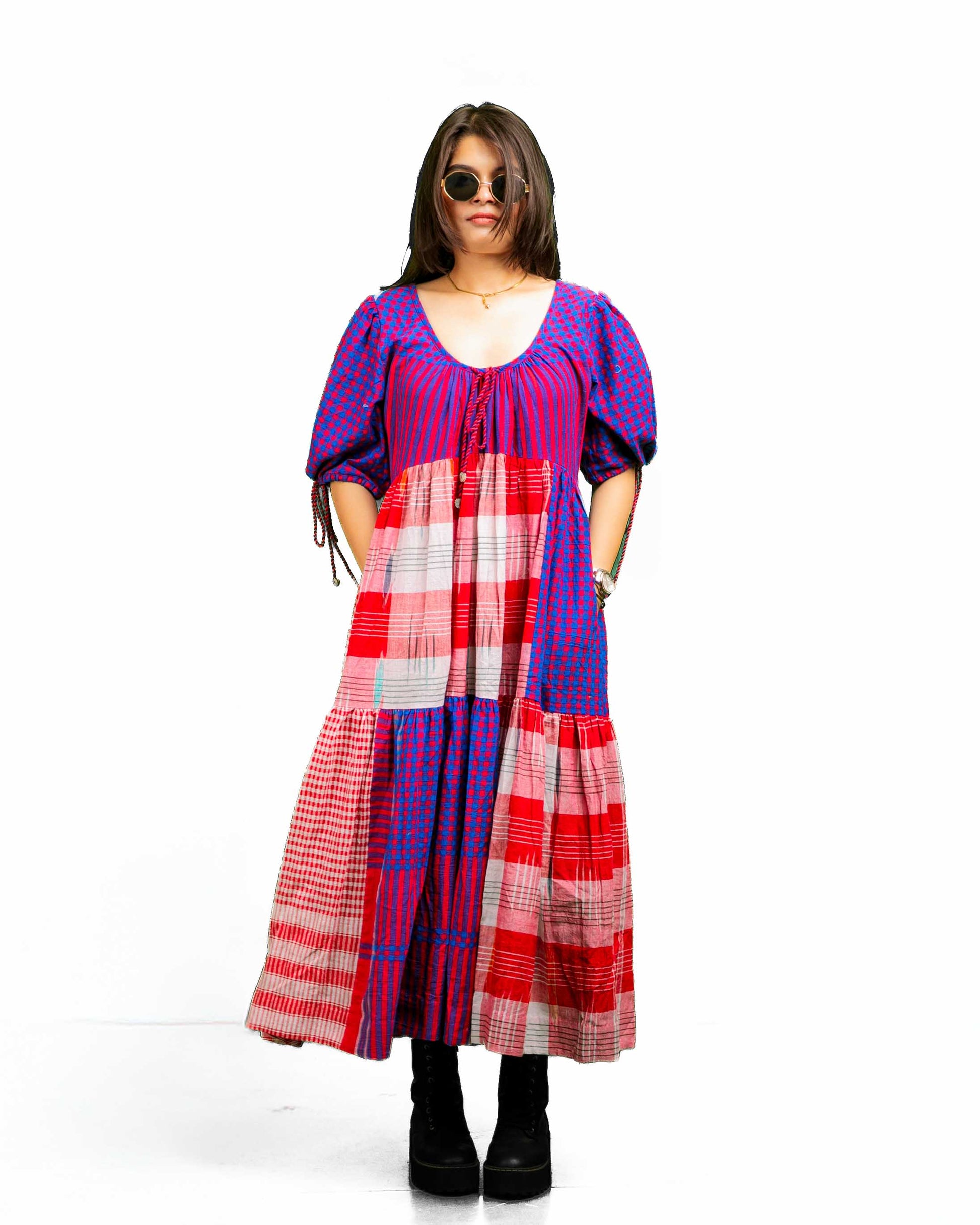 The Santorini Dress features a 46-inch length with a tiered design that adds dimension and flow. Its comfortable neckline and relaxed sleeves, finished with adjustable drawstrings, ensure ease of wear. Crafted using a sophisticated colour blocking technique, this dress offers a visually engaging look. The back design introduces a unique twist, differing subtly from the front to enhance its overall appeal. Ideal for those seeking style combined with comfort and distinctive detailing.