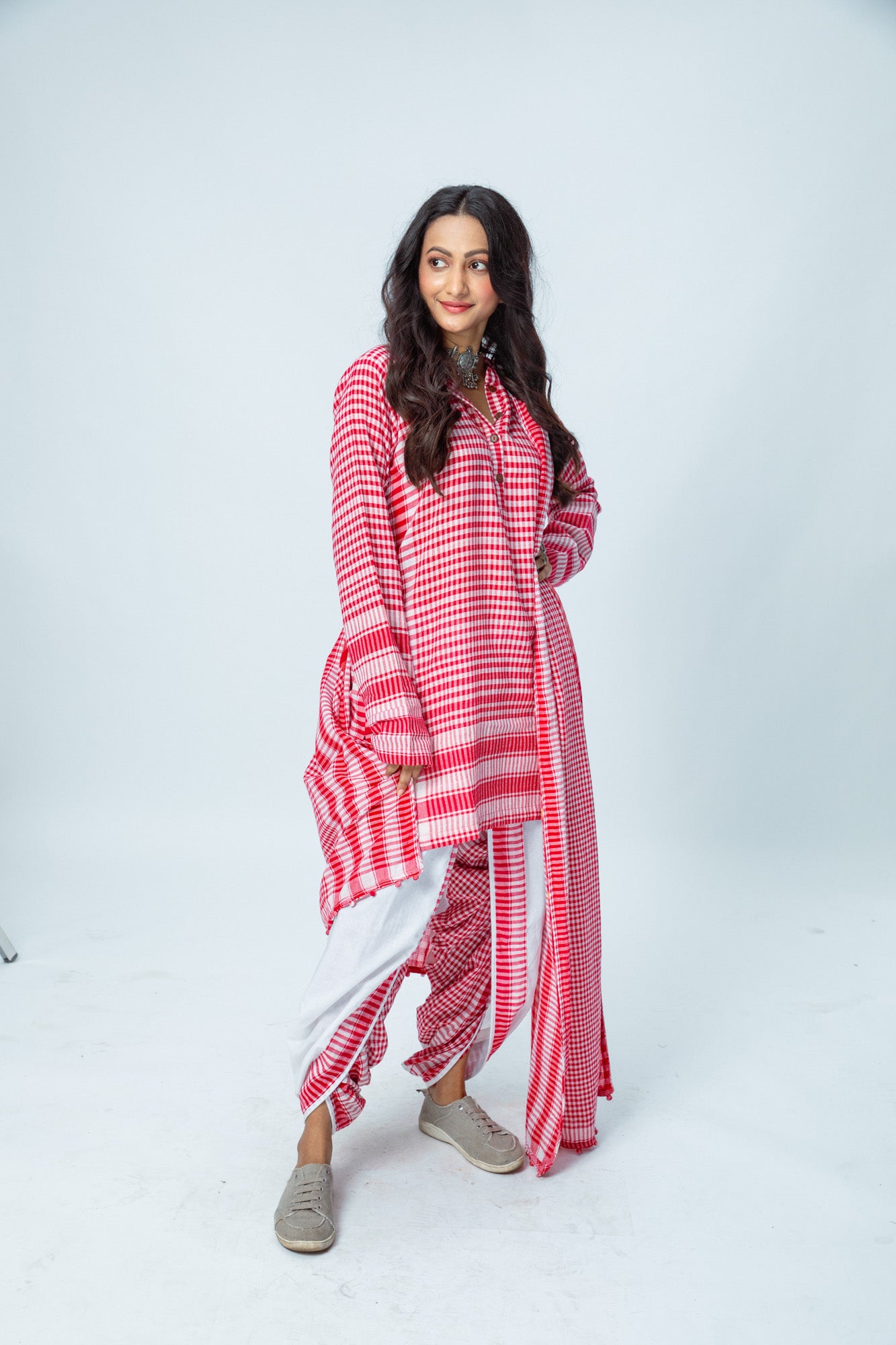 This Sundowner Dupatta Set includes a kurta, dhoti, and dupatta, all crafted from 100% cotton for breathable comfort. The kurta features a button closure at the neck, full sleeves, and practical pockets, designed to be styled independently. The dhoti offers an elastic waistband with a drawstring and pockets for ease and convenience. Complementing the set, the dupatta measures 2.5 meters by 30 inches, completing your versatile ensemble with effortless style.