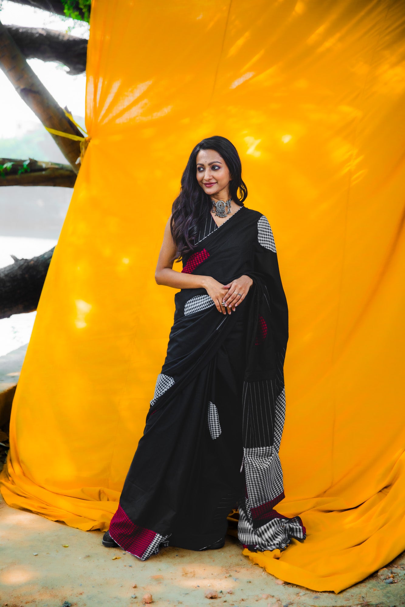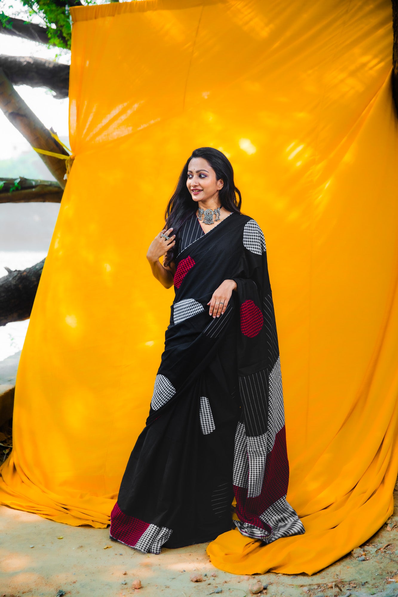 Elevate your wardrobe with the Afterglow saree, a sophisticated blend of tradition and contemporary style. Crafted from premium 100% pure cotton, this piece features an understated white and black polka dot pattern that transcends seasonal trends. At 5.5 meters, the generous length accommodates multiple draping techniques, from classic to modern interpretations. The natural breathability of cotton ensures all-day comfort, whether you're attending formal events or embracing casual elegance. The refined polka dot motif adds visual interest without overwhelming the silhouette, making it a versatile addition to any collection. Please note: blouse sold separately.
