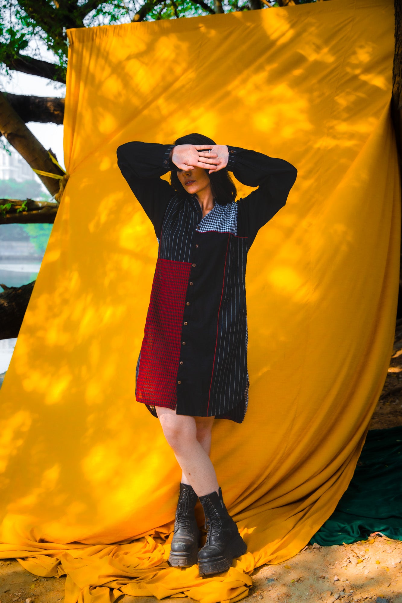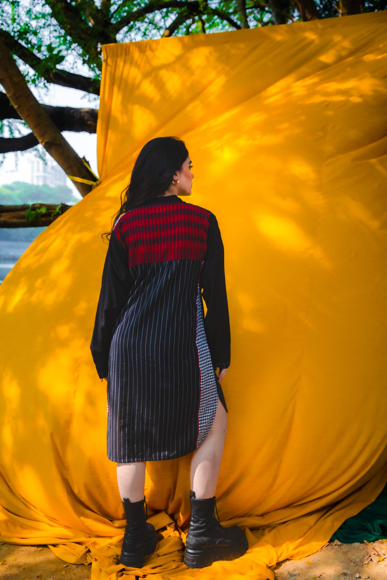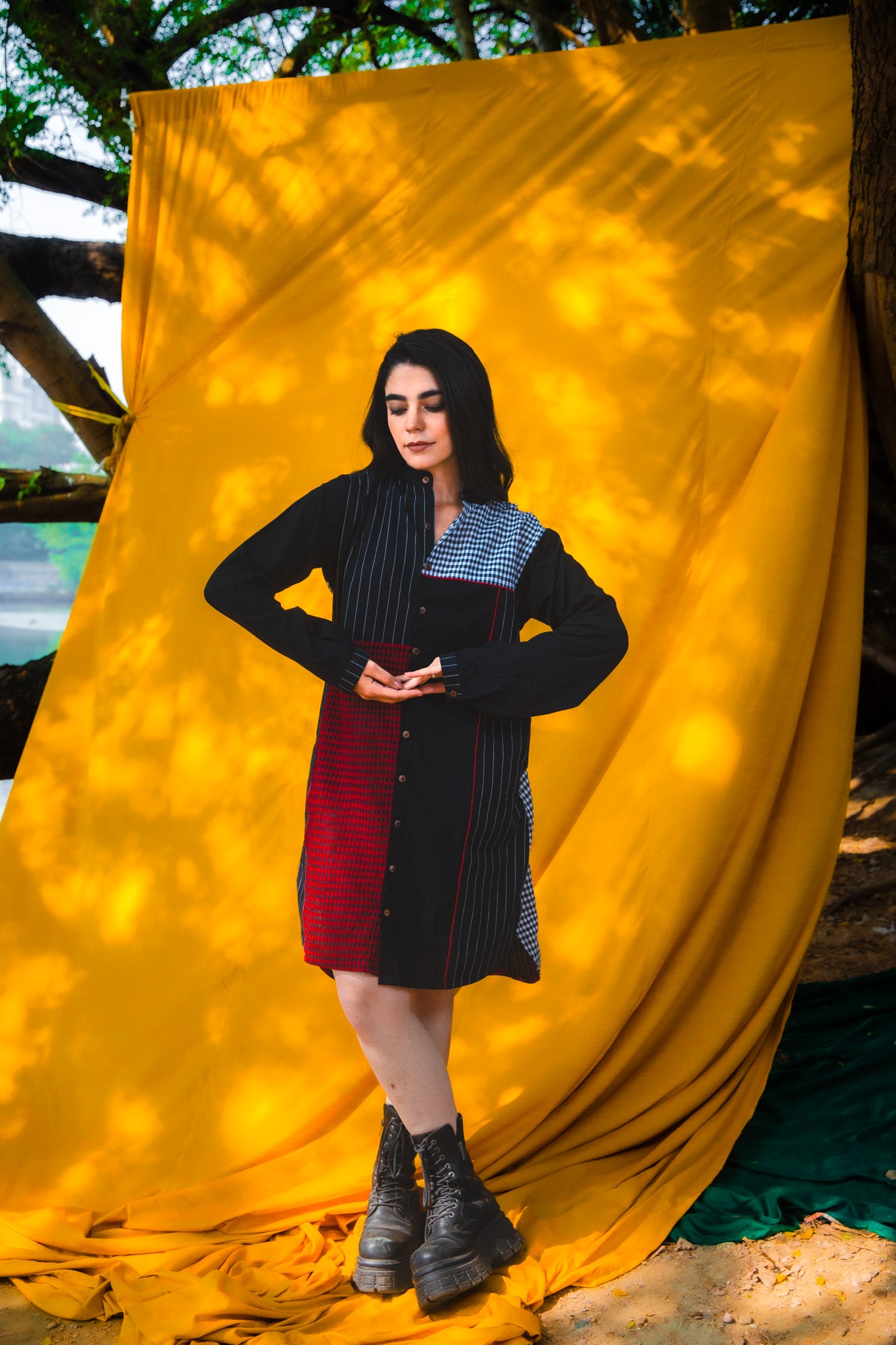 The Checkmate Shirt Dress combines four carefully selected fabrics with meticulous construction to deliver both comfort and elegance. Crafted from 100% cotton, this piece features a flattering silhouette enhanced by thoughtful fabric placement and structure. The classic button-down front, full sleeves, and crisp shirt collar create a polished aesthetic, while the high-low hemline adds contemporary movement. Functional side pockets complete this versatile wardrobe essential, seamlessly transitioning from casual to refined occasions.