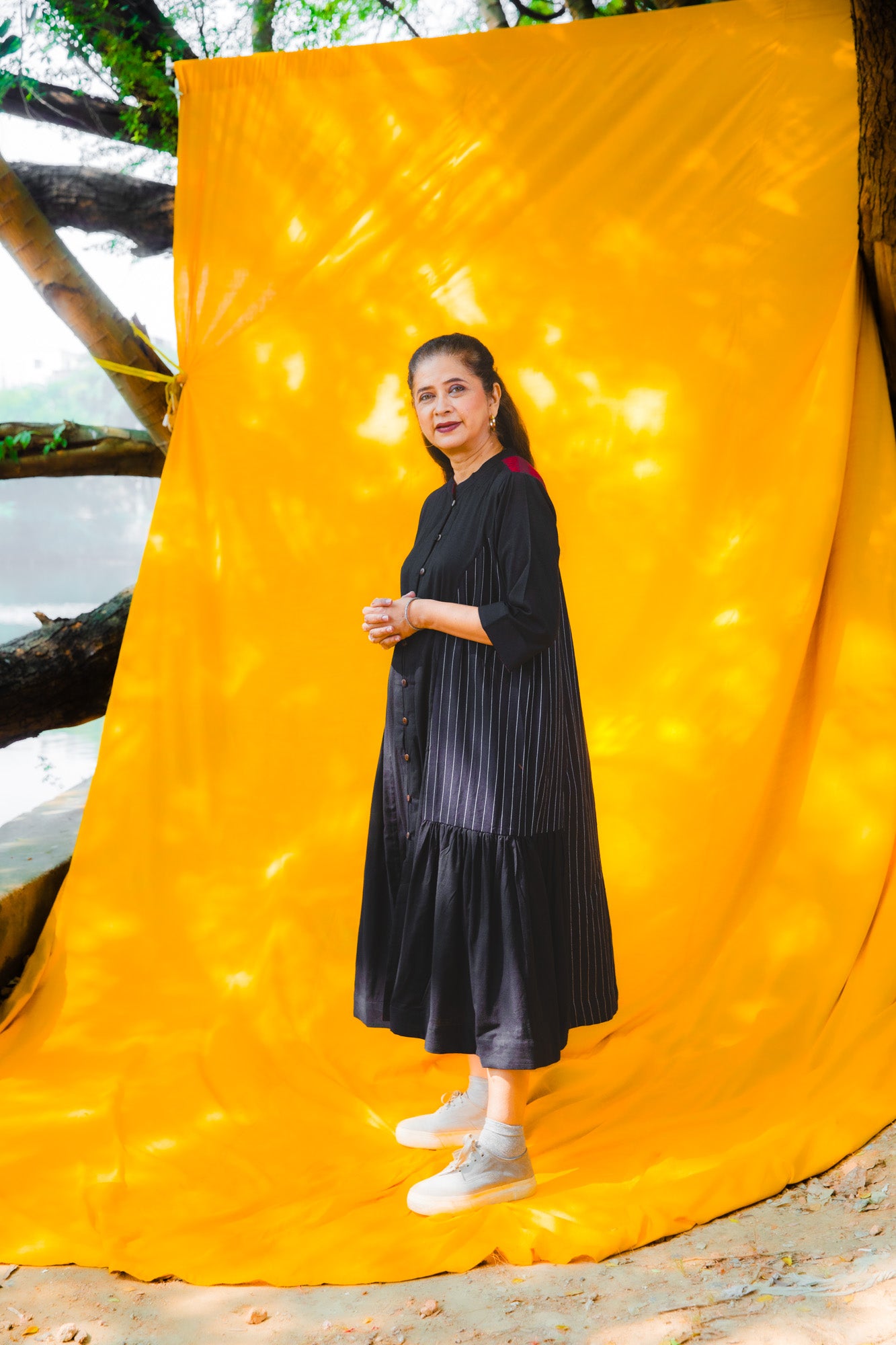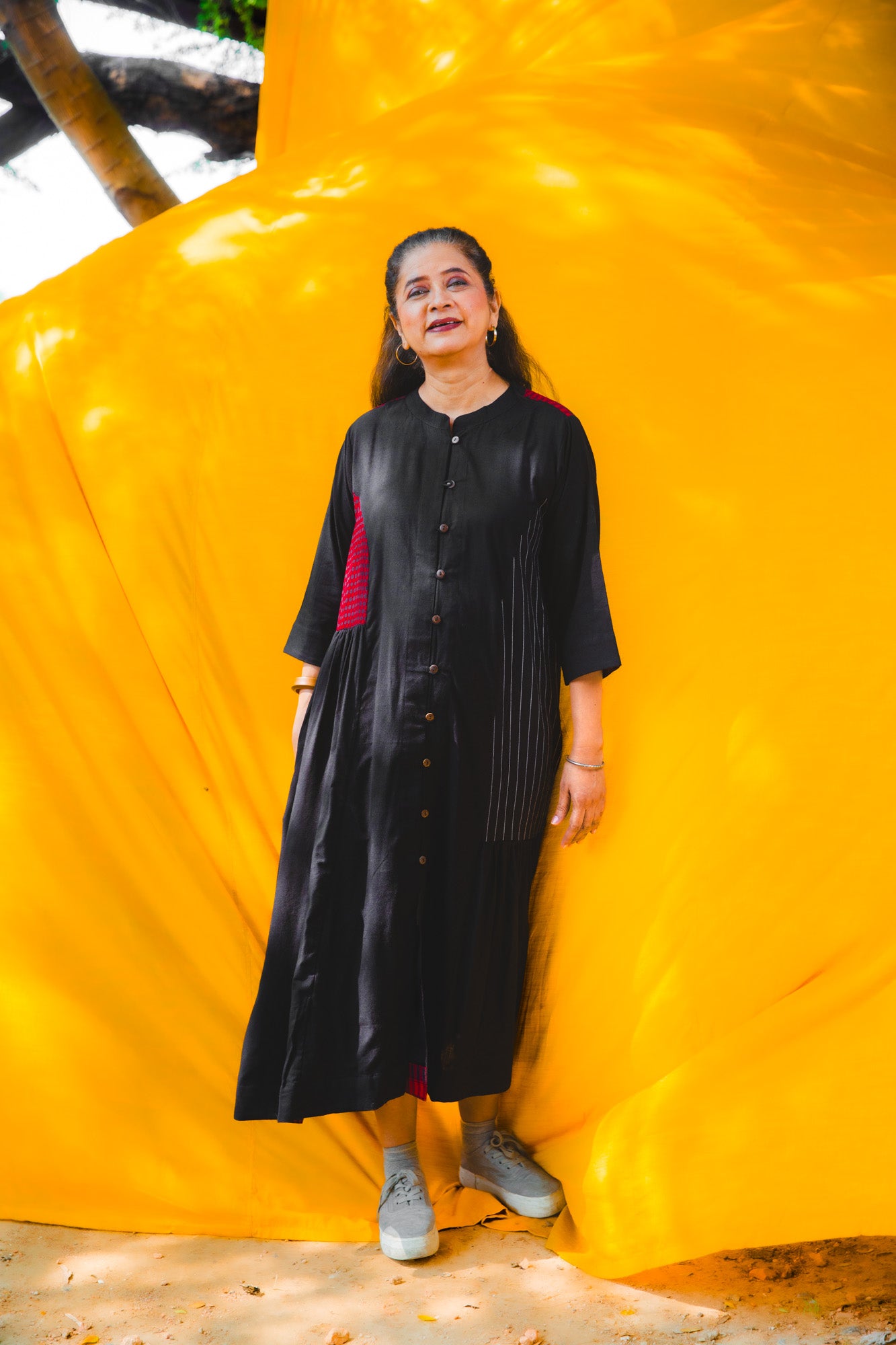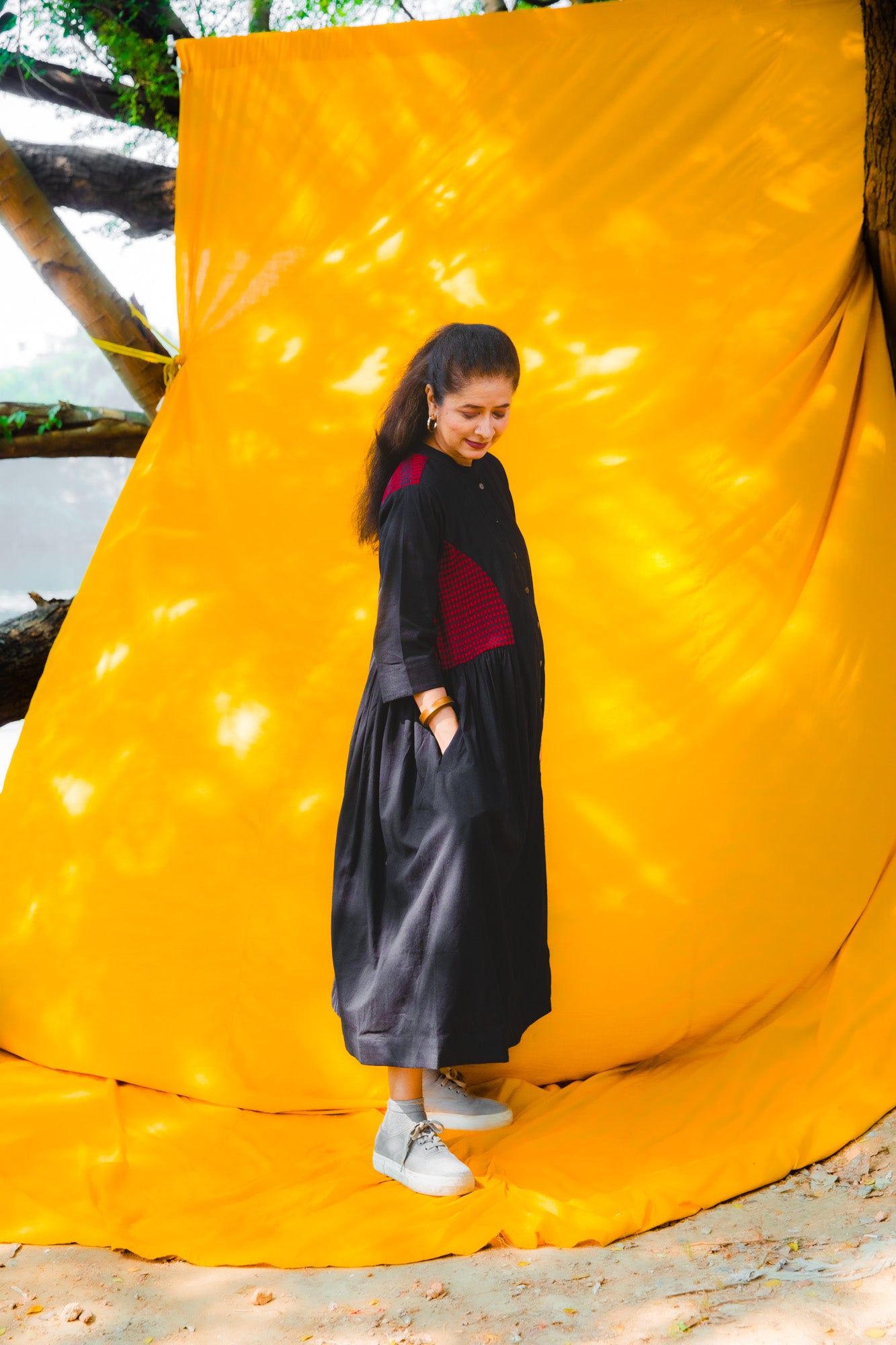 The Ember Dress combines thoughtful design with everyday practicality. Crafted from 100% cotton, this 46-inch midi features a strategic three-fabric composition that creates a flattering silhouette while maintaining graceful movement. Three-quarter sleeves and a button-down front offer versatile styling options, while dual pockets provide functional convenience. The fabric placement is deliberately positioned to enhance your frame without sacrificing the dress's inherent flow and elegance. An effortless choice for those seeking both comfort and refined style.