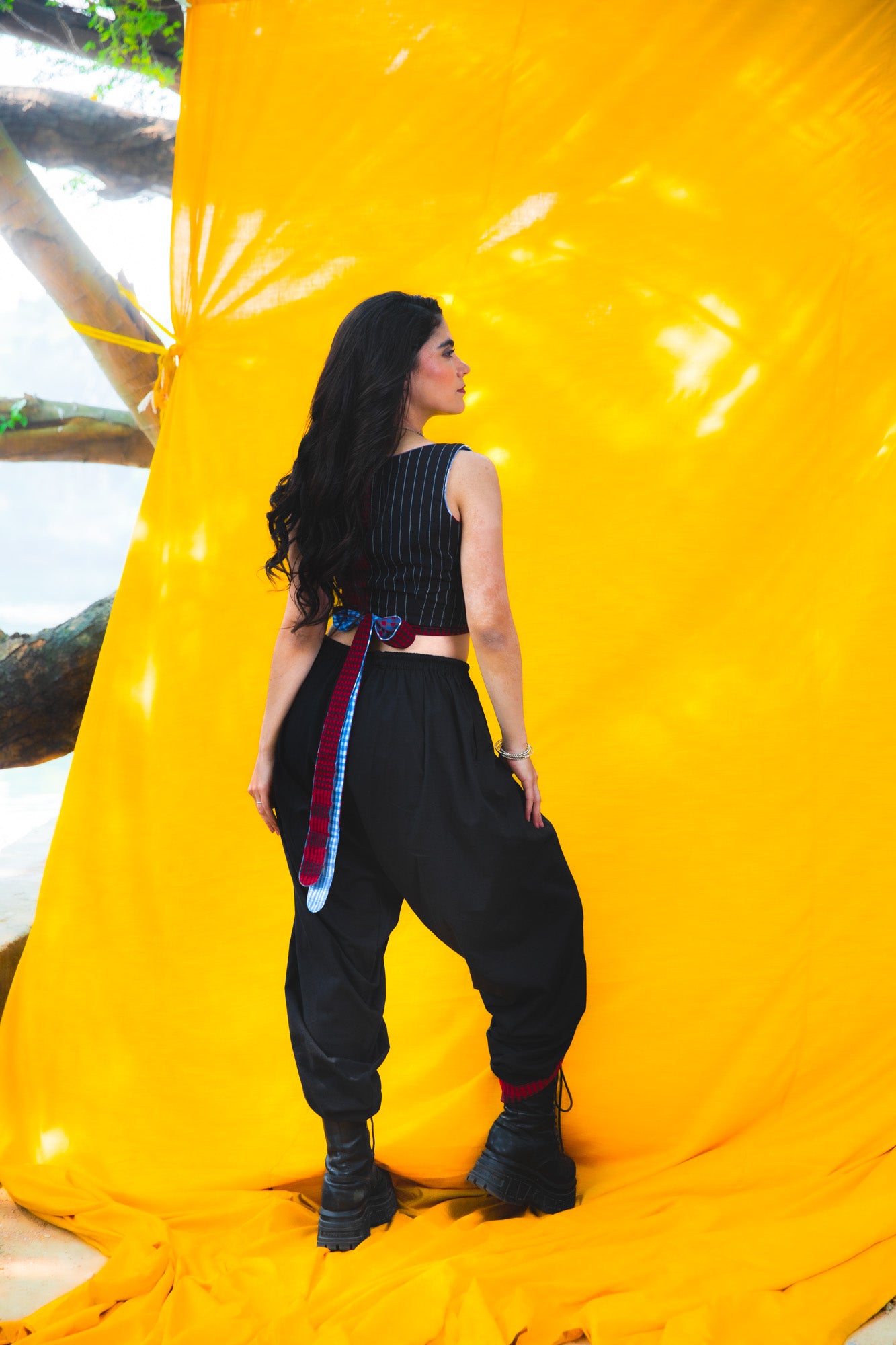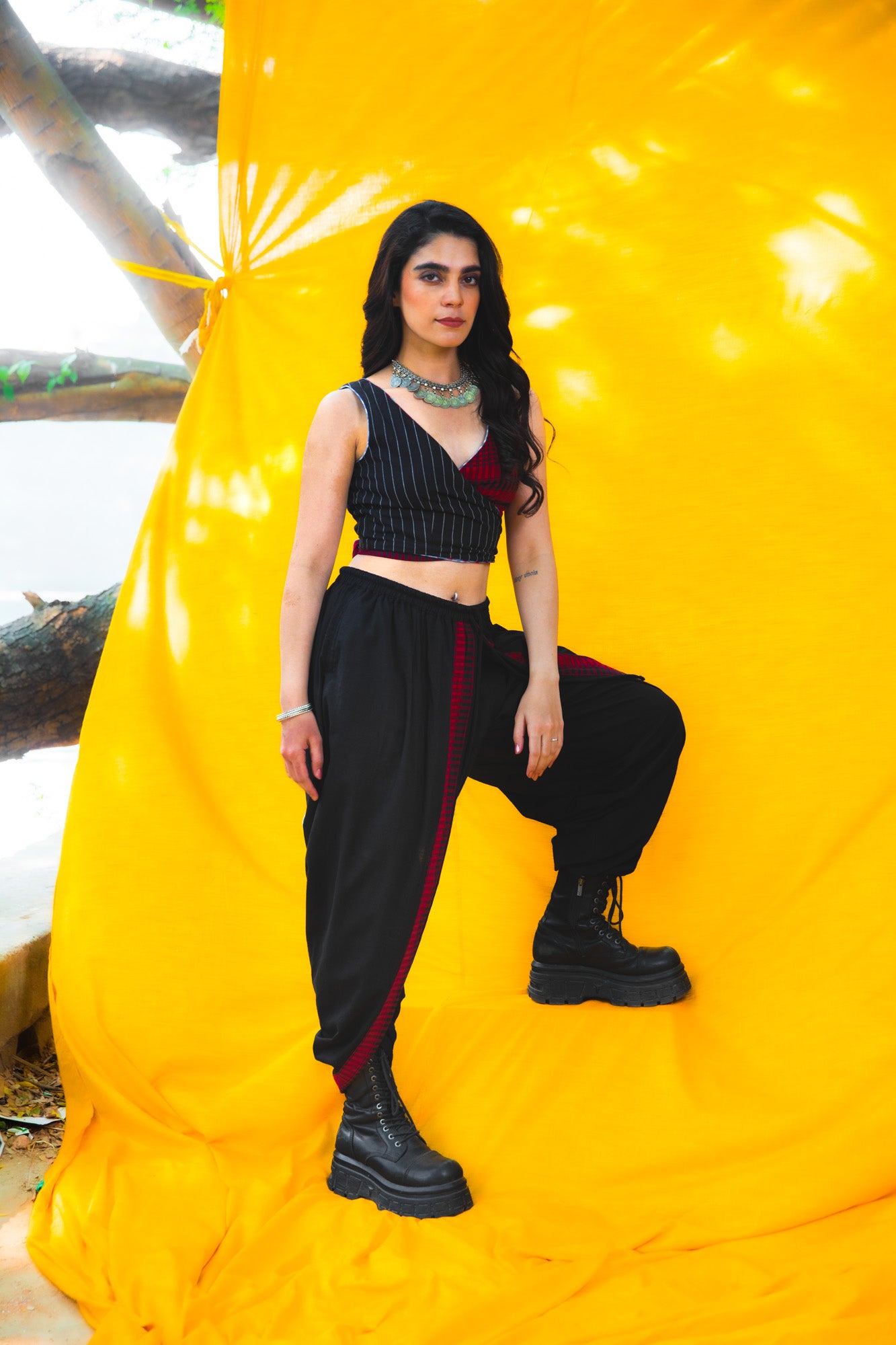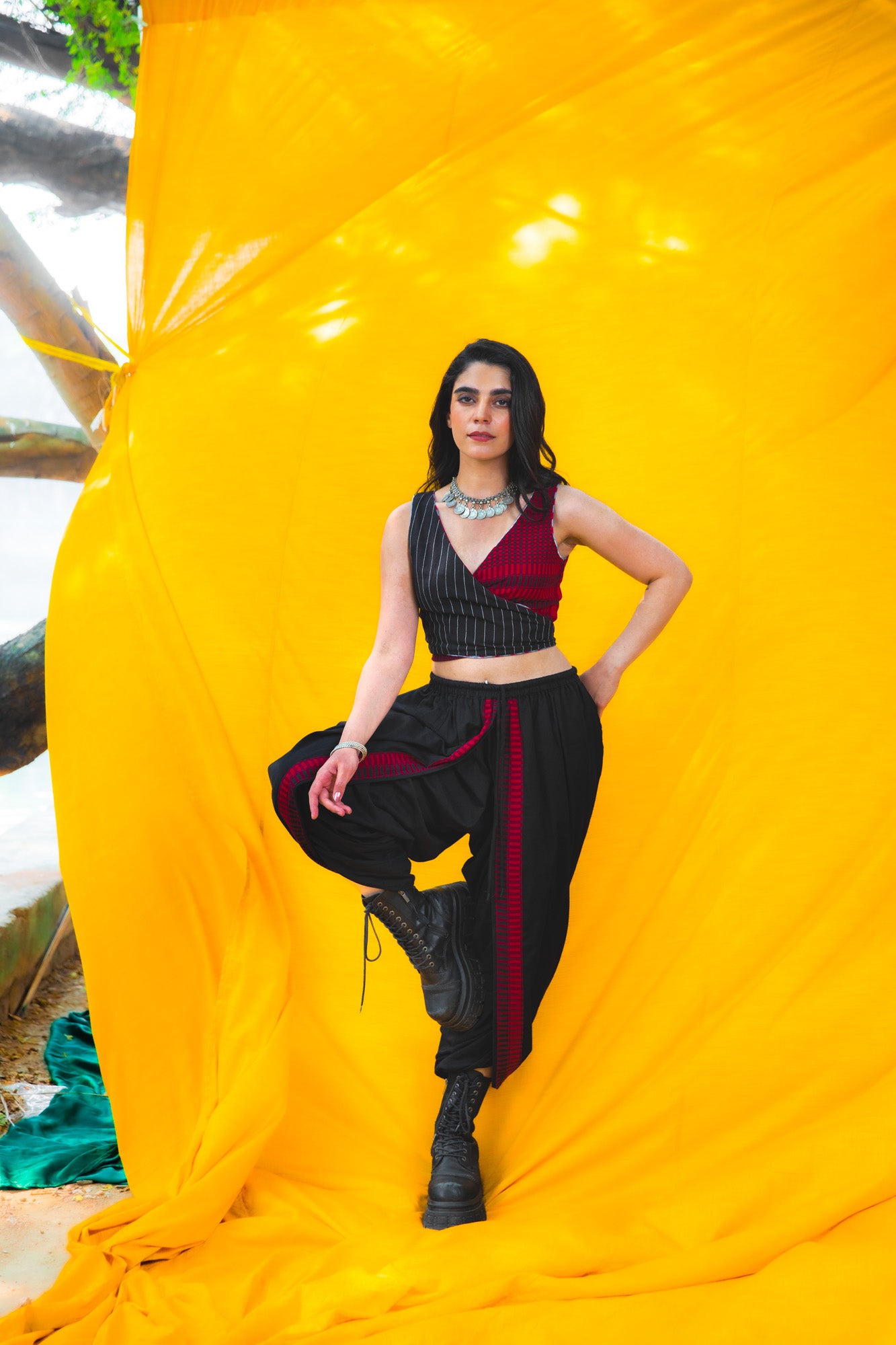 The Ladybird Bustier-Dhoti Set combines versatile styling with practical comfort. This two-piece ensemble features a wrap-around bustier crafted from 100% cotton that adjusts to your fit and reverses for two distinctly different looks, offering maximum styling flexibility. The coordinating dhoti features an elasticated waistband with drawstring closure and functional side pockets, ensuring both ease of wear and everyday utility. Perfect for those seeking a sophisticated, adaptable wardrobe staple that transitions effortlessly between occasions.