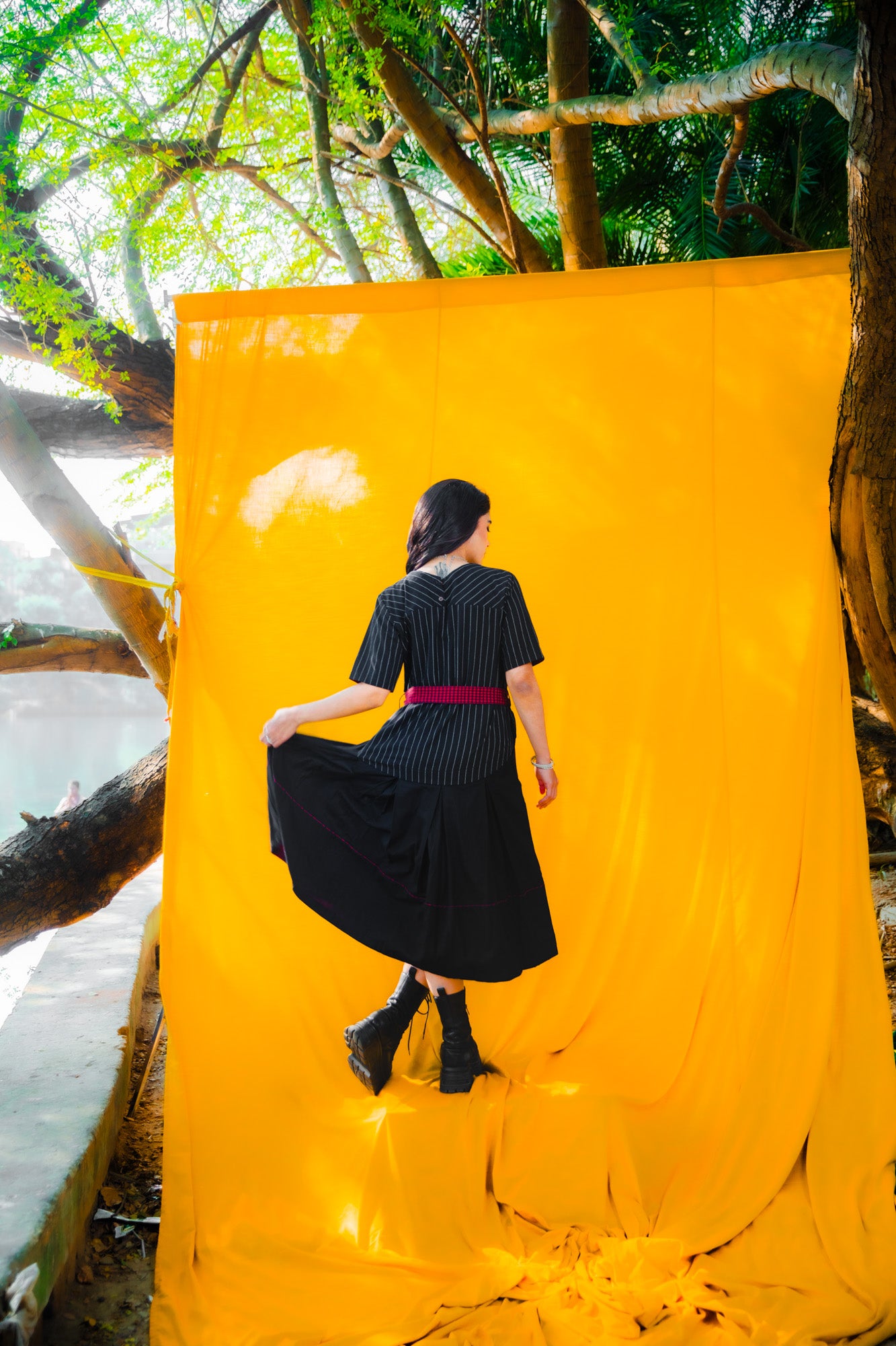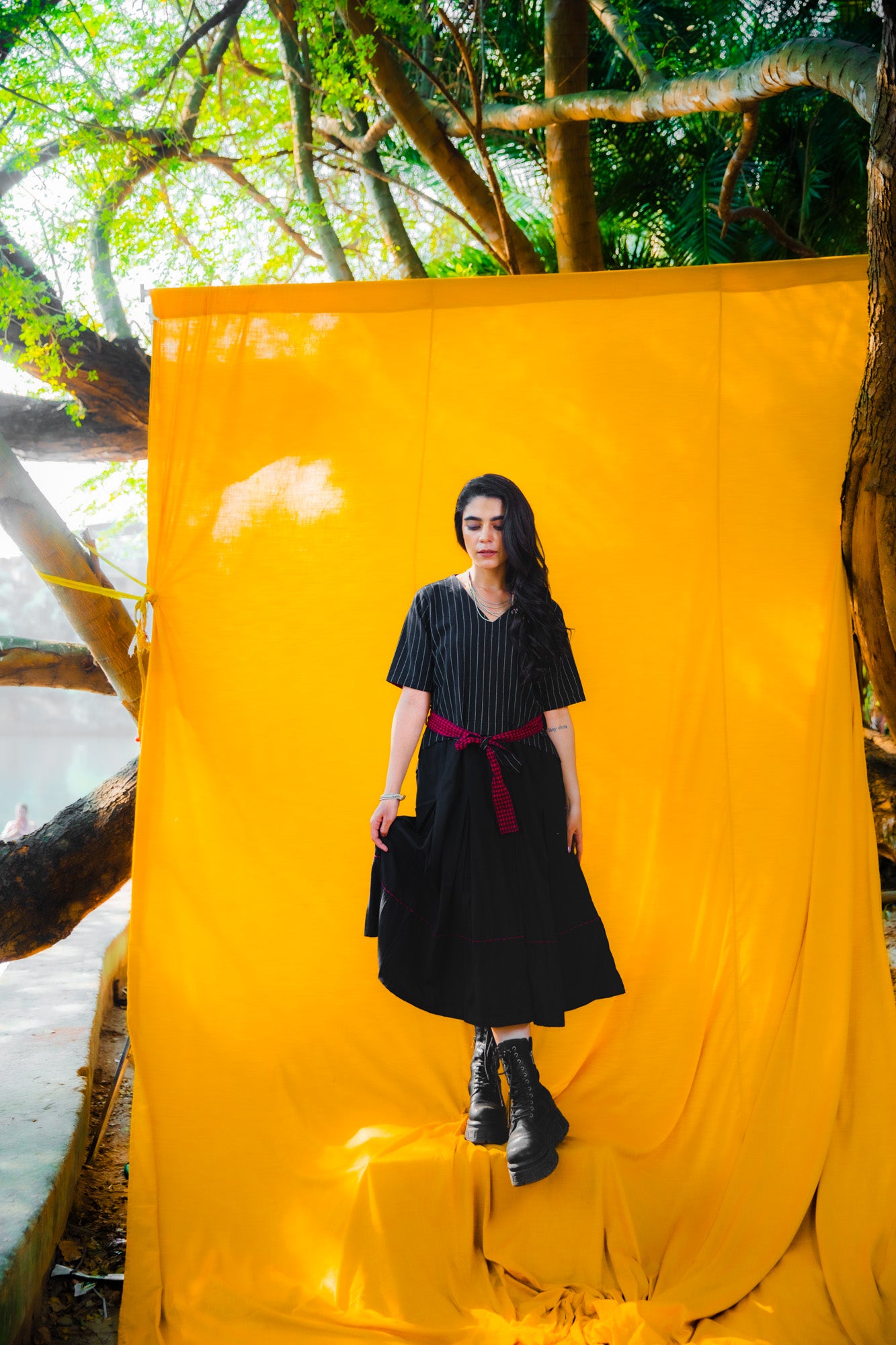 The Noir Belt Dress combines practicality with refined elegance. Crafted from 100% cotton in classic black and black stripe, this 48-inch dress features a flattering silhouette enhanced by a detachable maroon gingham belt. The V-neckline and half sleeves offer comfortable everyday wear, while functional side pockets add utility. Wear it belted for definition or unbelted for a relaxed aesthetic—versatility meets timeless style.