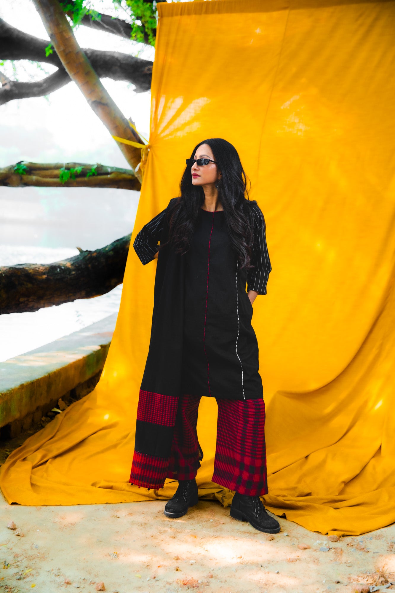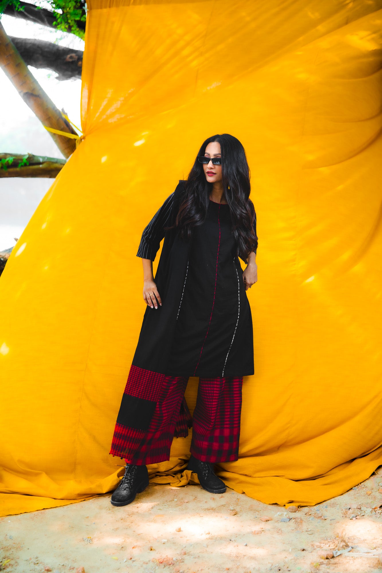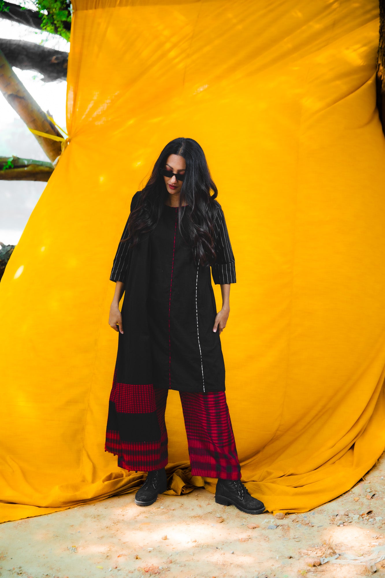 The Noir Set is a sophisticated three-piece ensemble crafted from 100% cotton, ideal for evening occasions and dinner events. The dress features a 38-inch length with practical side pockets and refined piping detailing in gingham, complemented by comfortable 3/4-length sleeves. The palazzo pants offer an elastic waistband with drawstring closure and functional pockets for ease of movement. Complete the look with the 2.5-meter by 30-inch dupatta, adorned with matching gingham detailing on both ends. This versatile set combines comfort with understated elegance, delivering both style and practicality for your special occasions.