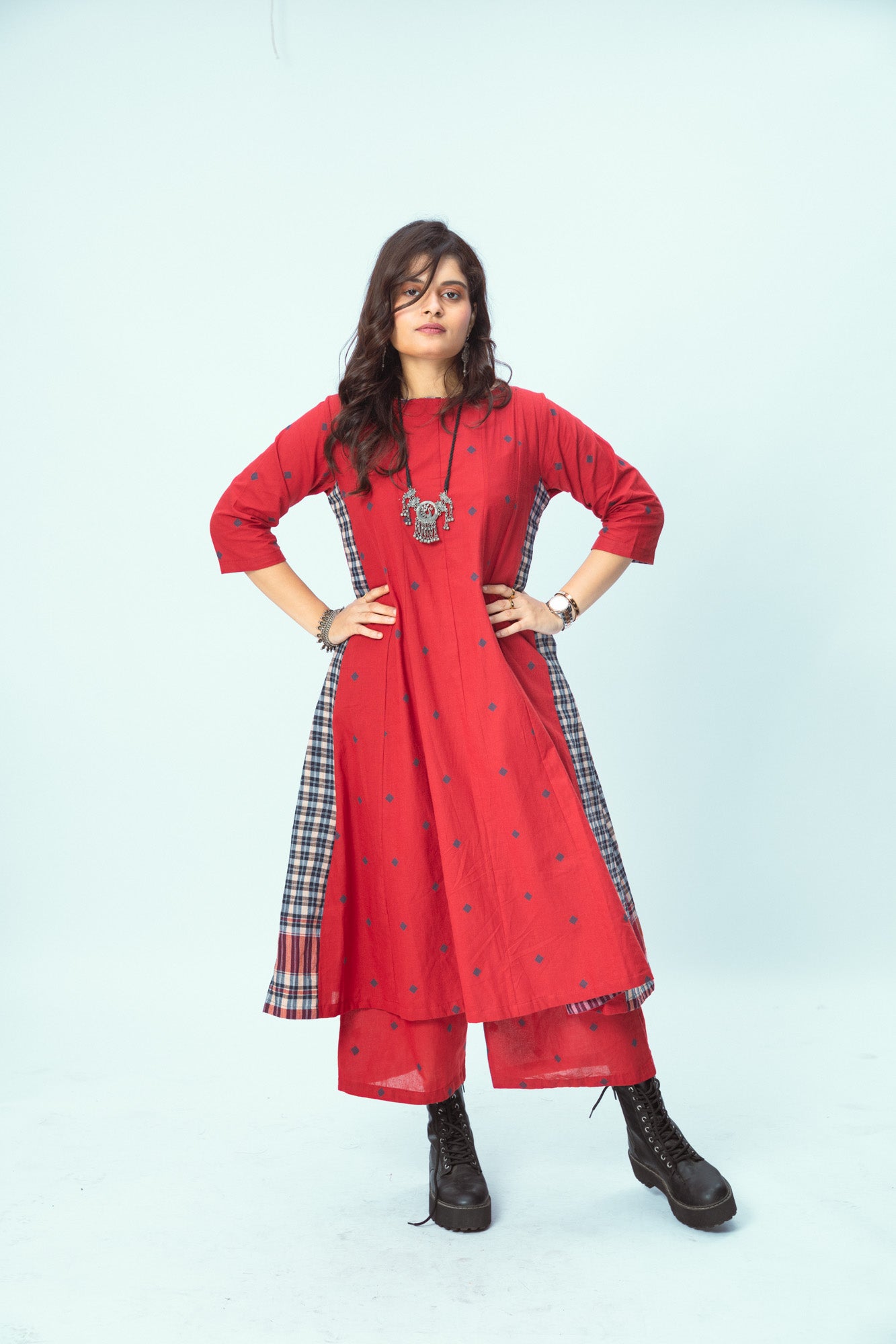 This True Red 16 Panelled Palazzo Set features a thoughtfully designed dress with 16 panels, including side panels crafted from contrasting fabric for a distinctive look. Made from 100% cotton, the dress offers 3/4 sleeves and handy pockets for added functionality and comfort. The matching palazzo pants come with an elastic waistband, drawstring, and pockets, ensuring a comfortable and adjustable fit. Ideal for stylish, everyday wear with ease and breathability.