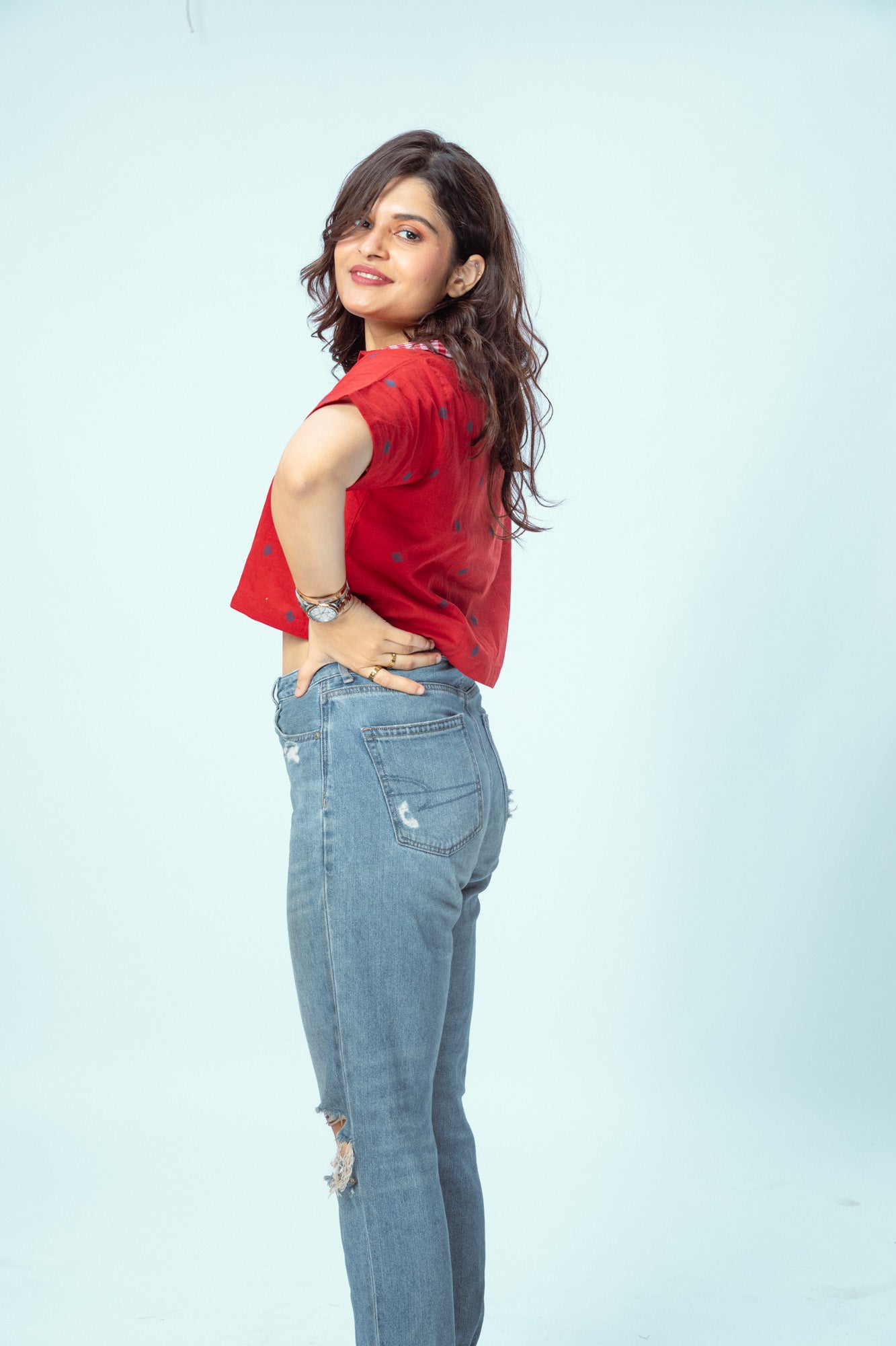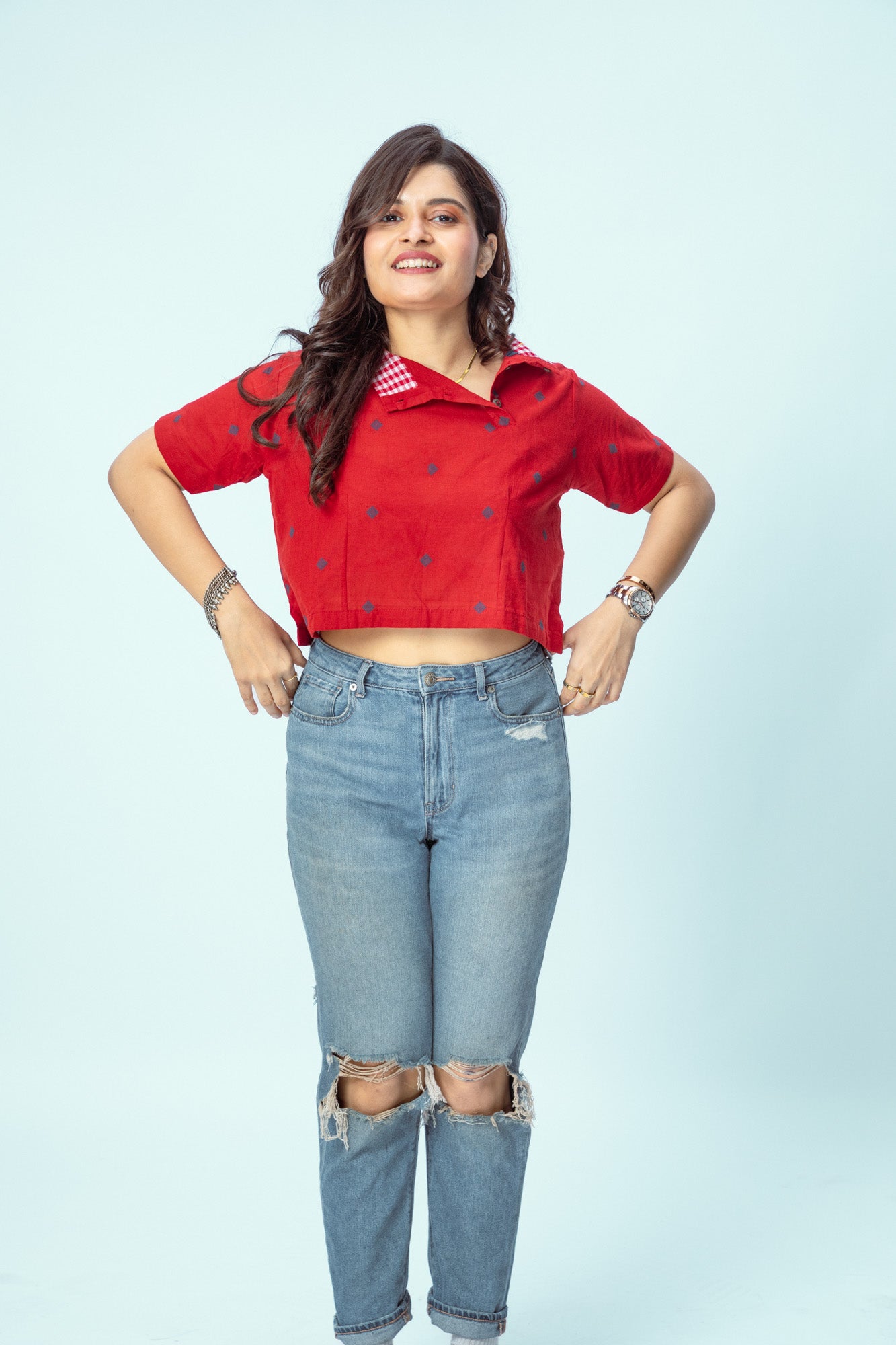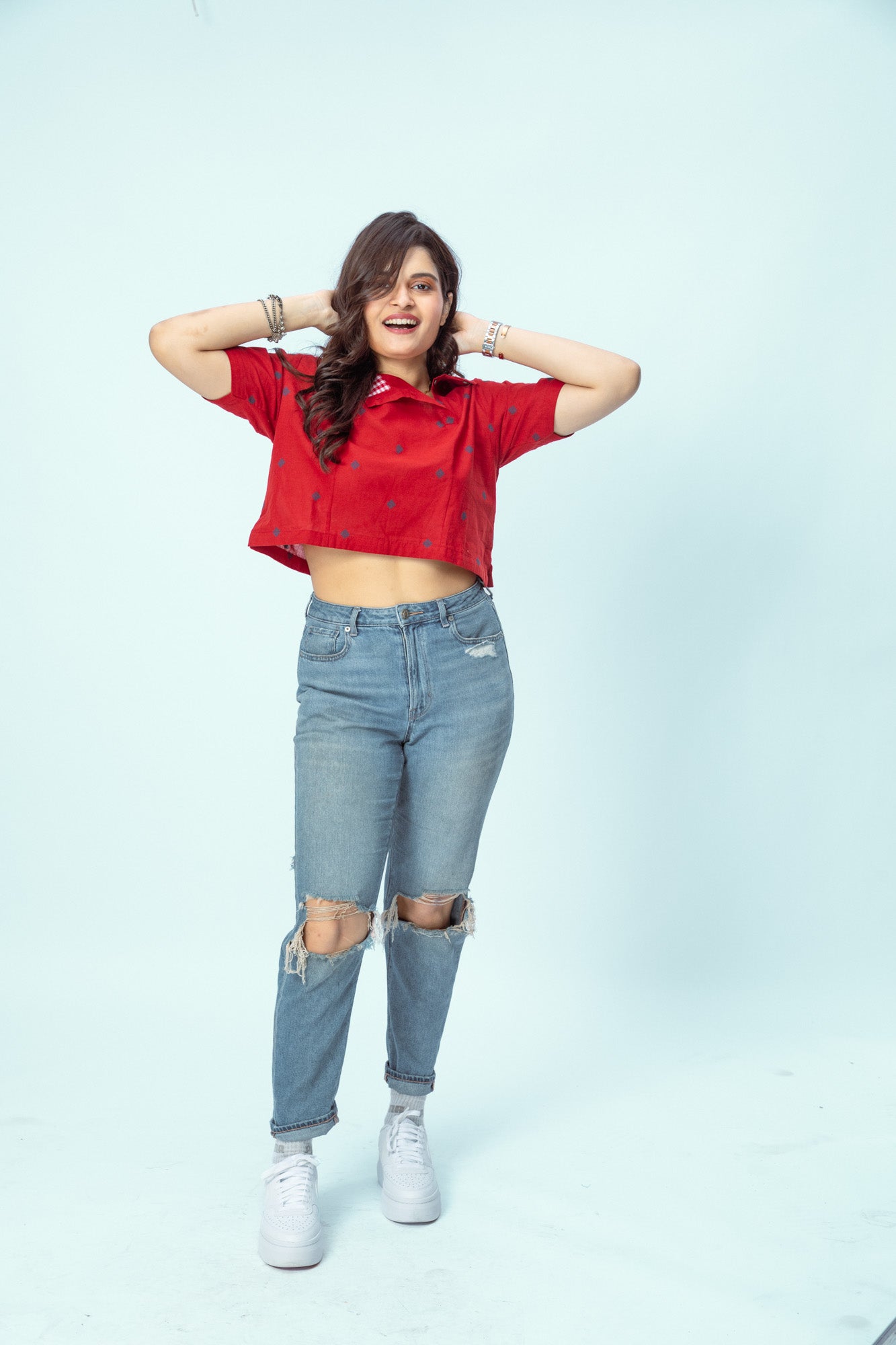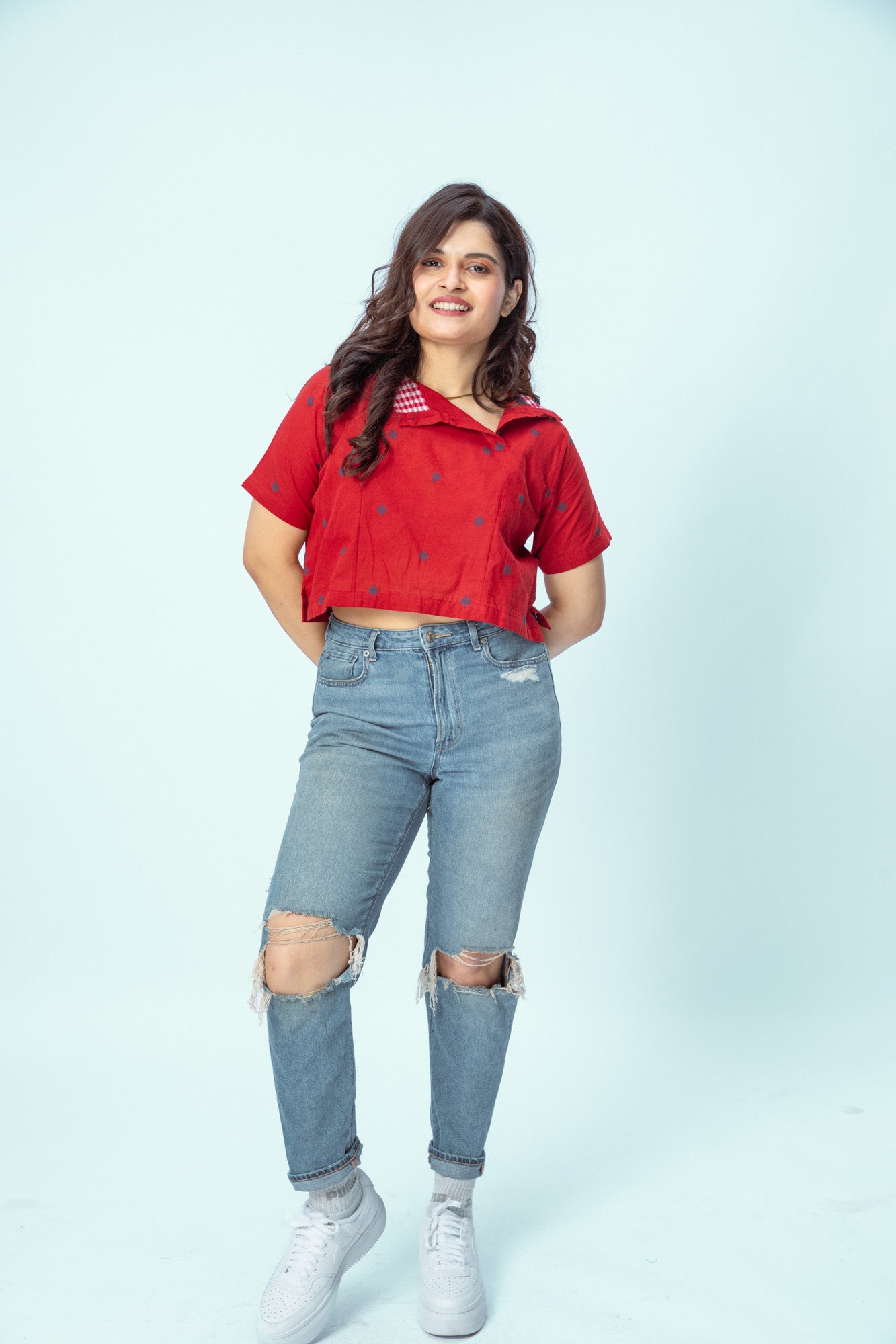 Crafted from two premium cotton fabrics, the True Red Boxi Top combines a vibrant red embroidered cotton fabric with classic 100% cotton gamcha detailing. Its versatile collar can be worn fully buttoned for a polished look or flattened for a relaxed style. With an adjustable length ranging from 18 to 20 inches depending on size, this top offers both comfort and a tailored fit ideal for everyday wear.