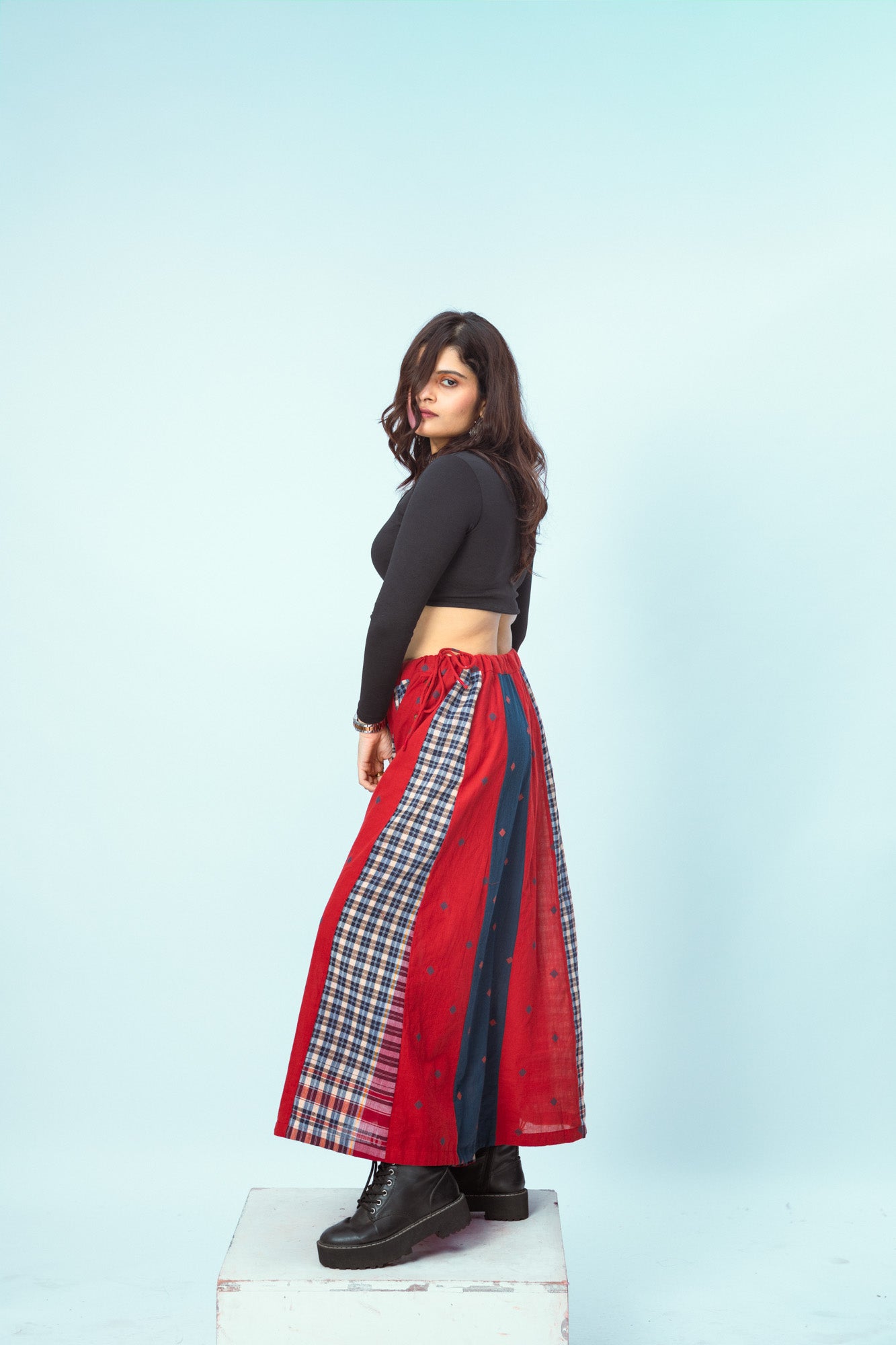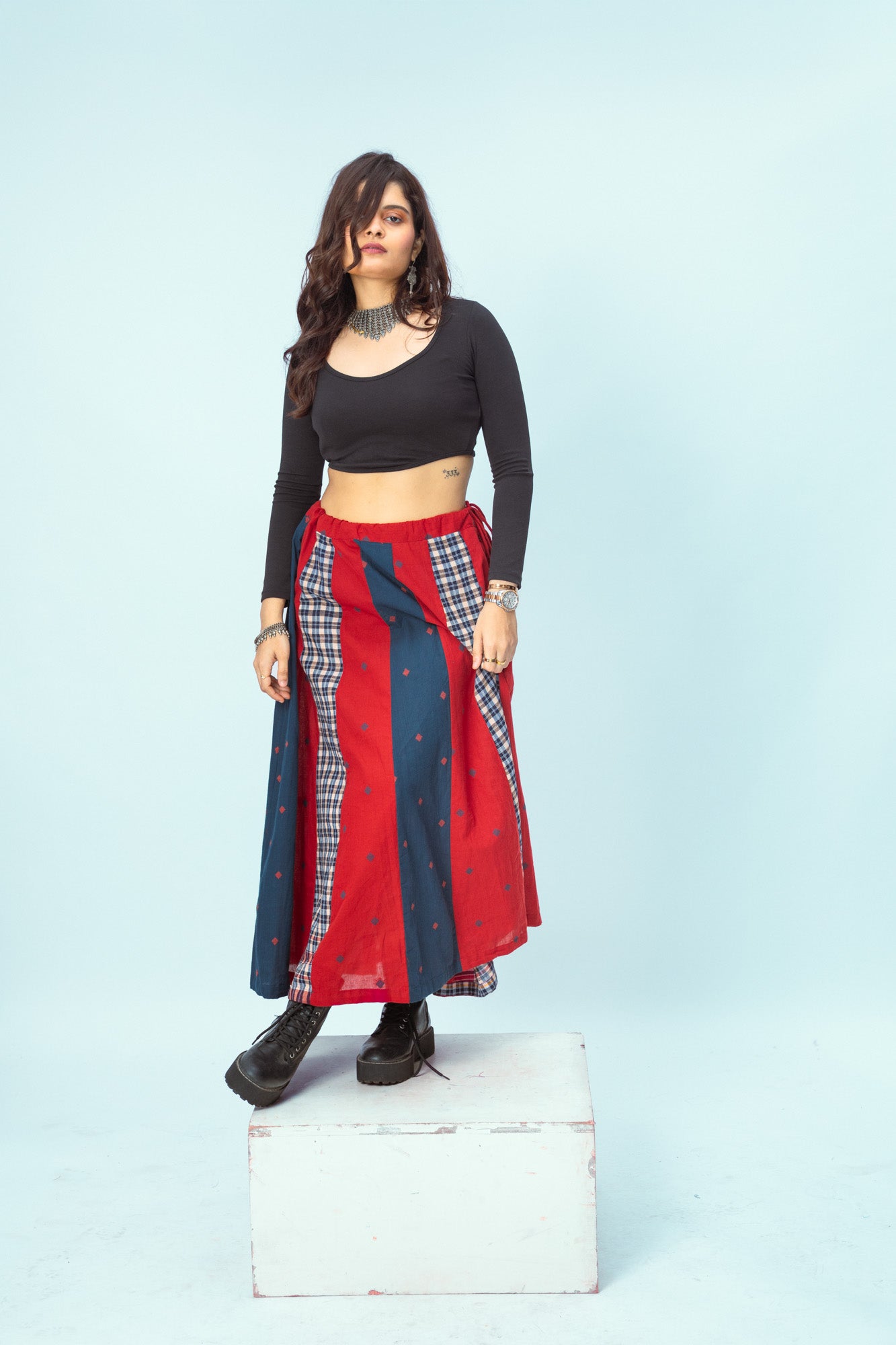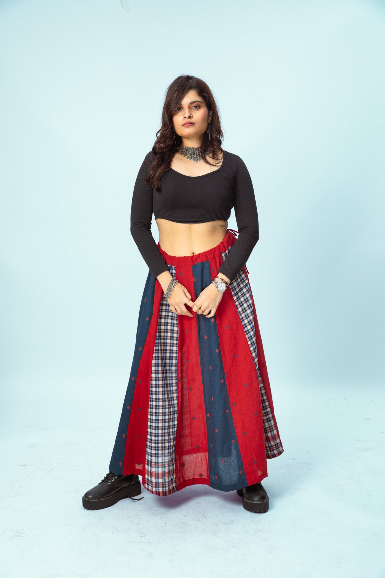 This True Red Brick 16 Panelled Skirt is crafted from 100% cotton using three distinct fabrics, combining texture and depth in its design. Its 16 panels provide a full ghera that holds a graceful flair, supported by a weight that maintains its shape beautifully. The drawstring closure ensures a comfortable, adjustable fit, making it both stylish and practical for everyday wear.