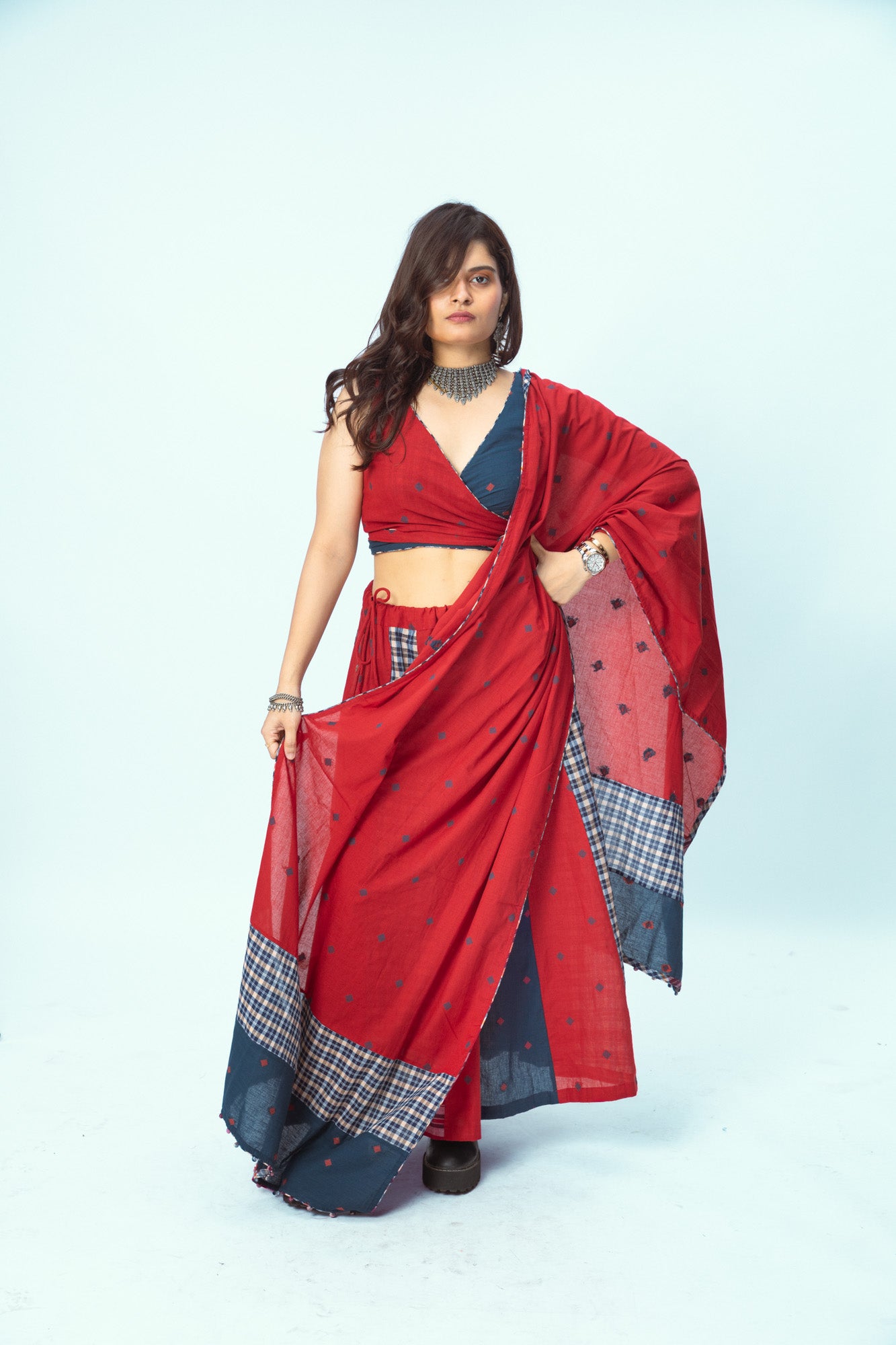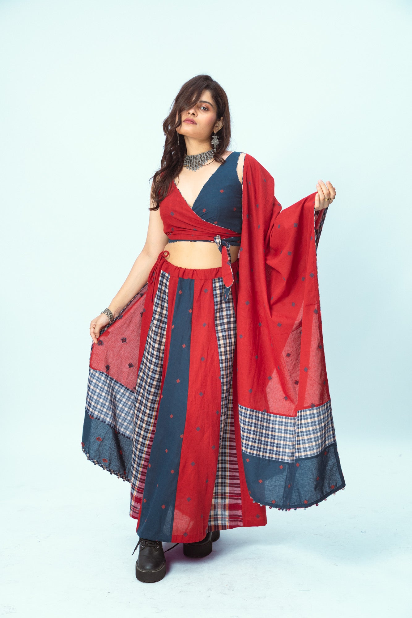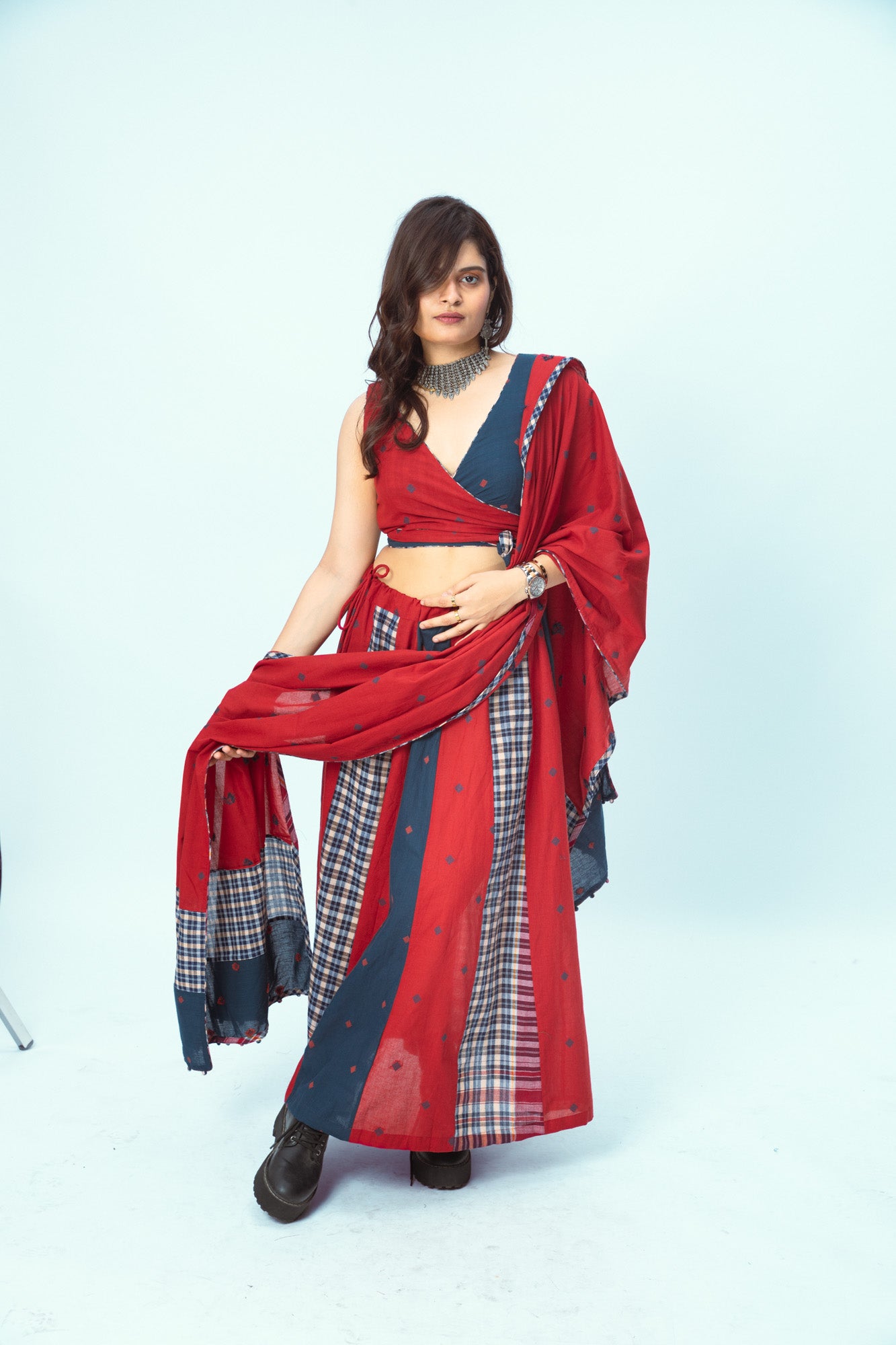 This three-piece set features a true red brick panelled skirt with 16 panels and a flared ghera silhouette, secured with a convenient drawstring closure for a customized fit. The versatile bustier is reversible and adjustable, offering two distinct looks with a stylish wrap-around design. Completing the ensemble is a lightweight and playful dupatta measuring 2.5 meters by 30 inches, adding effortless elegance and movement to your outfit. Perfectly balanced for both comfort and style, this set delivers a refined and adaptable wardrobe choice.