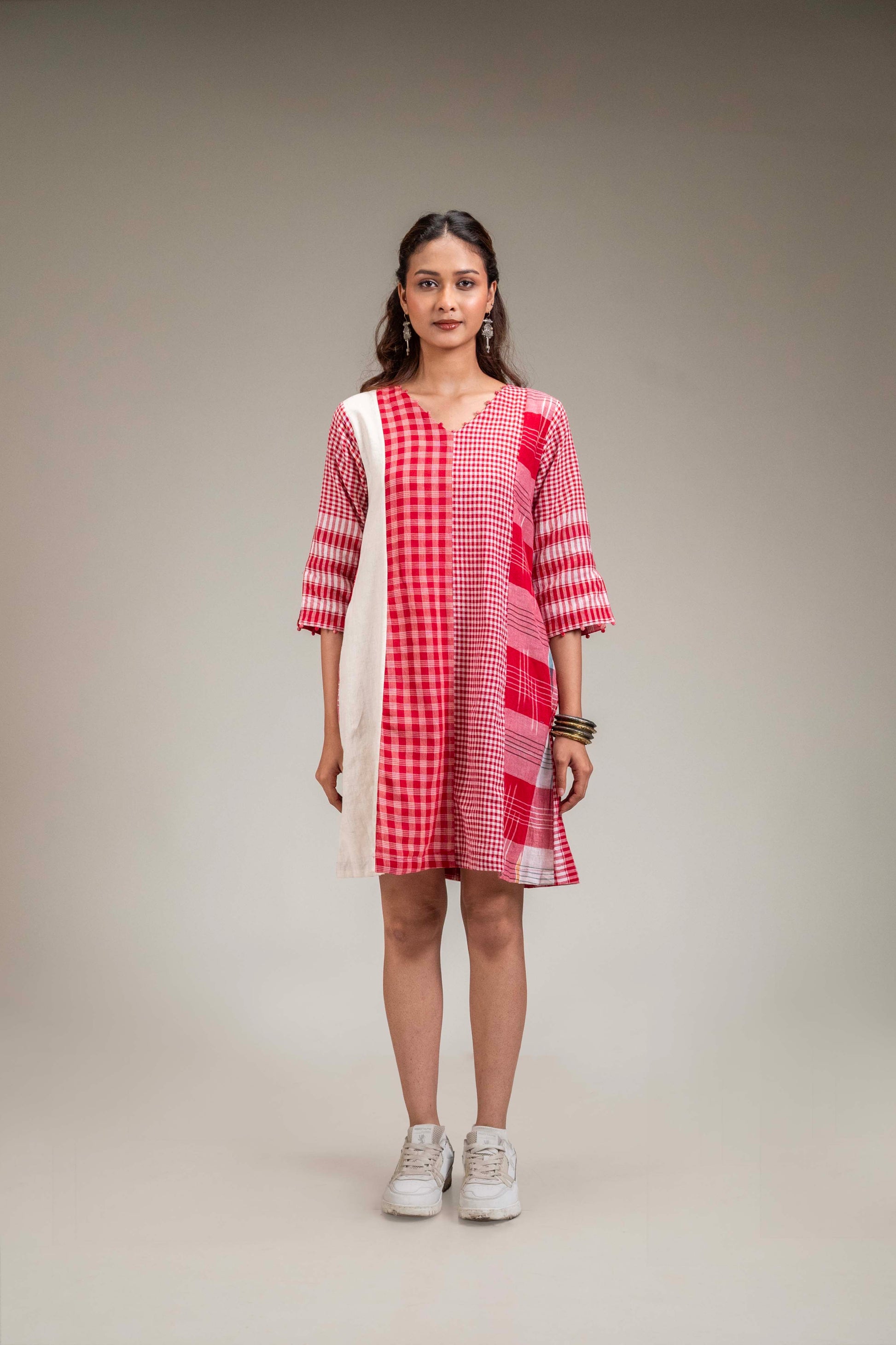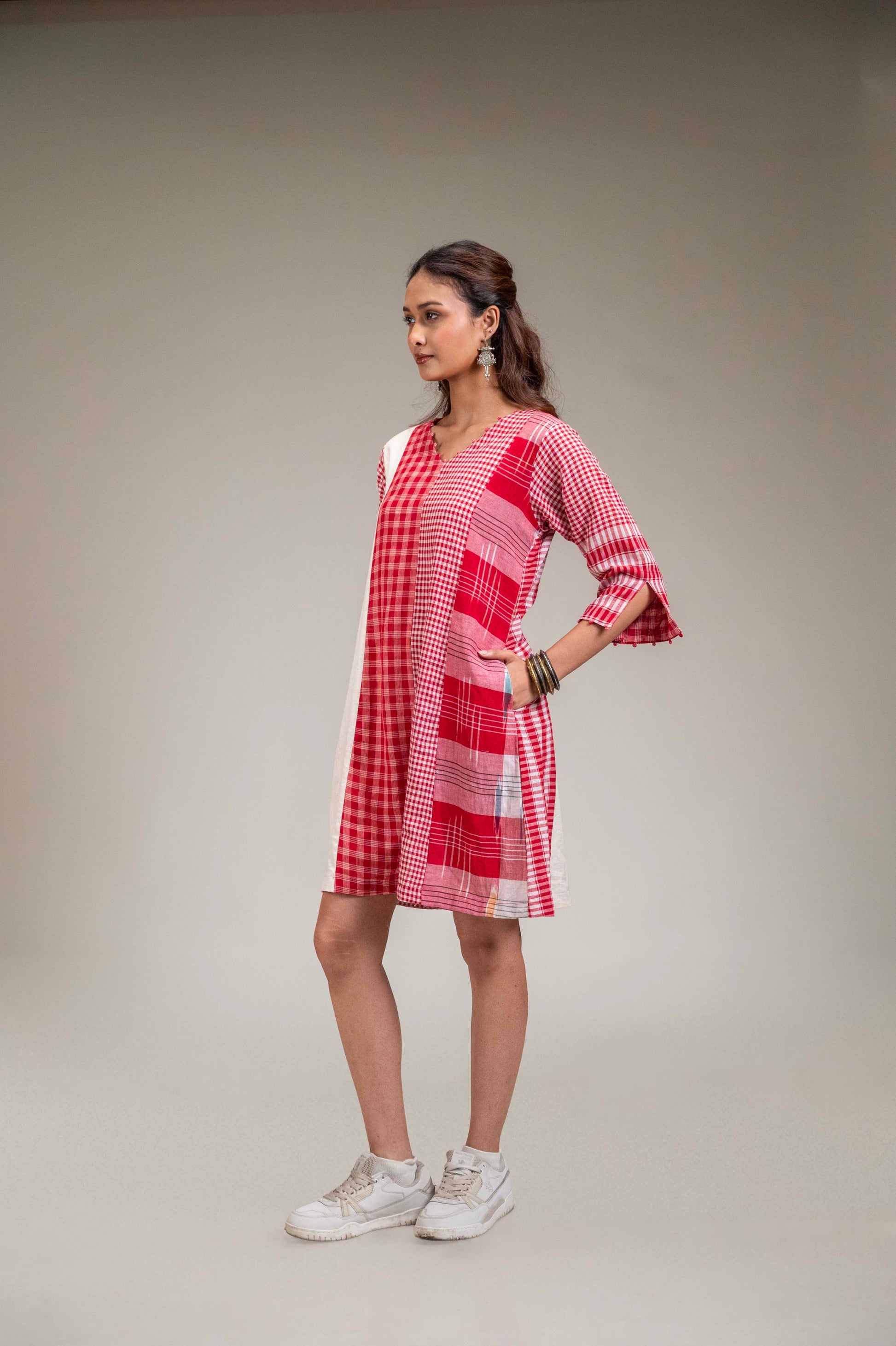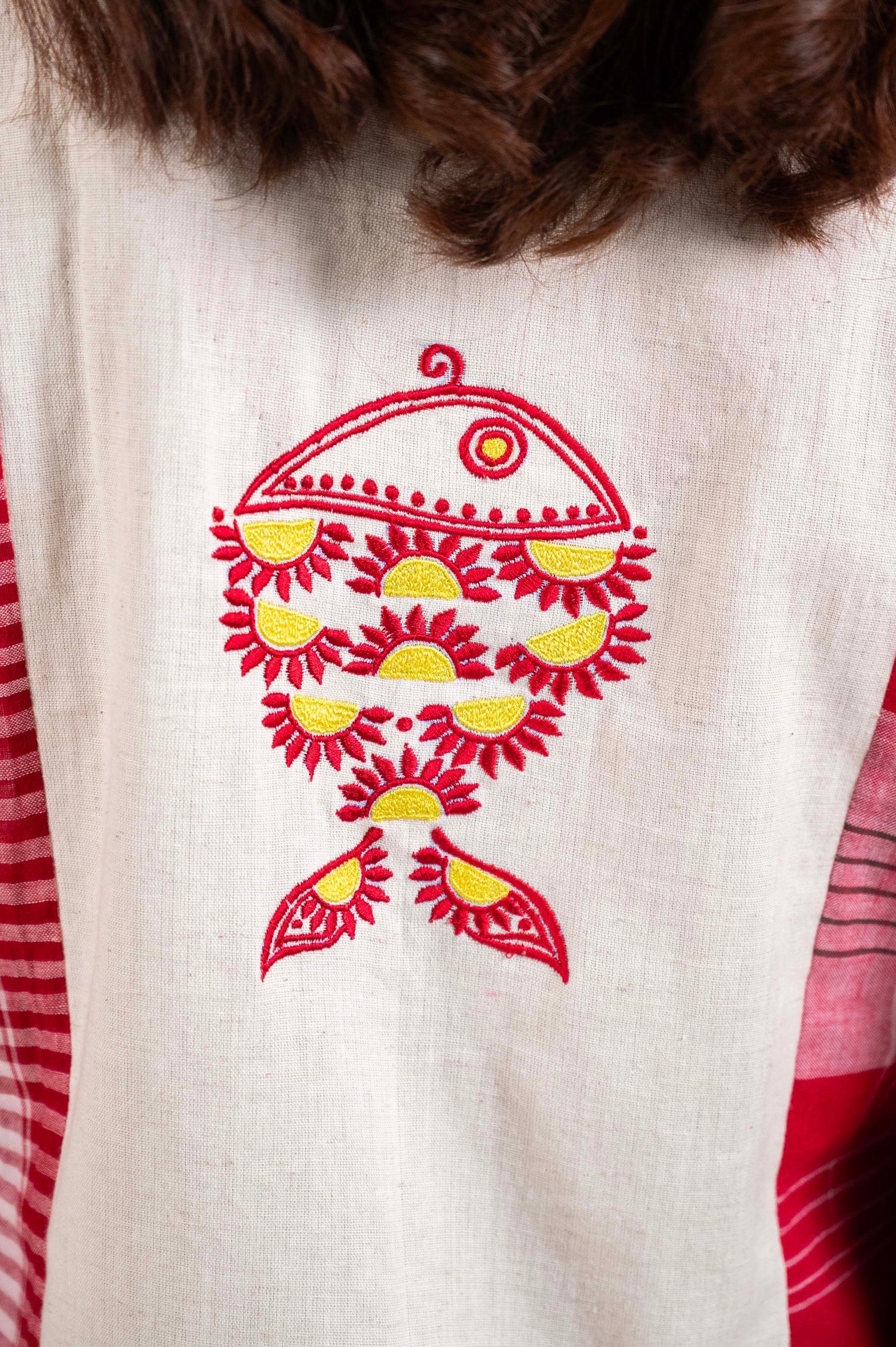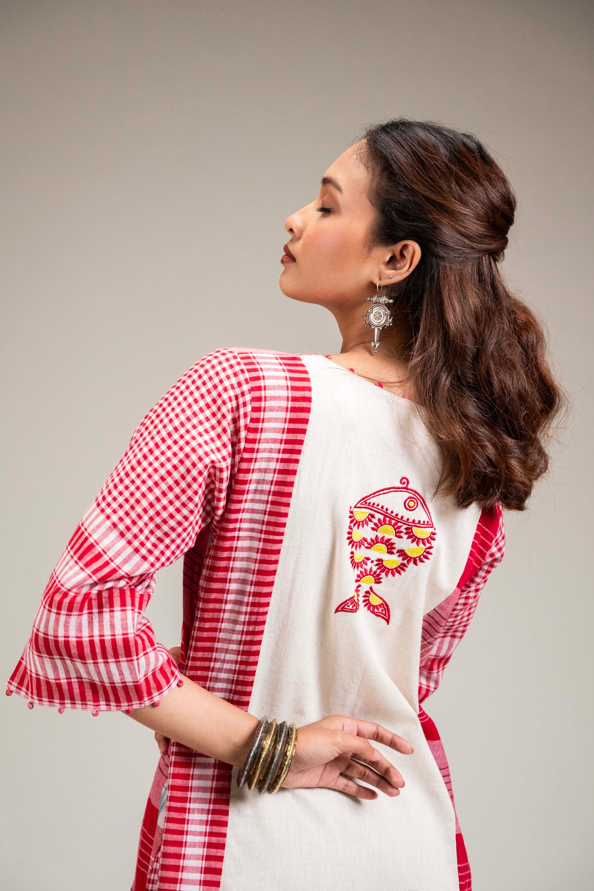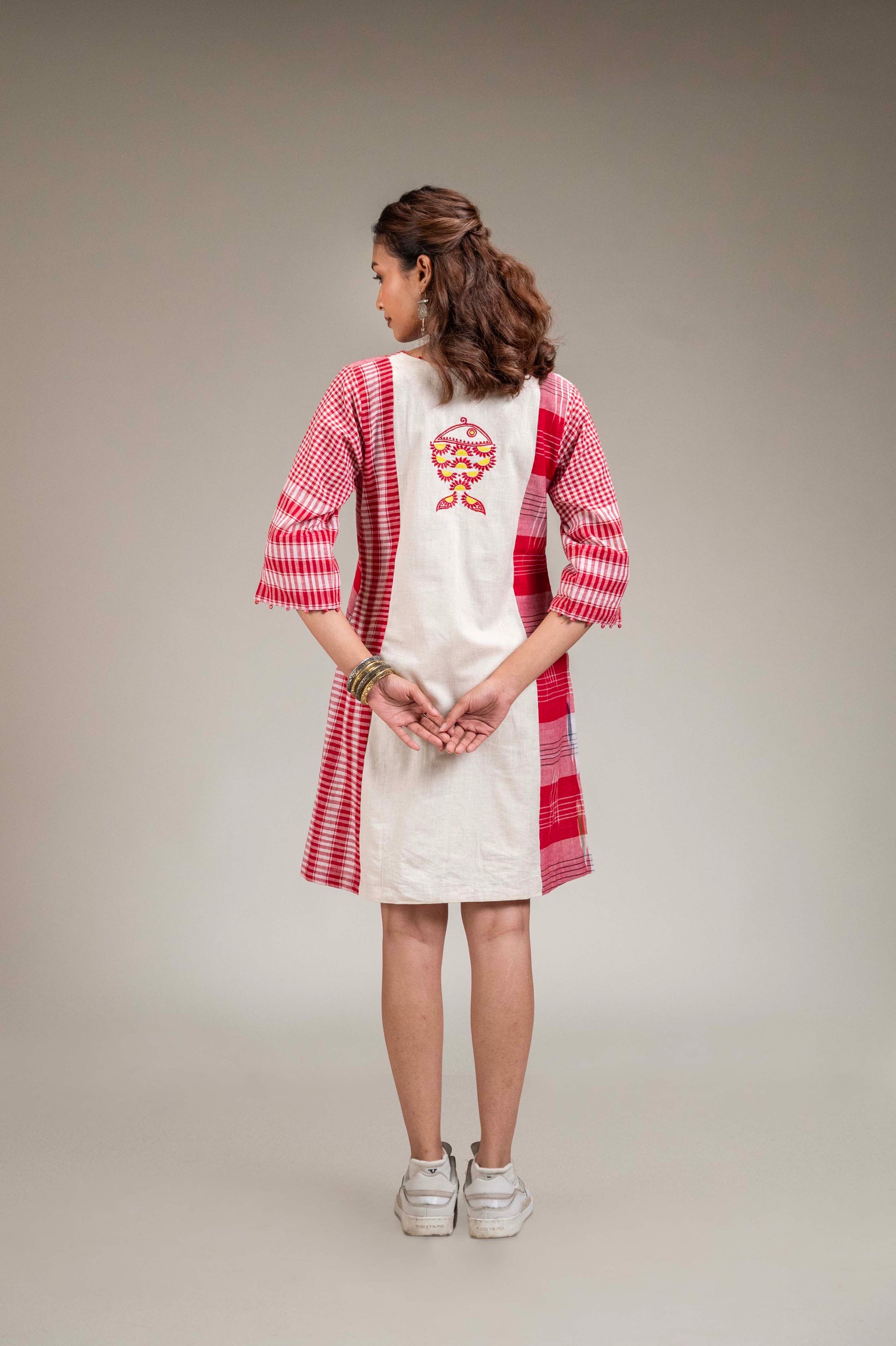 The Ushma Dress is a one-of-a-kind, panelled piece crafted from a thoughtful blend of Gamcha and Khadi cotton on both the front and back. Designed with comfort and versatility in mind, it features a flattering V-neckline, functional side pockets, and intricate fish embroidery at the back for a unique touch.