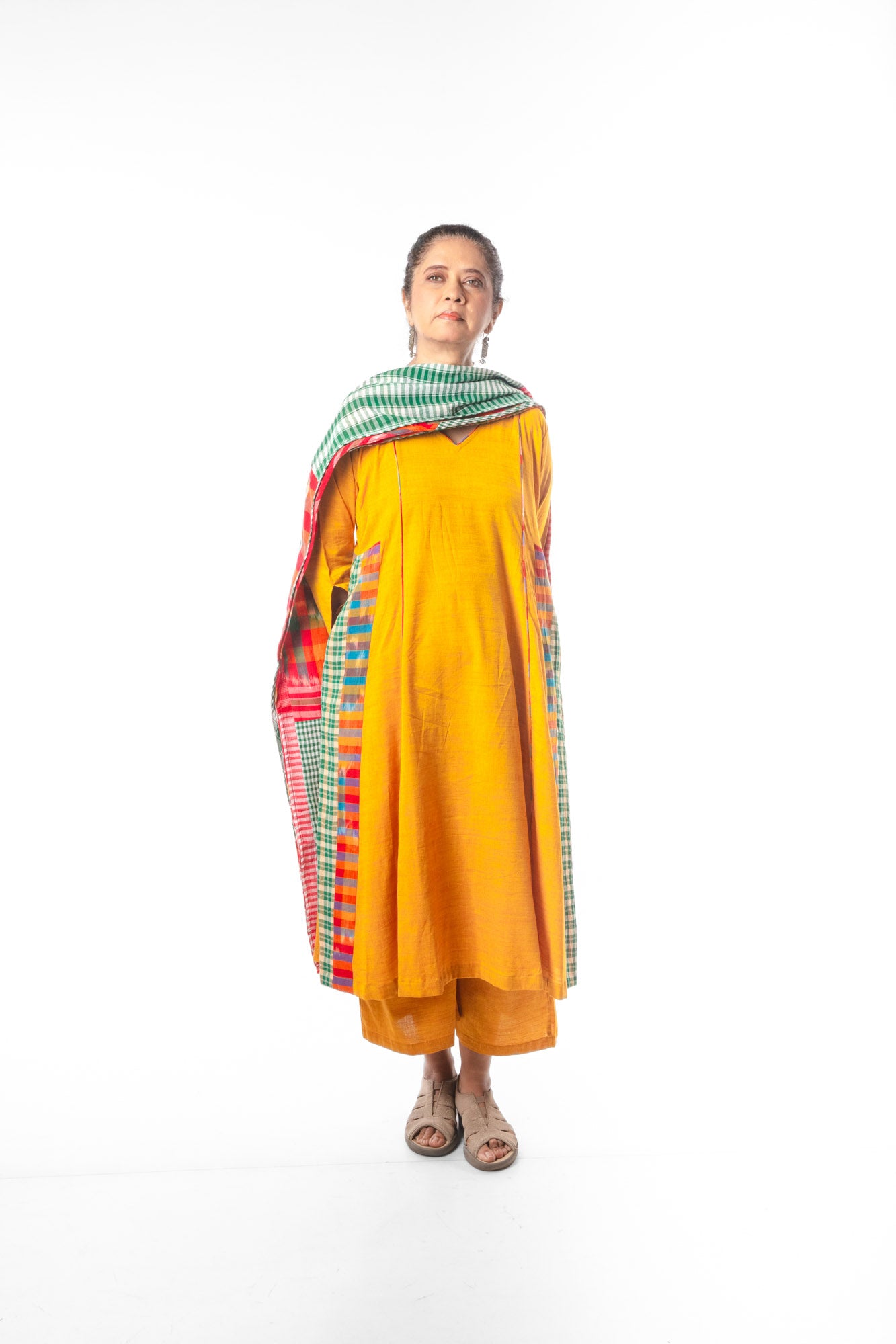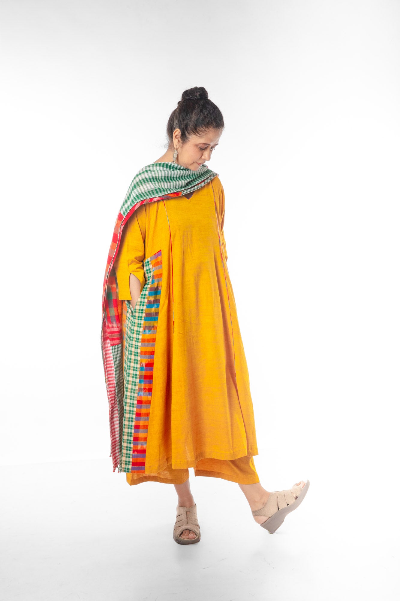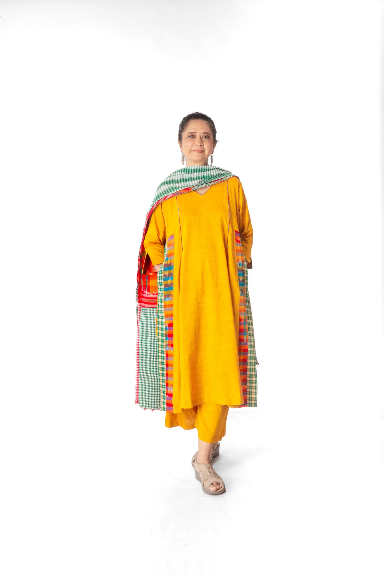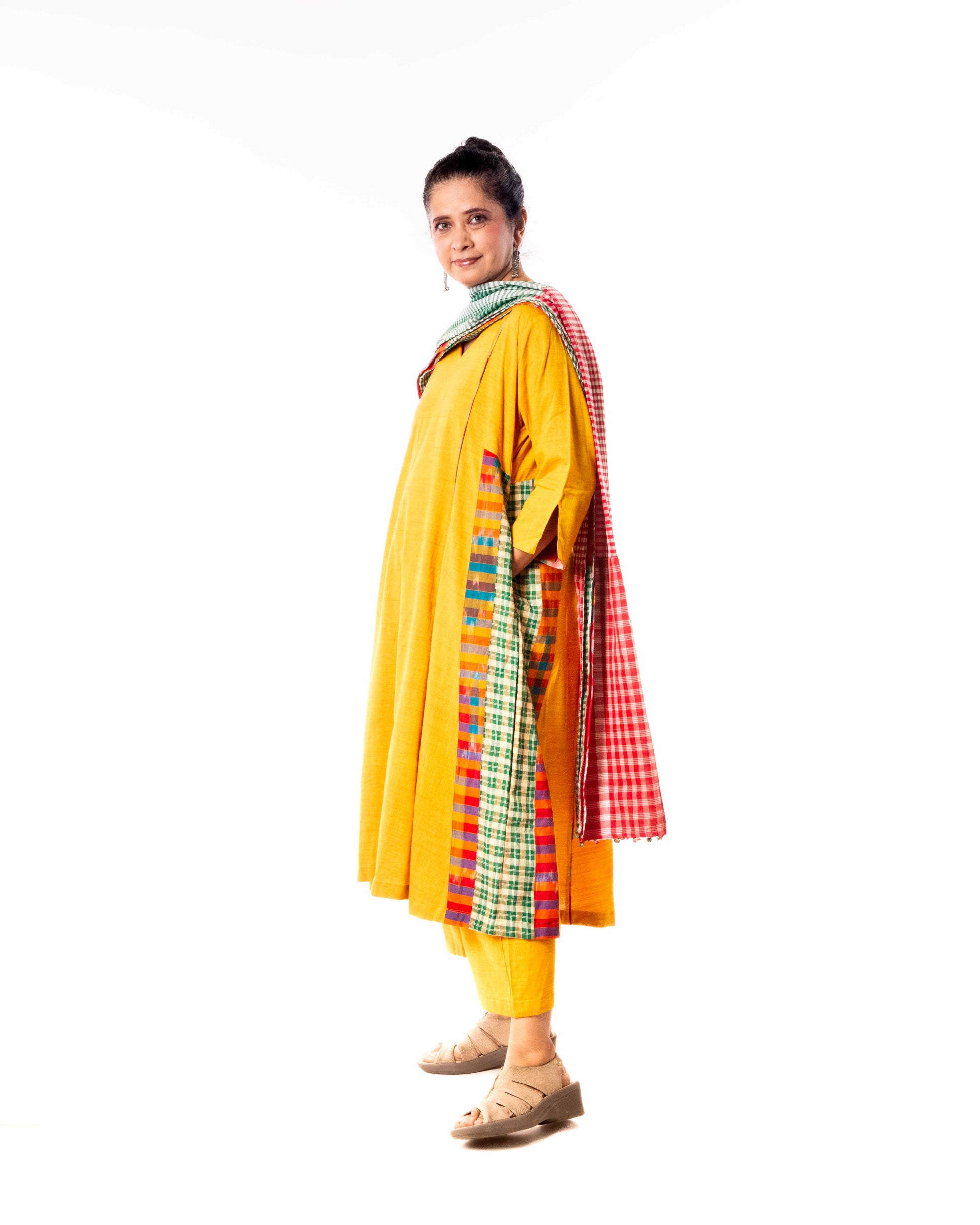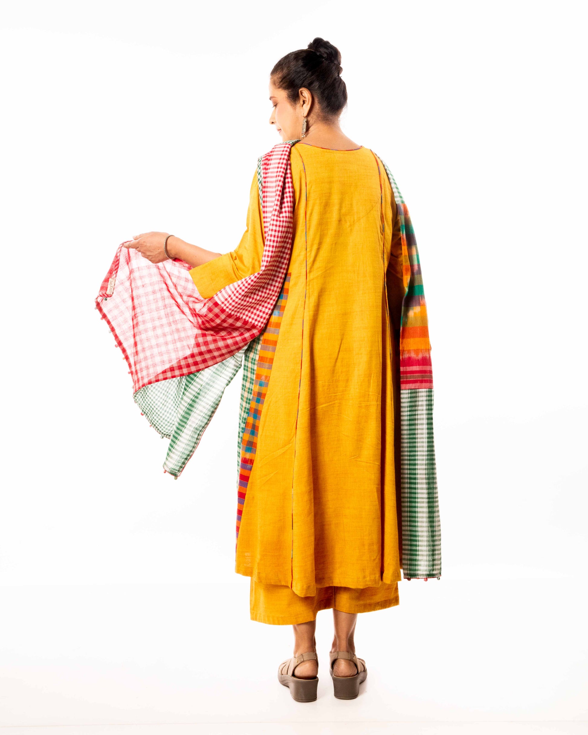 The Yellow Cinder Isle Set includes a versatile kurta that doubles as a stylish dress, paired with a colorblocked dupatta for a contemporary edge. The palazzo features an elastic waistband with a drawstring for a customizable fit, complemented by two convenient pockets. This three-piece ensemble blends comfort and modern design, making it ideal for both casual and semi-formal occasions. The dress also comes with pockets.