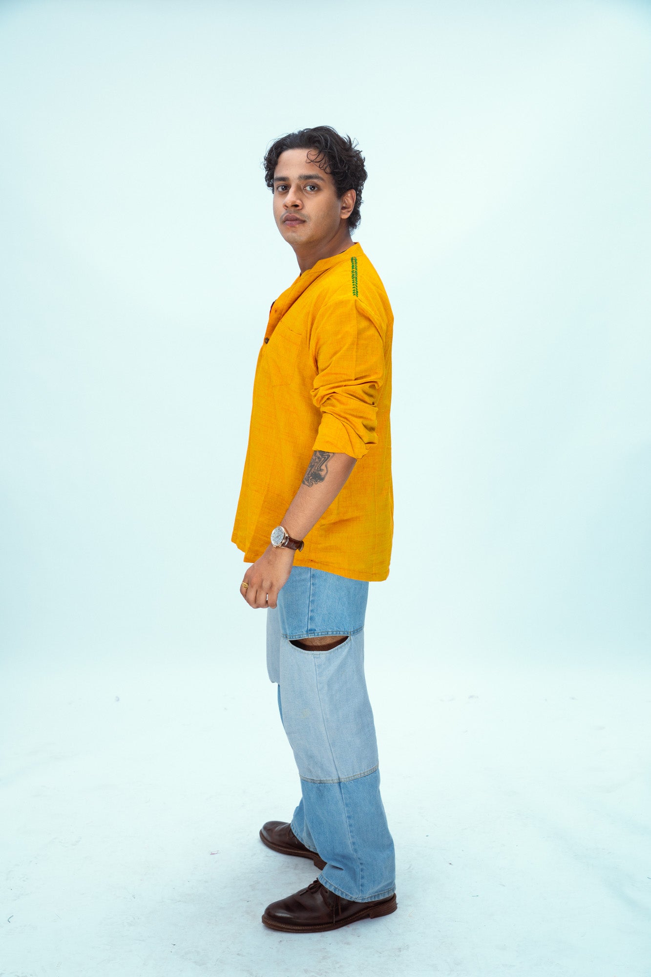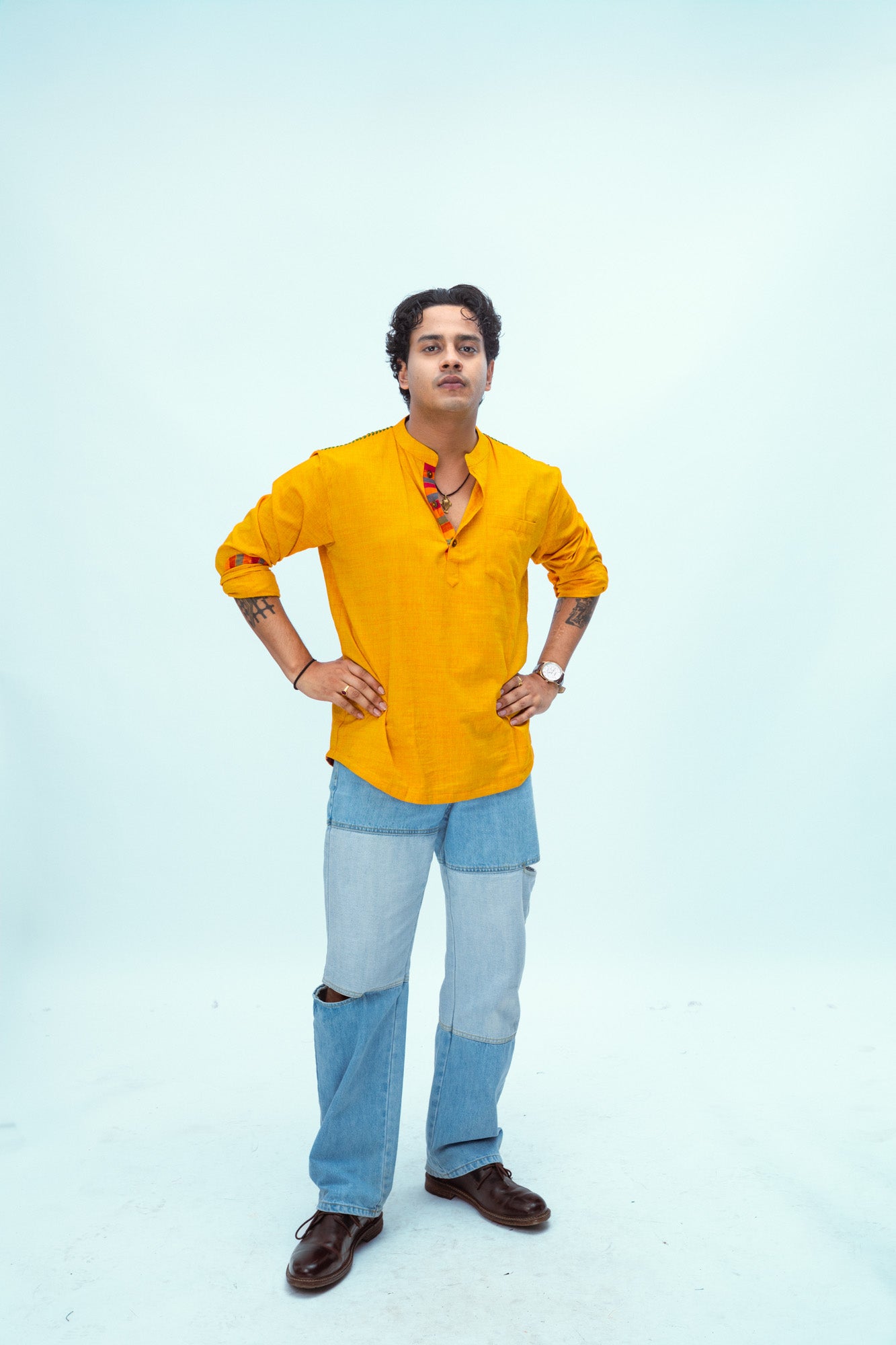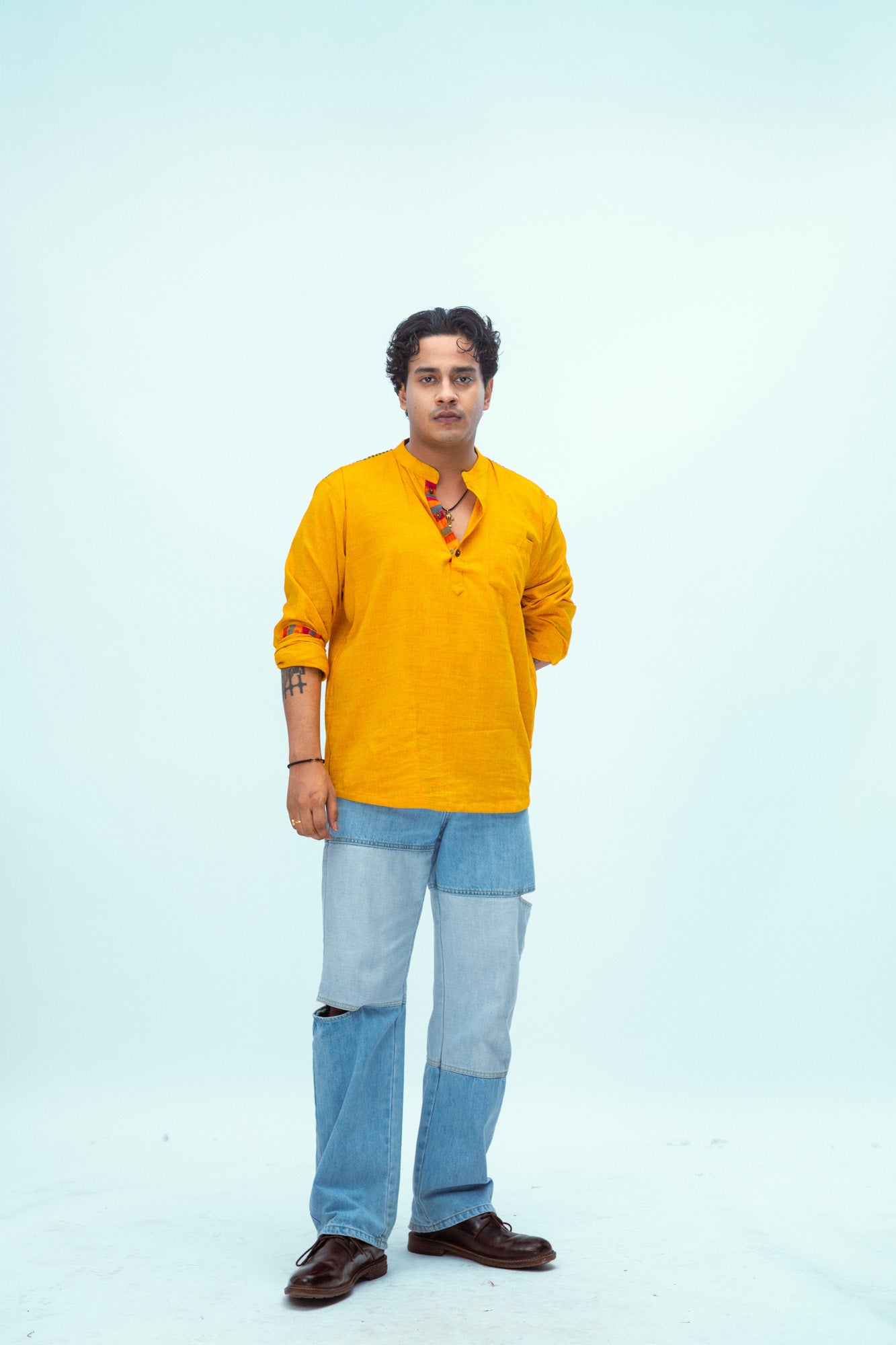 Crafted from 100% cotton, this yellow kurta features full sleeves and delicate embroidery on the shoulder, enhanced with contrasting fabric detailing. The natural breathable fabric ensures comfort, while the thoughtful accents add a refined touch, making it a perfect choice for both casual and festive occasions.