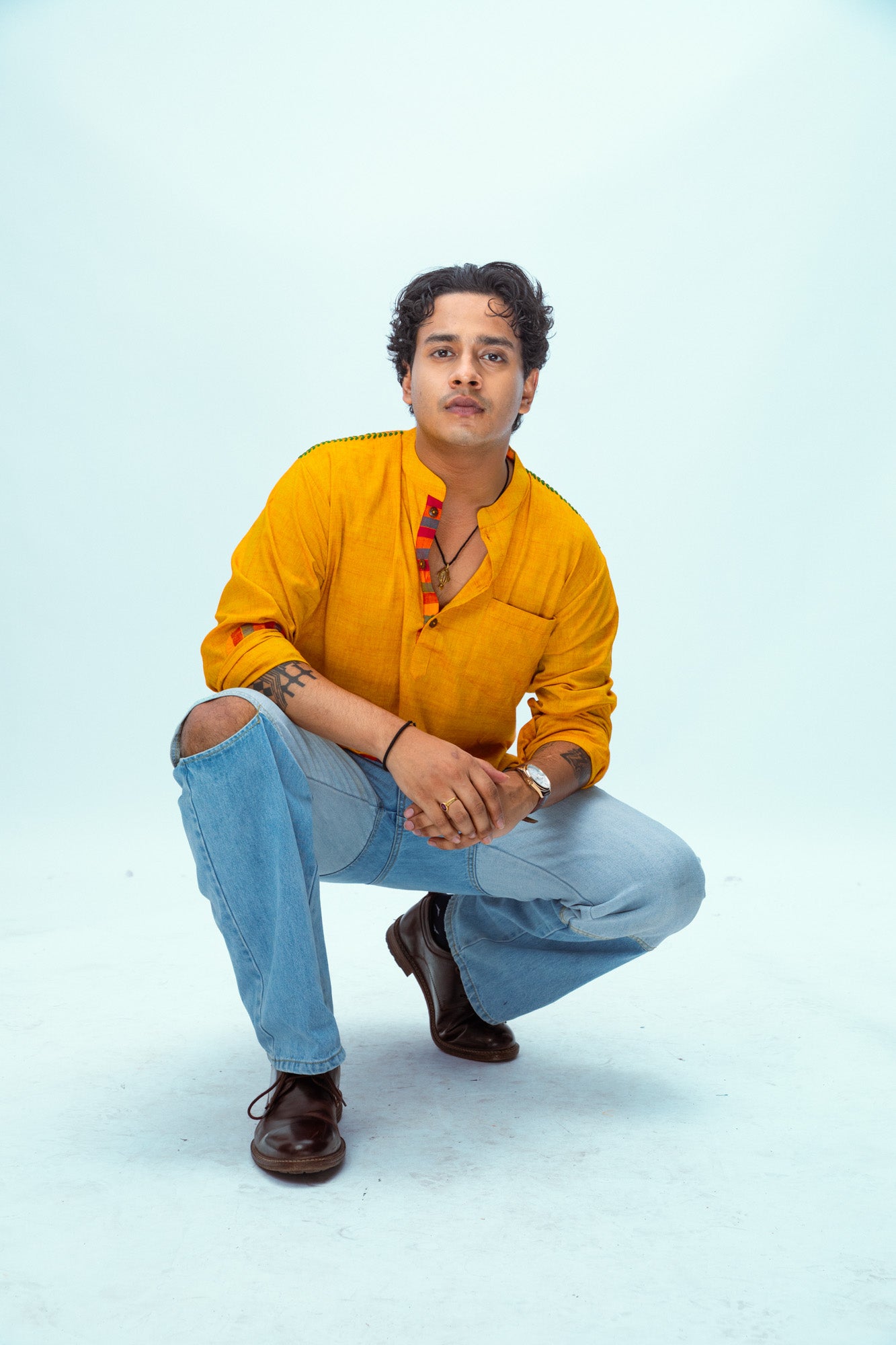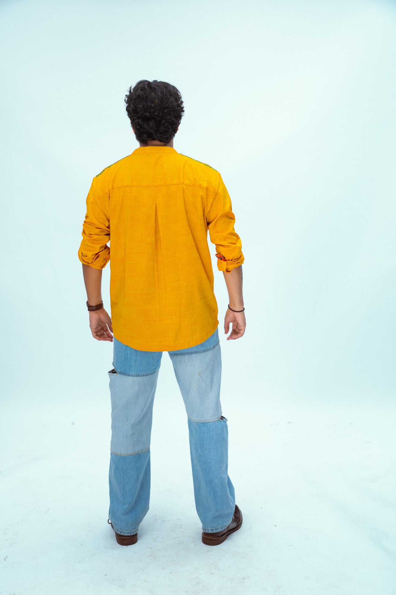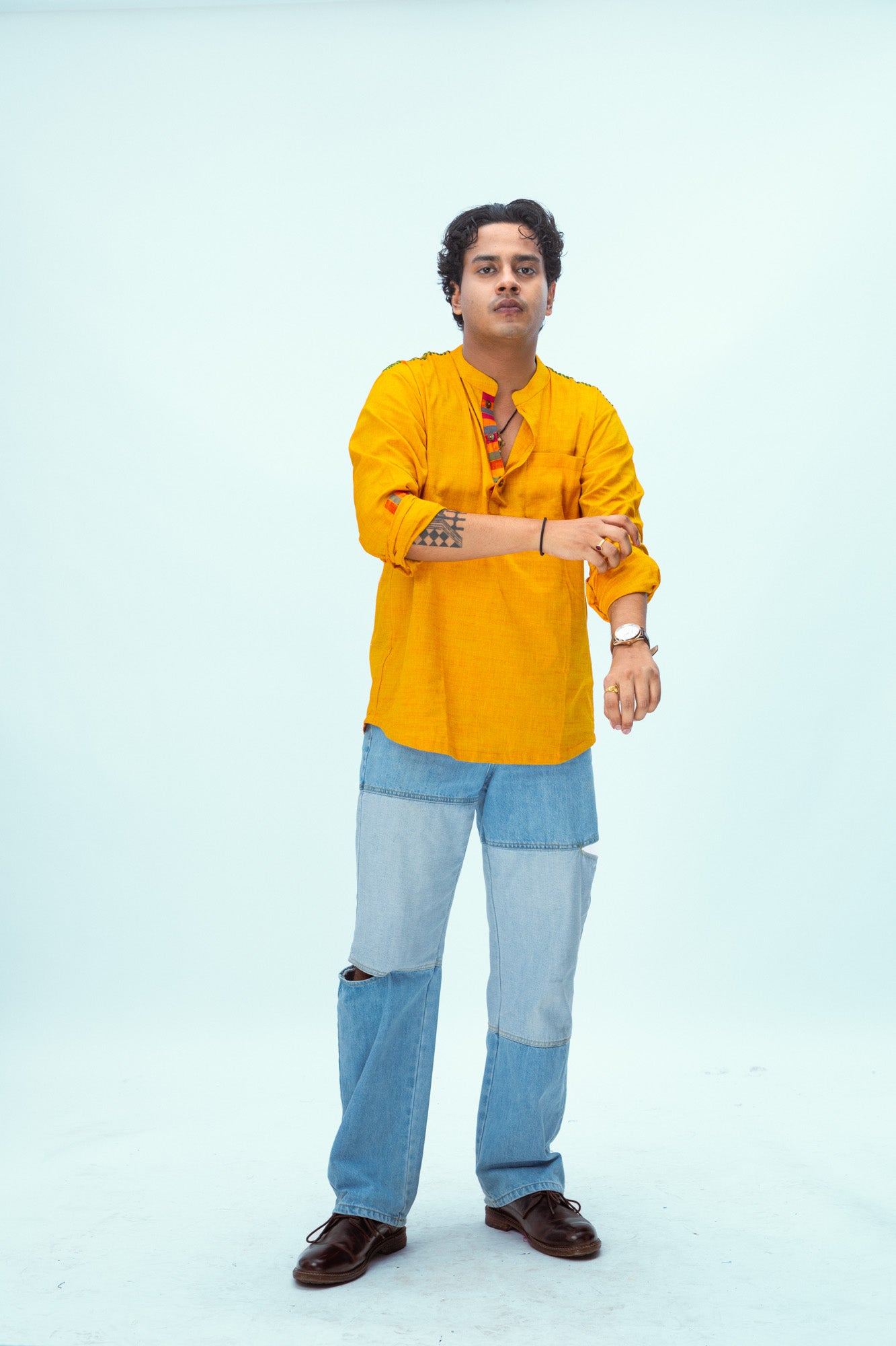 Crafted from 100% cotton, this yellow kurta features full sleeves and delicate embroidery on the shoulder, enhanced with contrasting fabric detailing. The natural breathable fabric ensures comfort, while the thoughtful accents add a refined touch, making it a perfect choice for both casual and festive occasions.