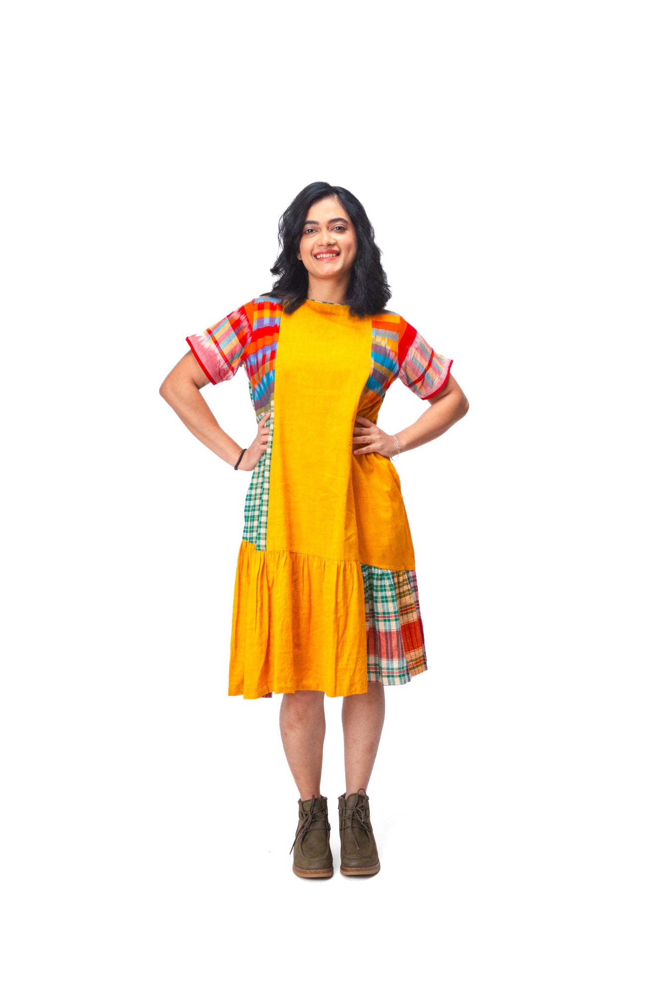 The Yellow Shadow Lined Dress features a flattering 38-inch length and half sleeves, crafted from 100% cotton for breathable comfort. Its tiered design enhances the silhouette to suit all body shapes gracefully. Practical pockets add functionality, while a delicate frill at the hem provides a subtle, elegant finish. Ideal for those seeking style alongside ease and comfort.